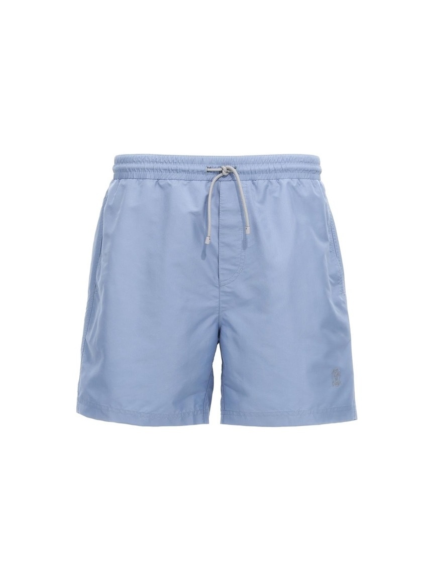 Плавки-шорты длиной чуть выше колена сшили из прочного нейлона с атласным блеском: тонкий материал быстро сохнет и не теряет яркость красок. Принадлежность модели с эластичным регулируемым поясом-кулиской марке подчеркивает эмблема, вышитая белой нитью на левой брючине.
