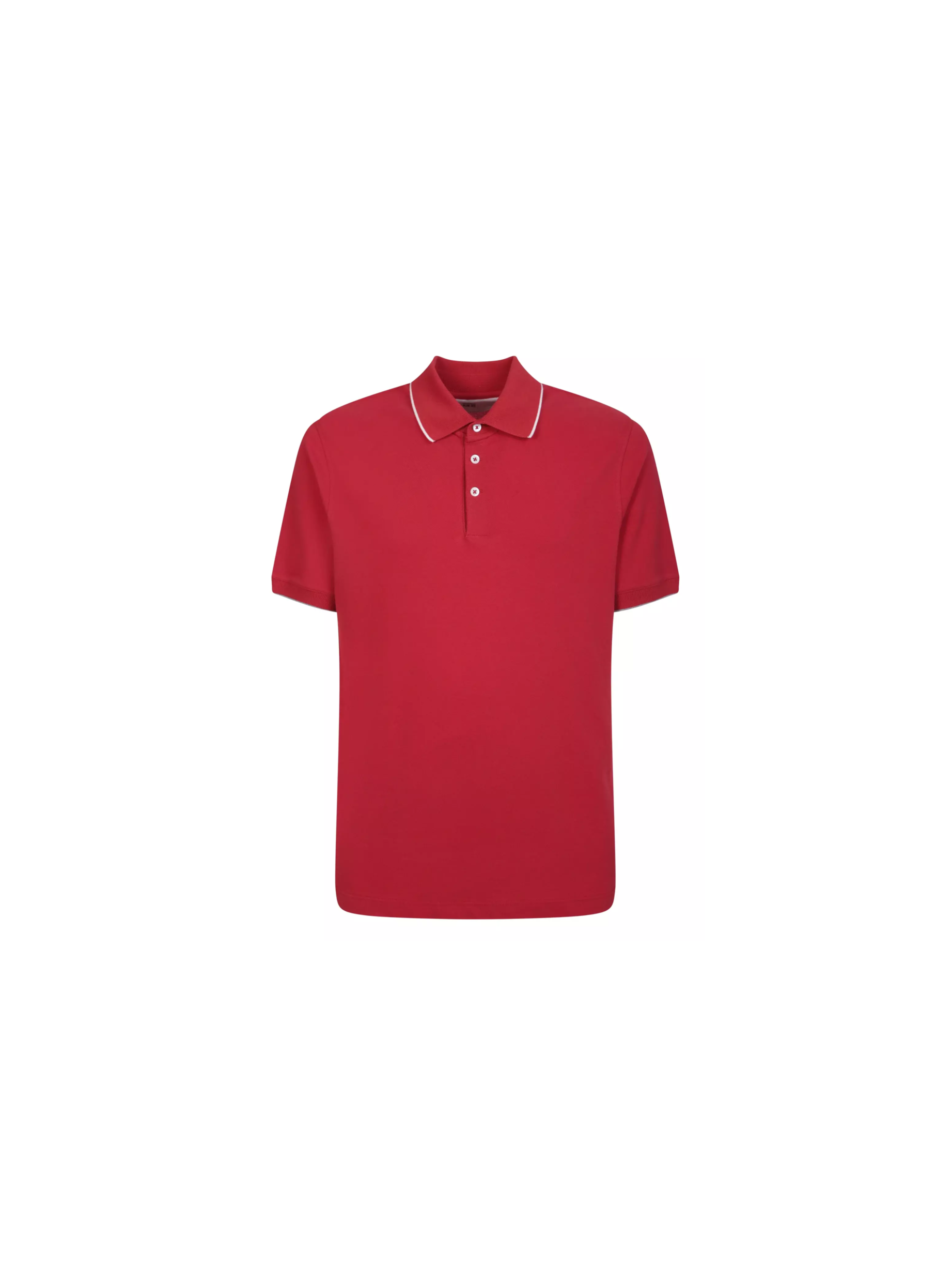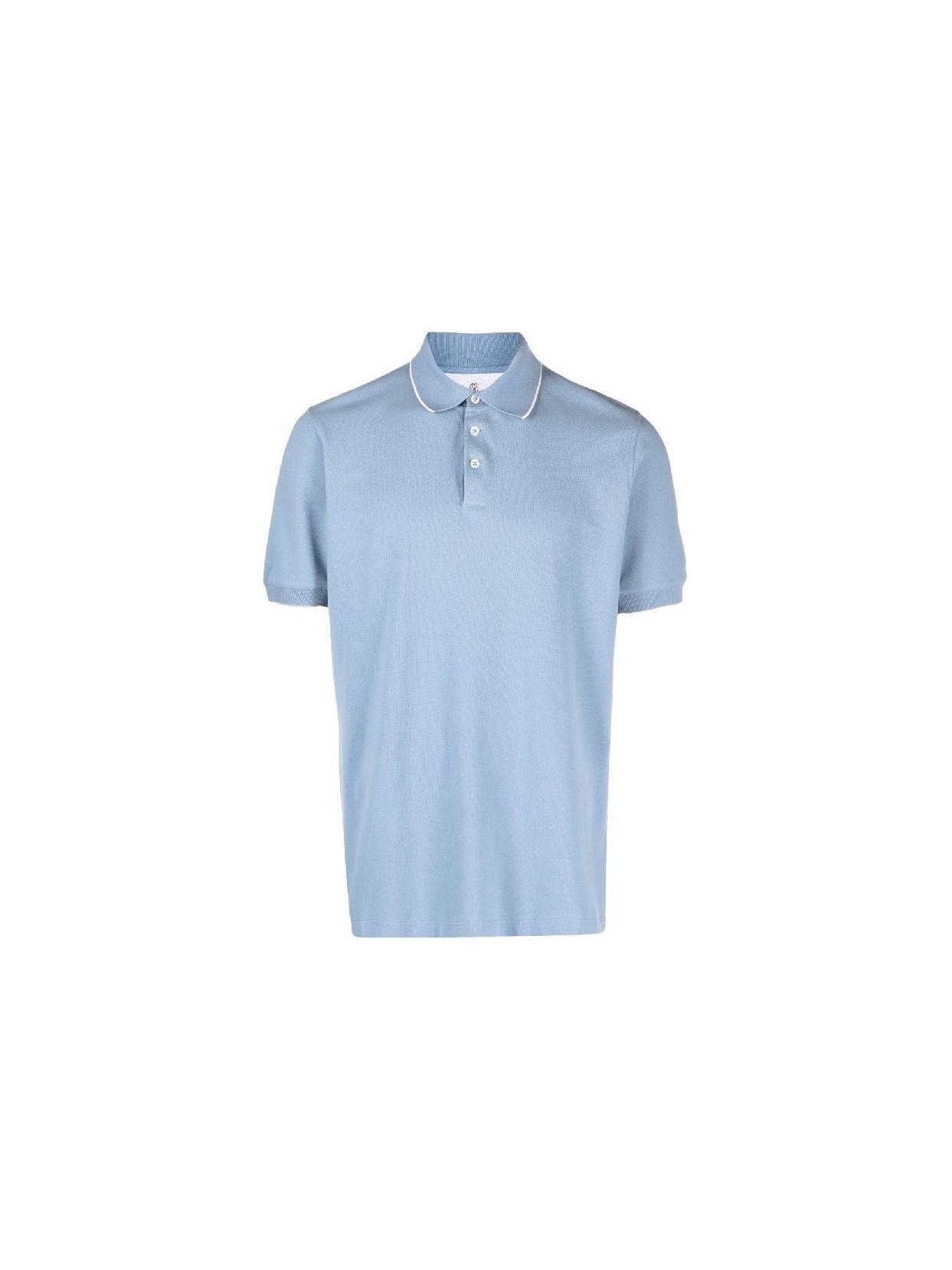 Поло из чистого хлопка дополнено с короткой застежкой на пуговицы и украшено контрастным кантом на воротнике.