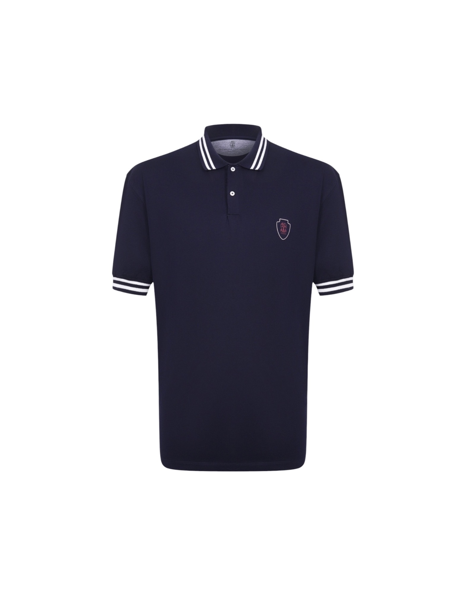 Поло с небольшими боковыми разрезами выполнили из хлопкового трикотажа. Воротник и манжеты подчеркнули полосами, а на груди разместили фирменную геральдическую эмблему Solomeo с рельефным кантом.