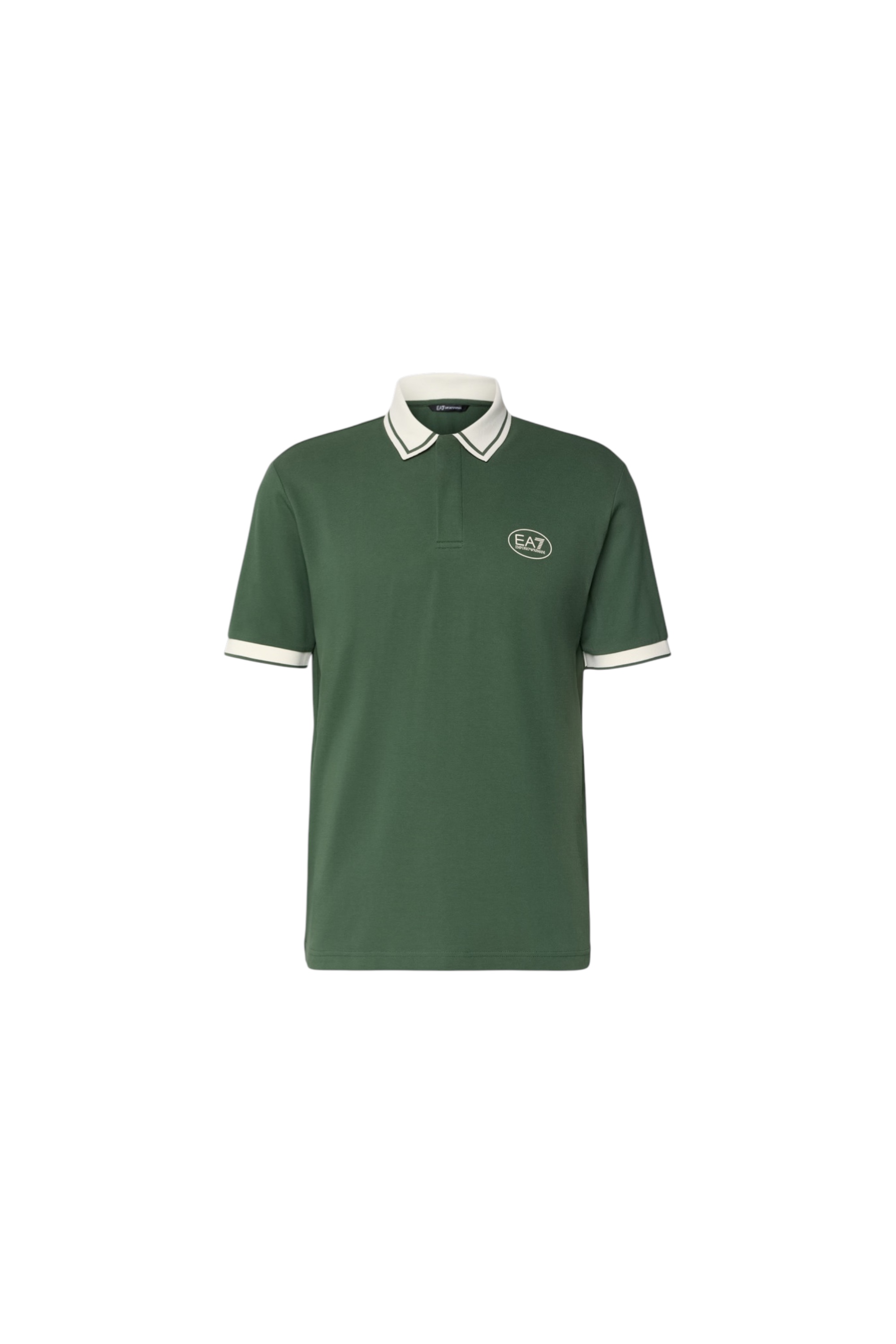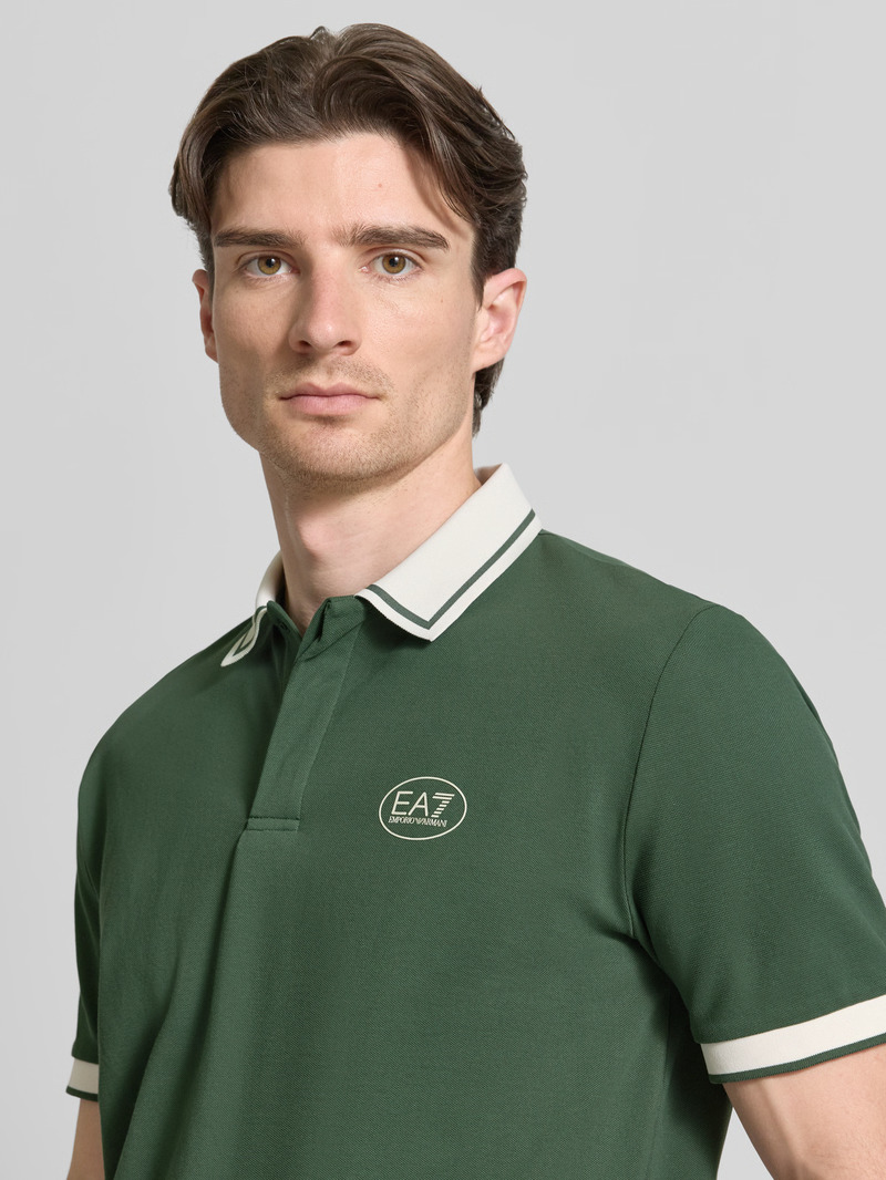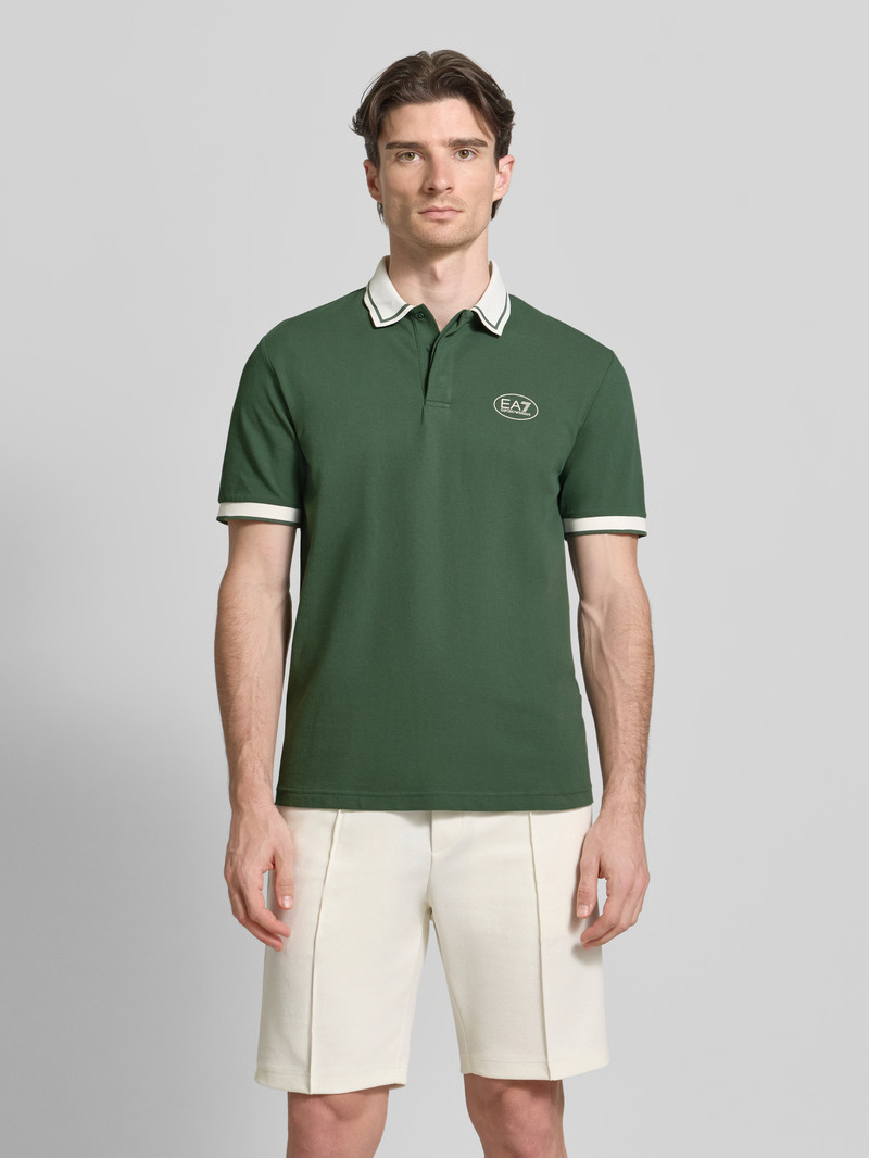 Поло из эластичного хлопка с короткой застежкой на пуговицы дополнено контрастным воротником и манжетами на рукавах.