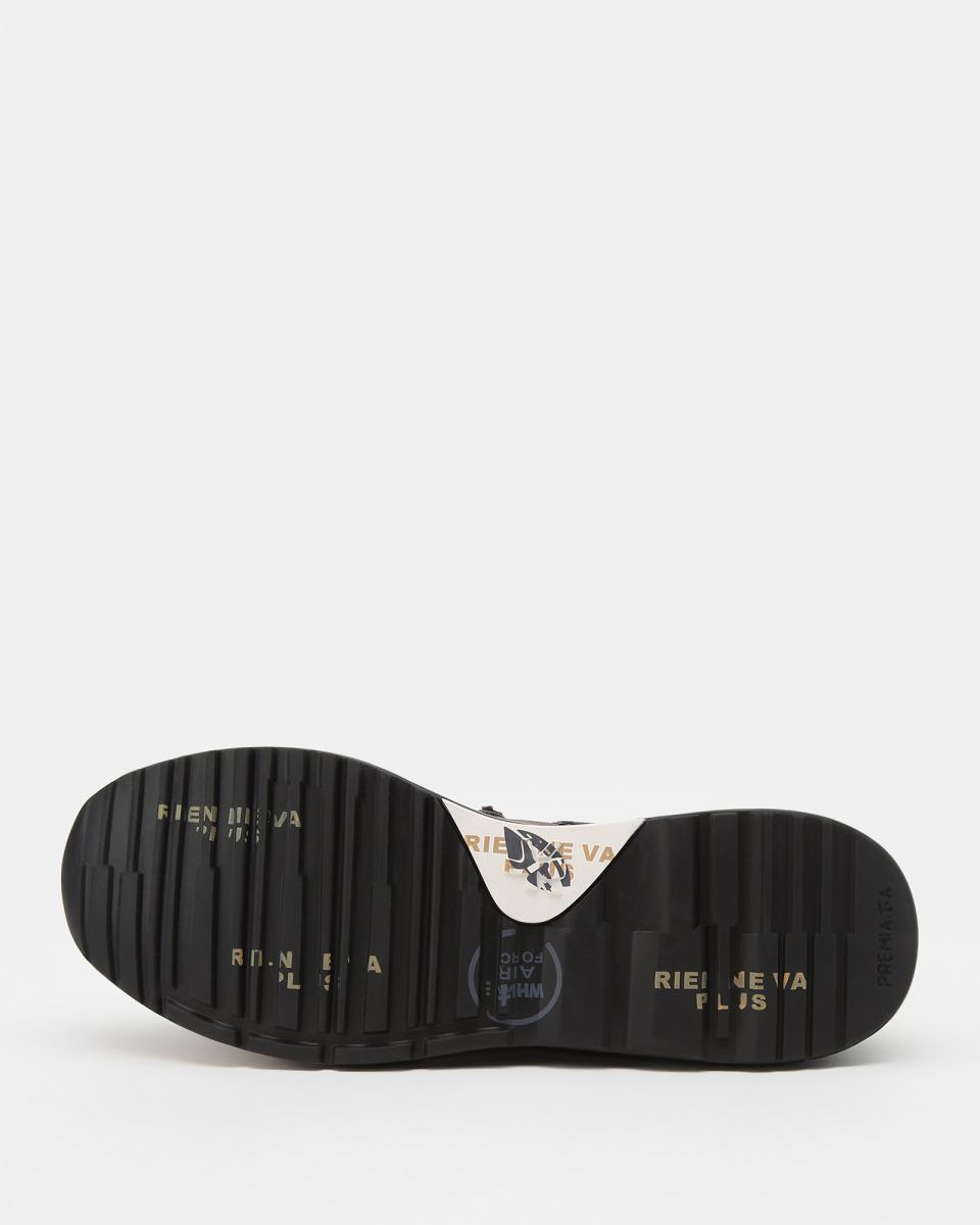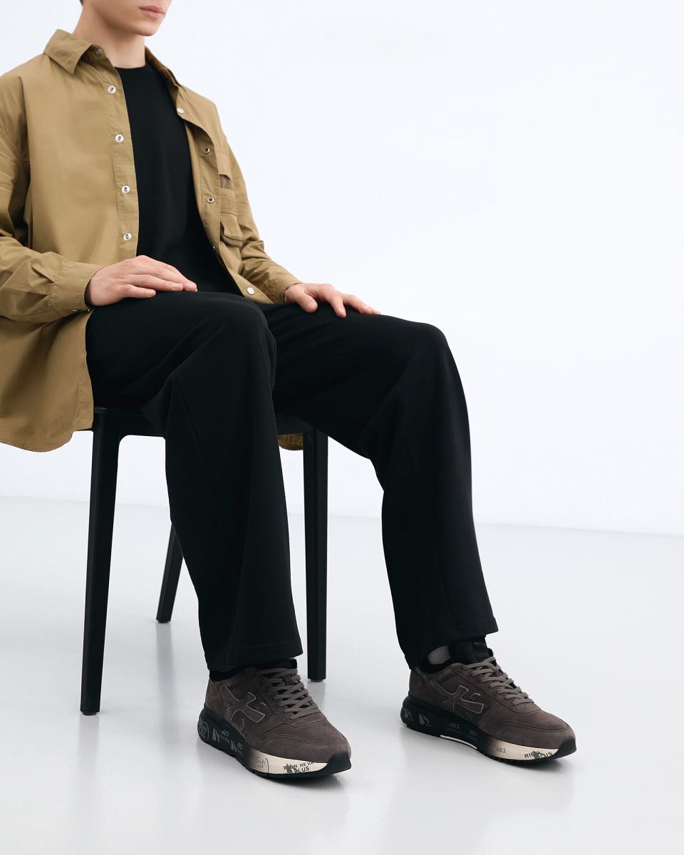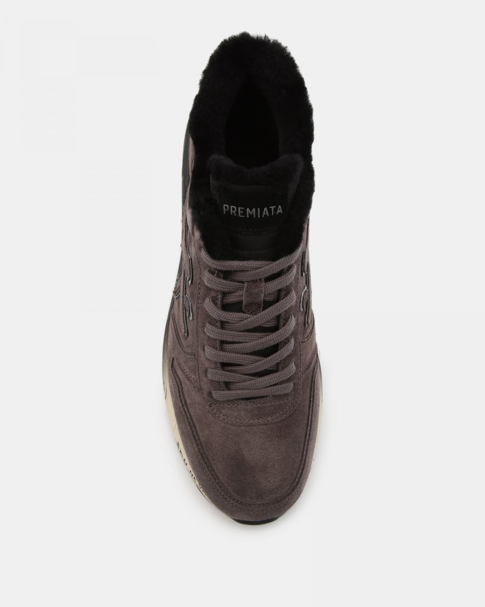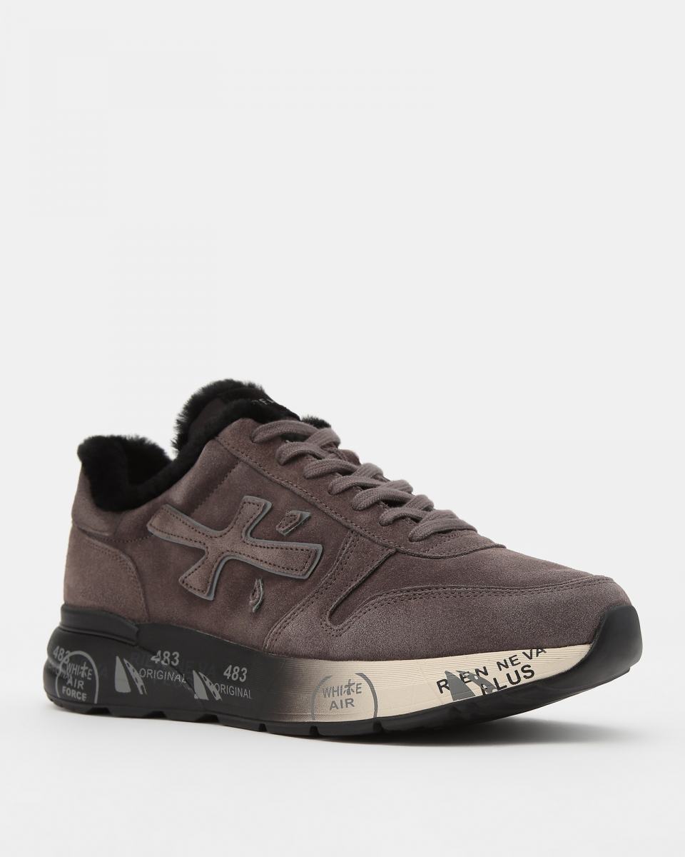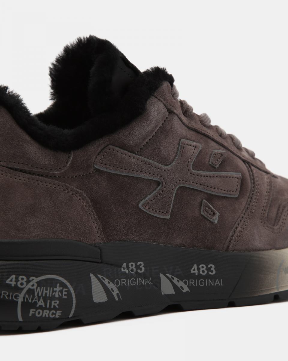 Кроссовки Mick с фирменными печатями и штампами на подошве из бархатистой замши с внутренней отделкой из овчины дополнили брендированной нашивкой на язычке и знаковыми иероглифами по бокам и сзади.