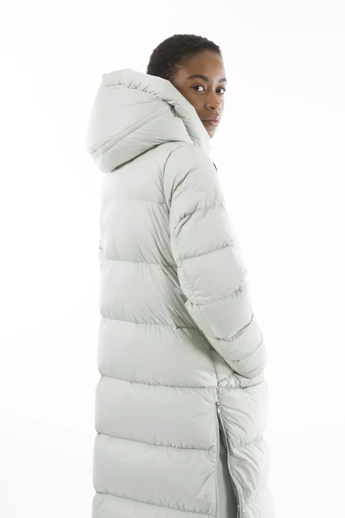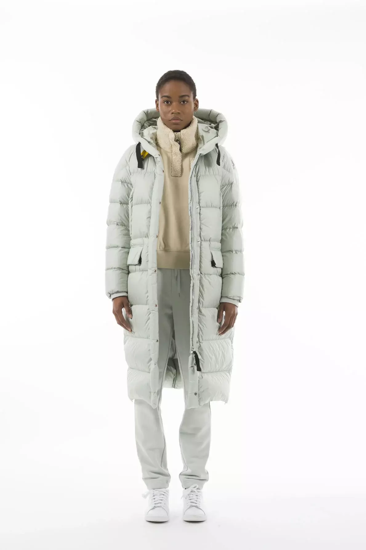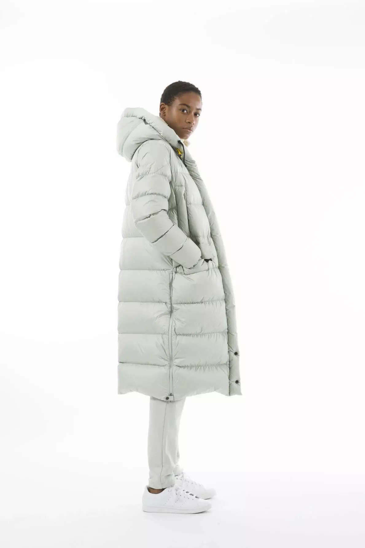 Исключительная мягкость и макси-длина: Mummy — это пуховое пальто, выполненное из ткани с добавлением серебряной фольги, которая создает на его поверхности особый блеск.