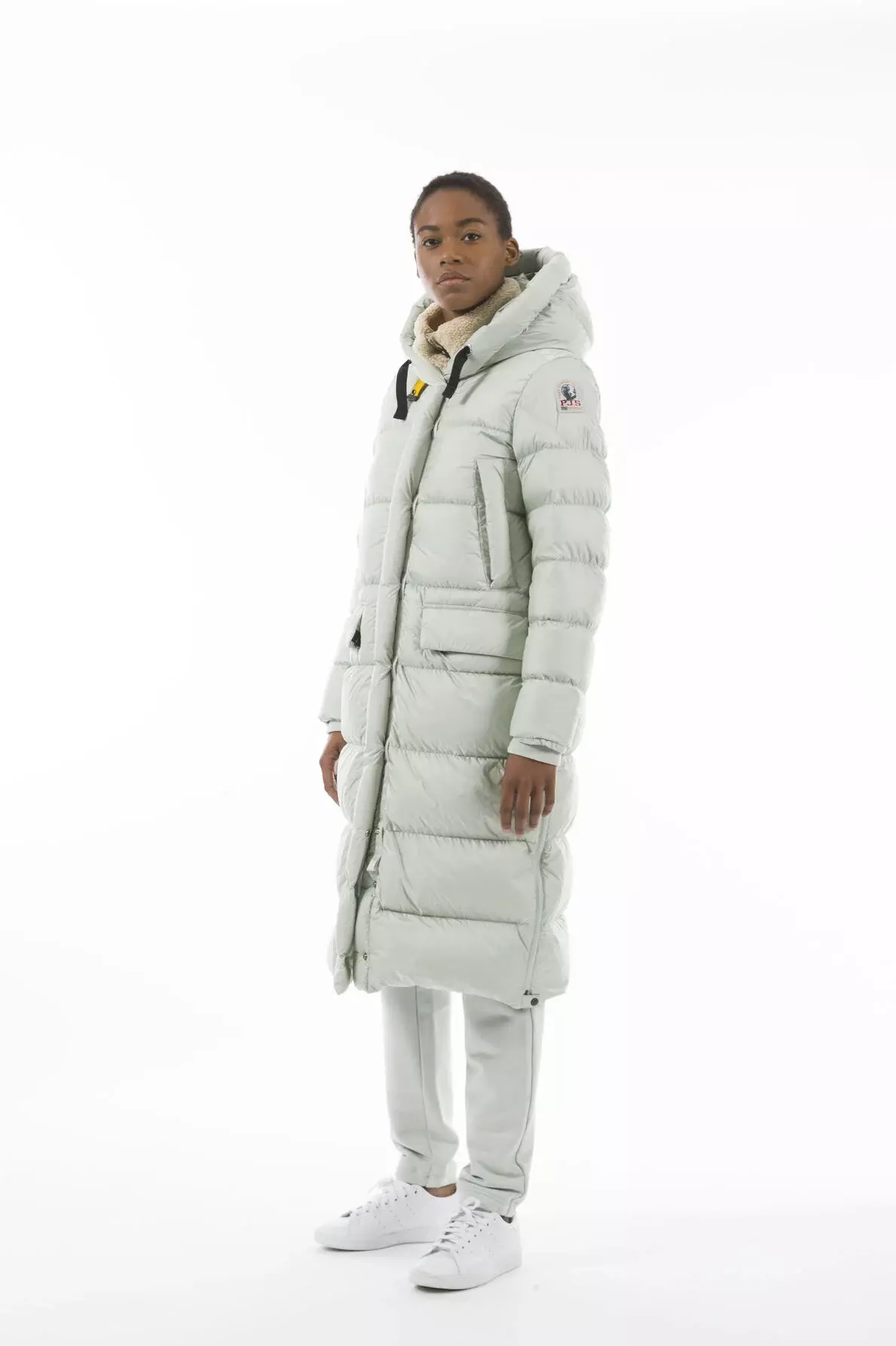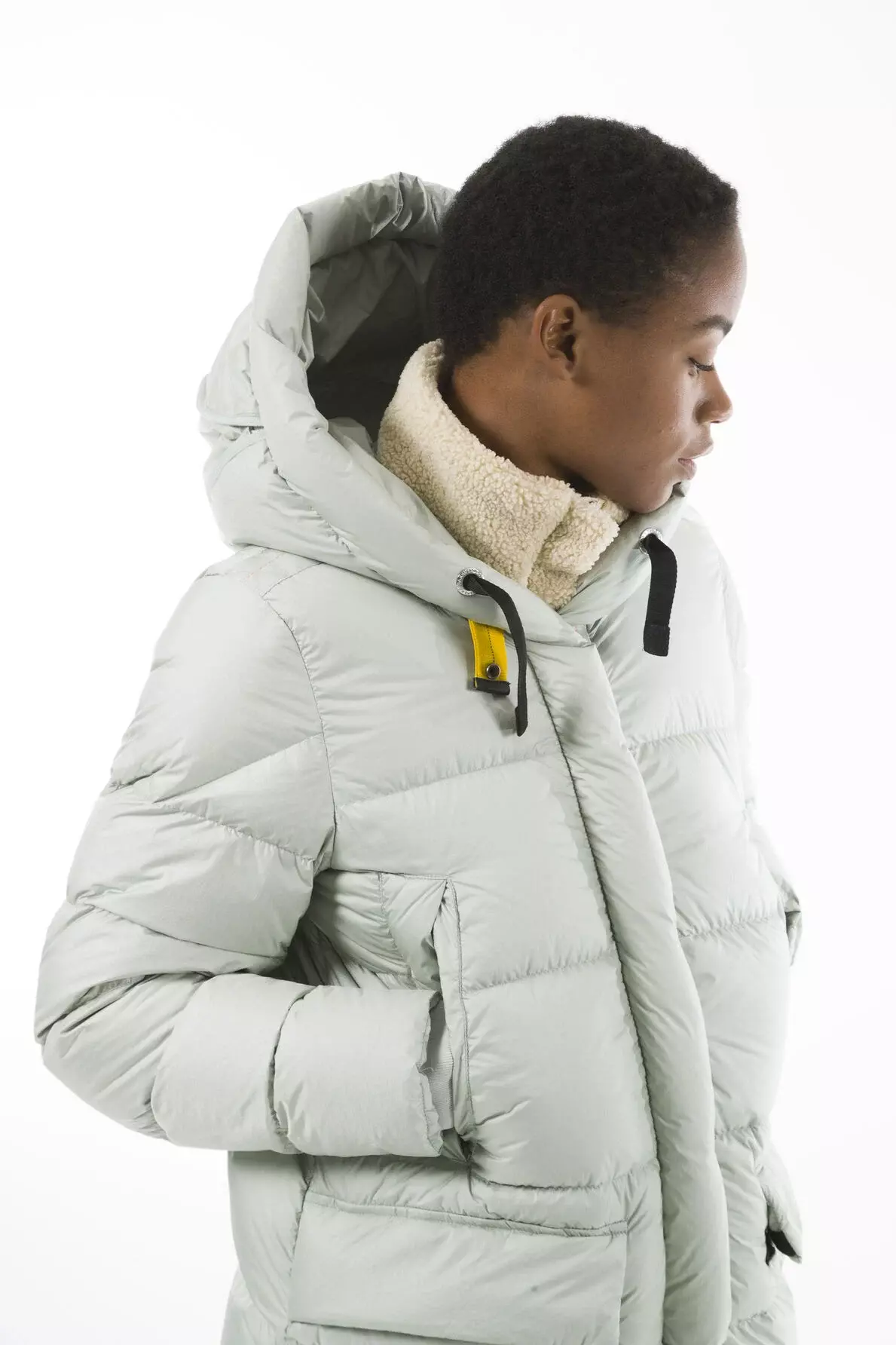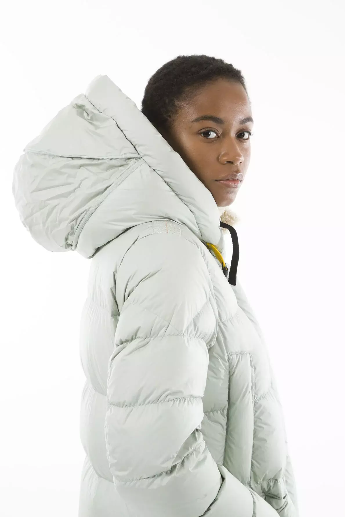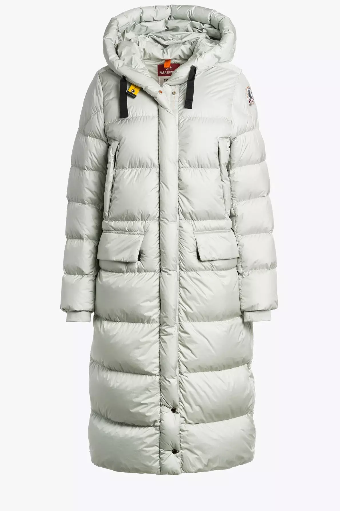 Исключительная мягкость и макси-длина: Mummy — это пуховое пальто, выполненное из ткани с добавлением серебряной фольги, которая создает на его поверхности особый блеск.