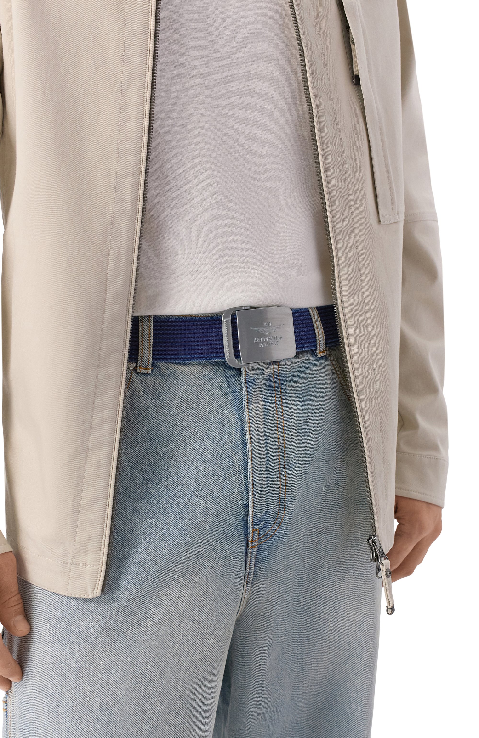 Стильный текстильный ремень с прямоугольной металлической пряжкой, которую украсили тисненым логотипом бренда.