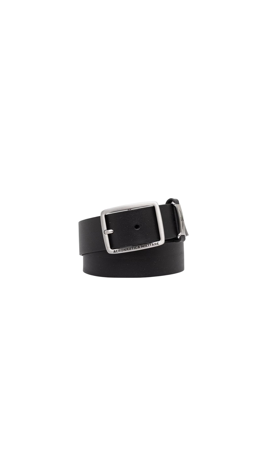 Классический ремень из натуральной кожи с прямоугольной металлической пряжкой, которую украсили тисненым логотипом бренда.