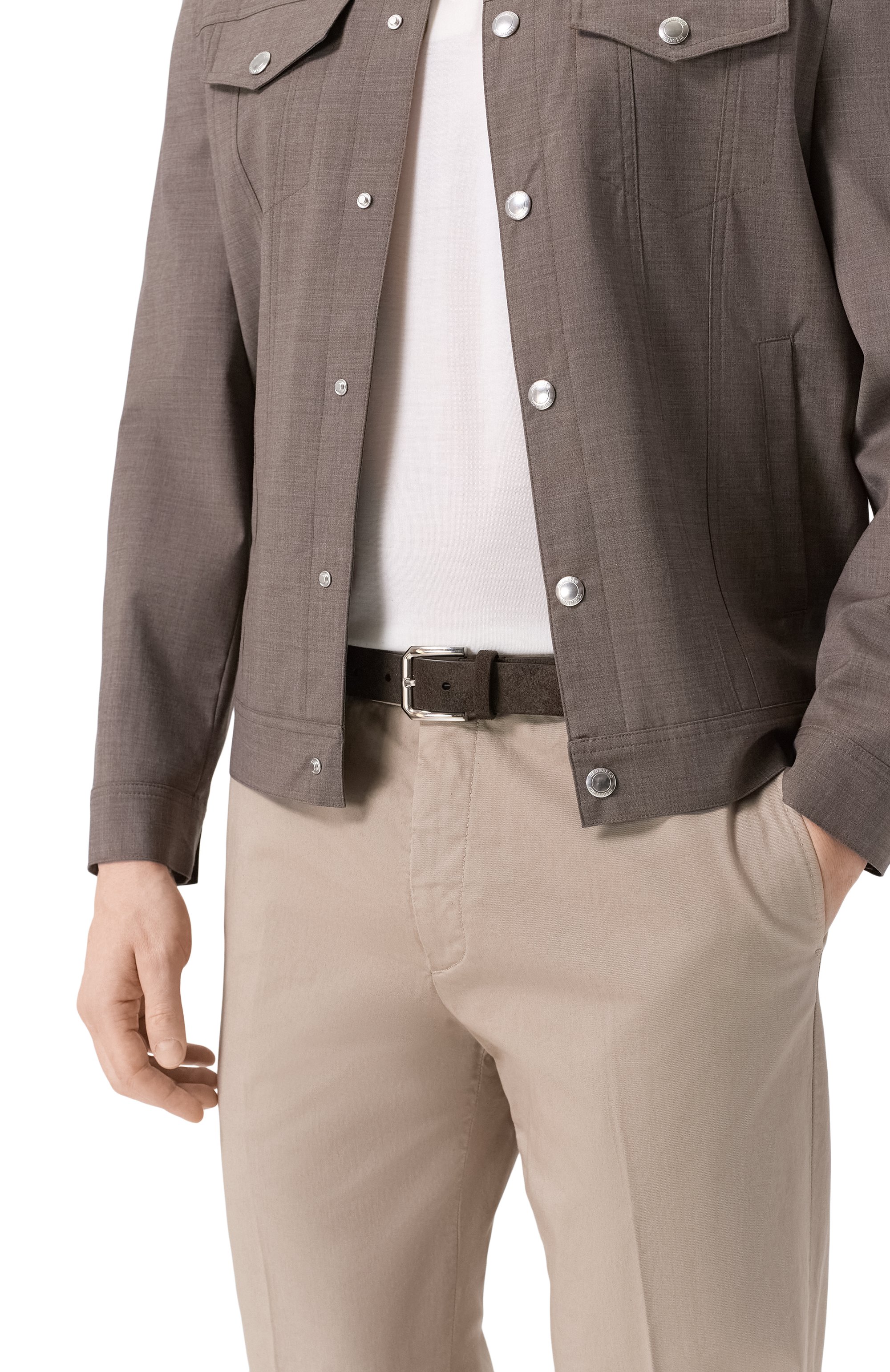 Регулируемый ремень с тренчиком из телячьей замши дополнили фигурной пряжкой и наконечником со скошенными углами, изготовленными из отполированного металла.