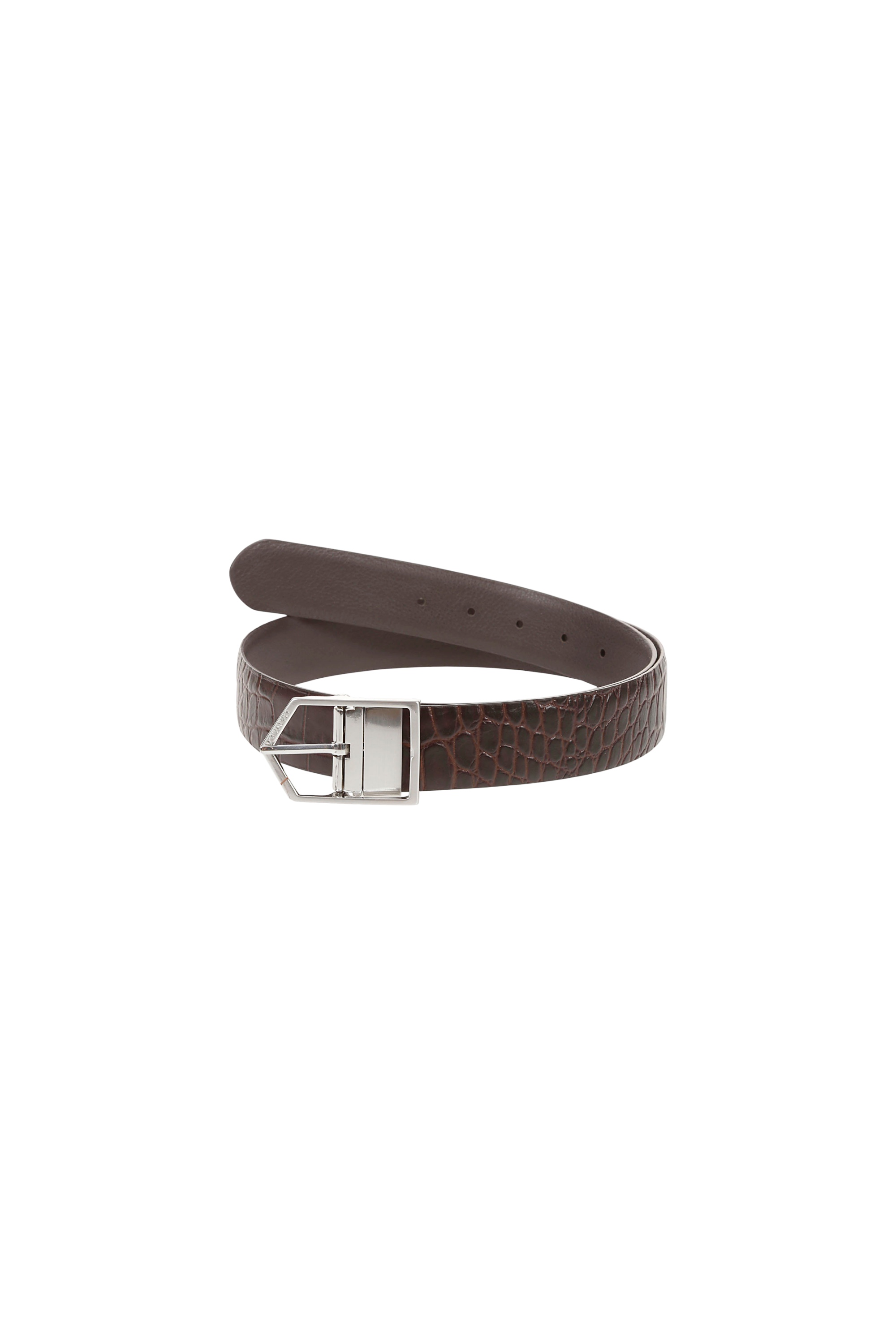Эффектный ремень из натуральной кожи дополнили металлической прямоугольной пряжкой. Такой аксессуар подойдет как для образов с брюками, так и с классическими джинсами.