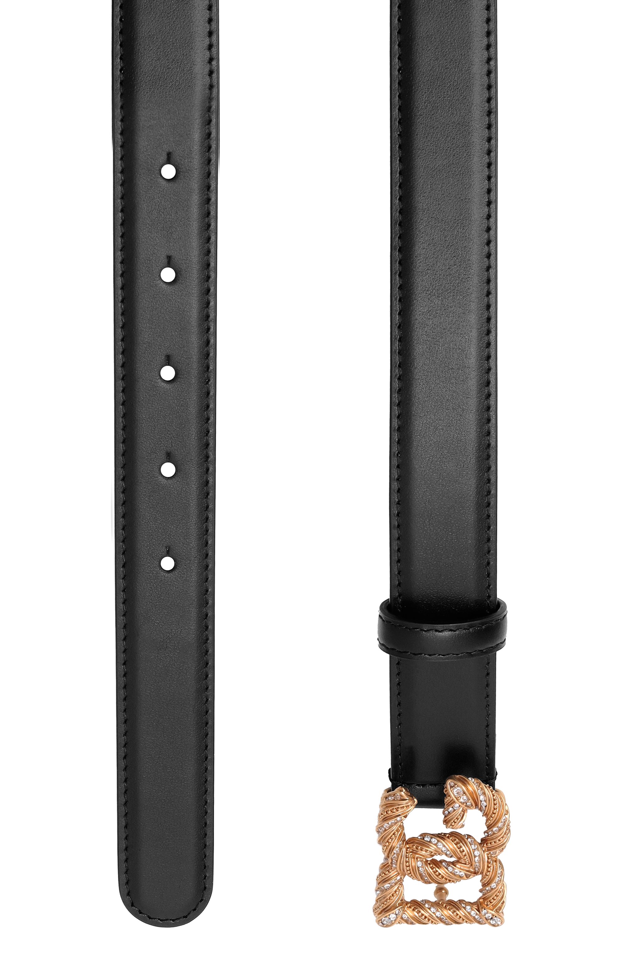 Ремень со скользящей шлевкой из гладкой телячьей кожи застегивается витой пряжкой в виде монограммы бренда, украшенной кристаллами.