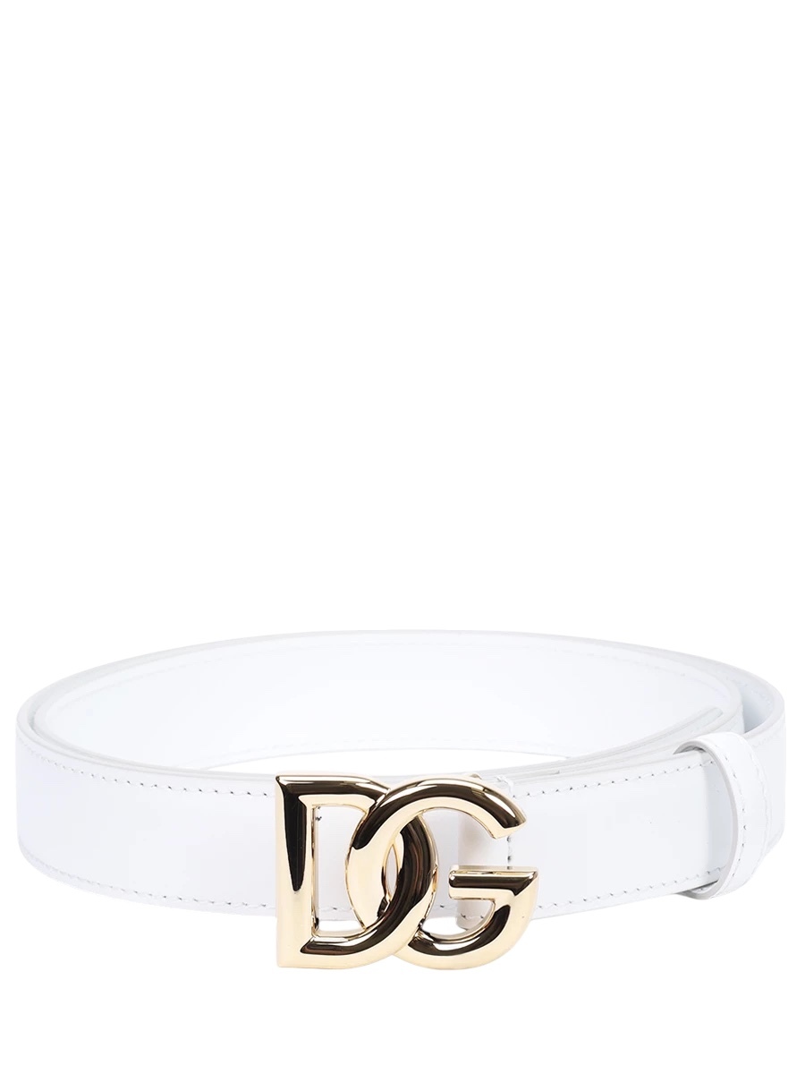 Белый ремень из натуральной кожи с крупной золотистой DG-монограммой, кобурной застежкой и одной кожаной шлевкой дополнит как поясные изделия, так и подчеркнет талию в образах с объемными блузами или платьями.