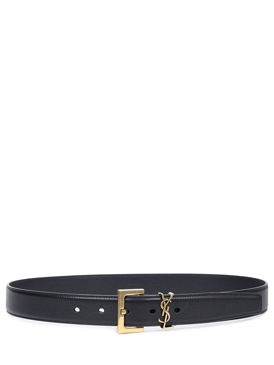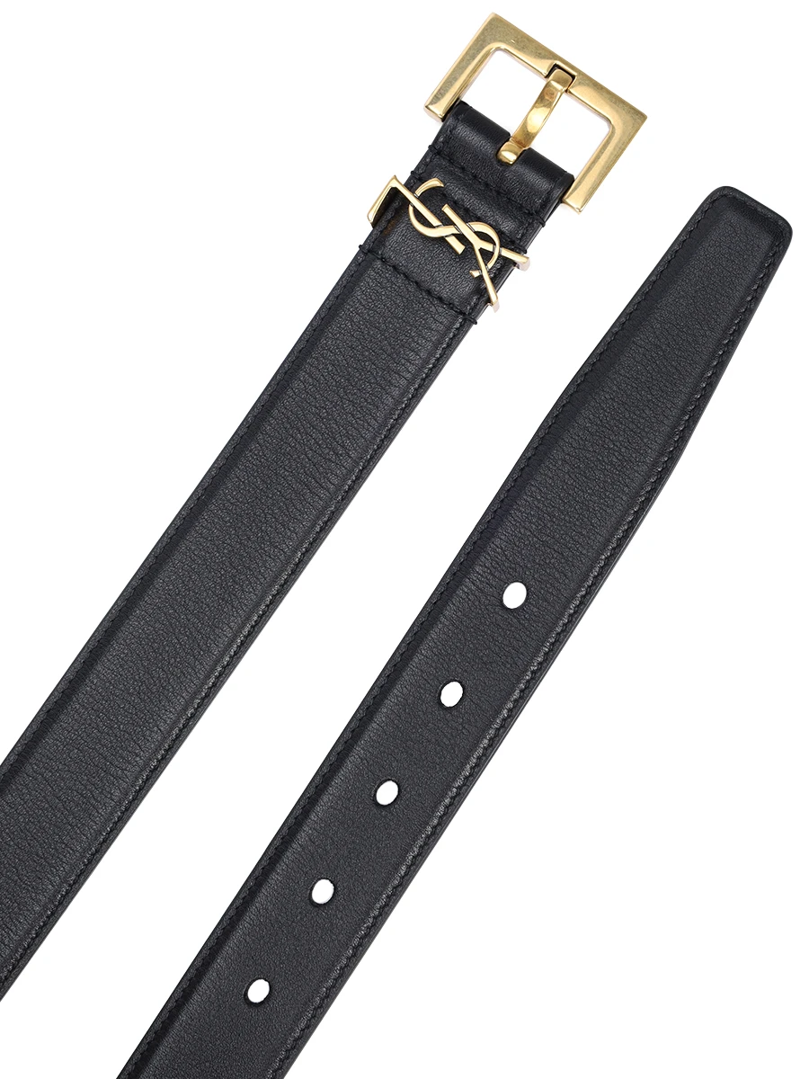 Ремень из натуральной кожи с миниатюрной золотистой пряжкой и одной шлевкой в форме логотипа Кассандра, составленной из инициалов Ива Сен-Лорана.