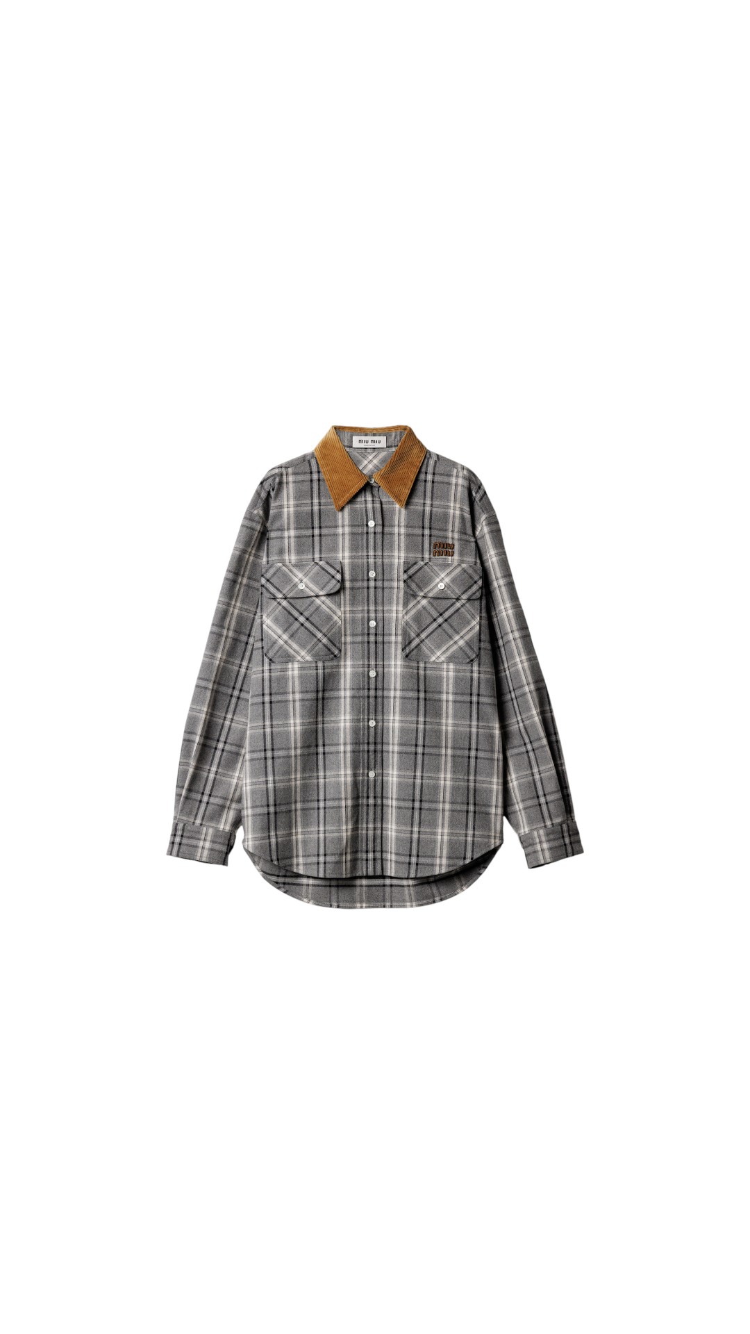 Рубашка с принтом в клетку и застежкой на пуговицы свободного силуэта дополнена накладными карманами и контрастным вельветовым воротником.