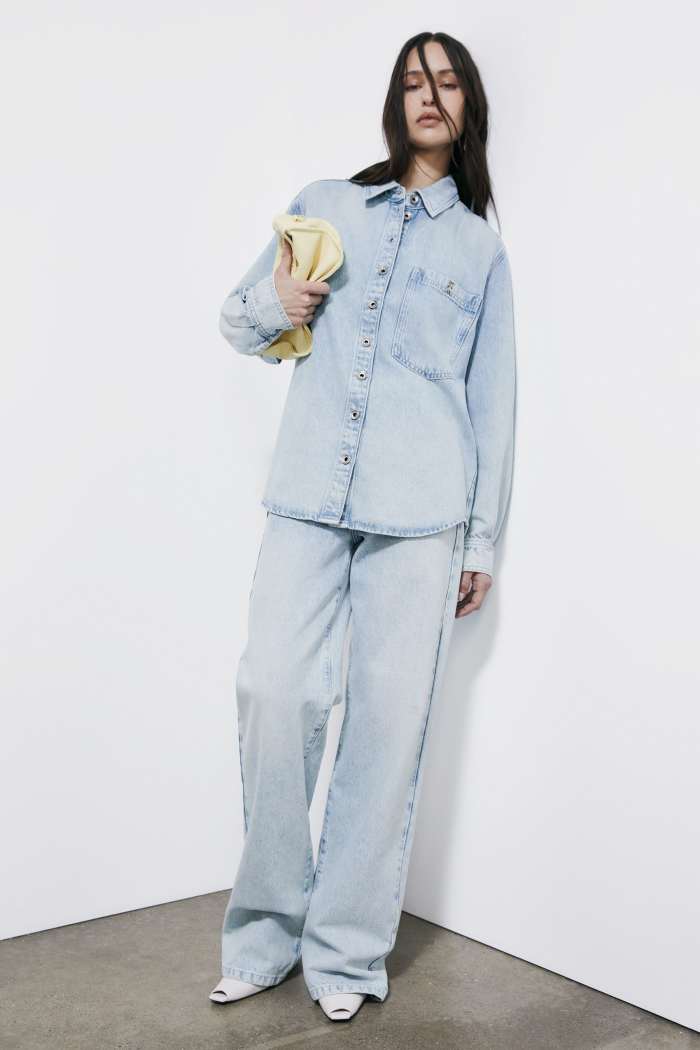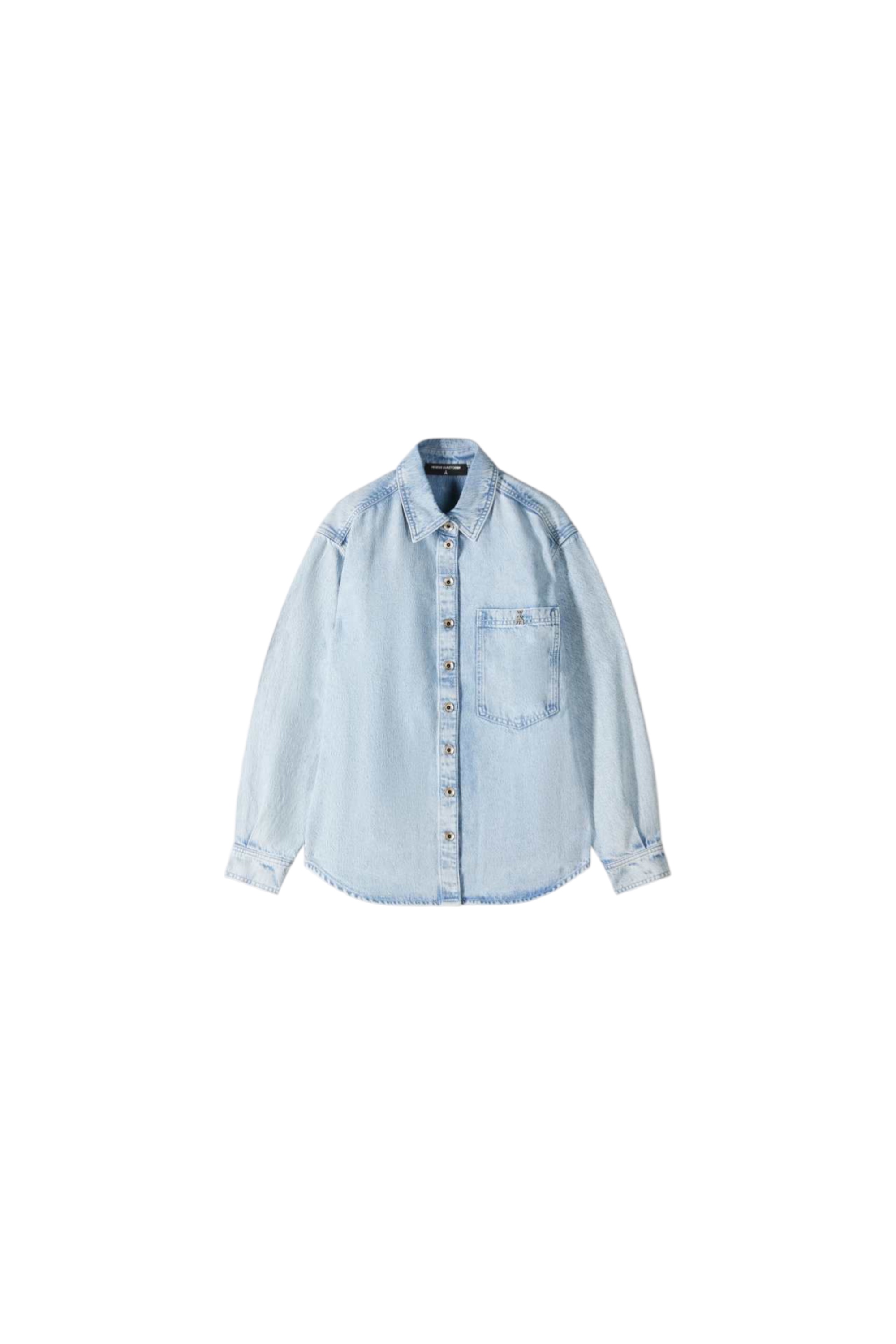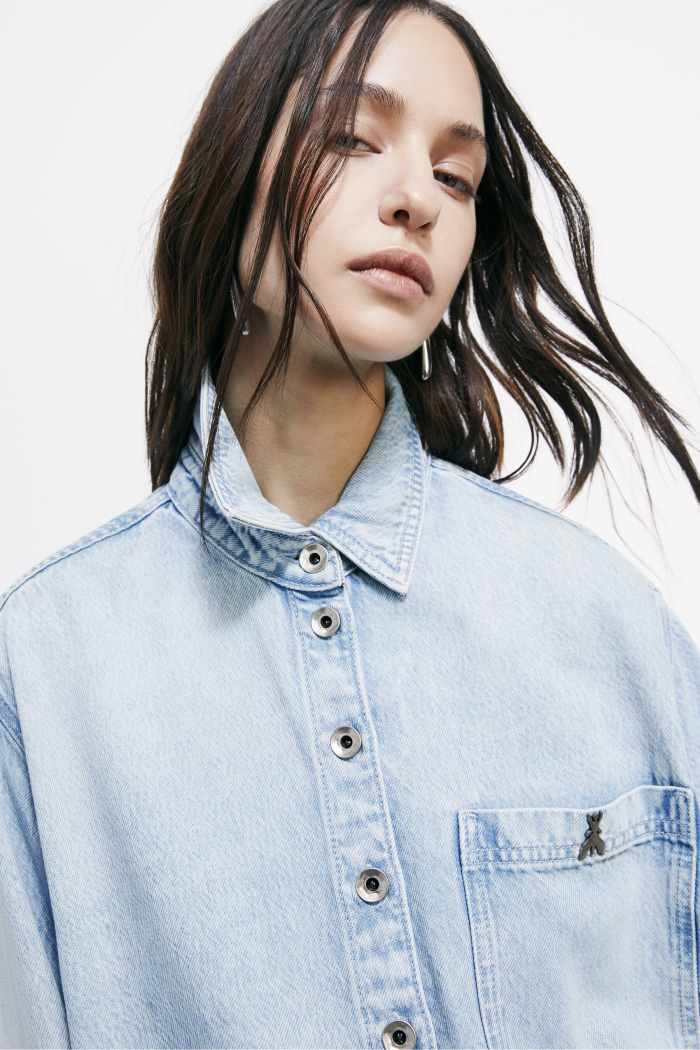 Стильная джинсовая рубашка расслабленного силуэта дополнена накладным карманом, который украсили фирменным логотипом бренда.