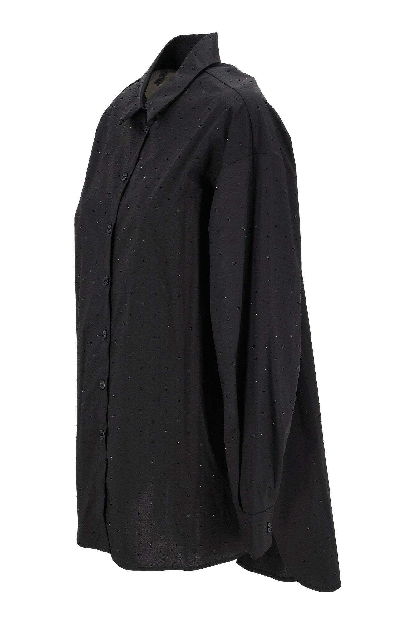 Эффектная рубашка свободного силуэта со спущенной линией плеч украшена мерцающими стразами.
