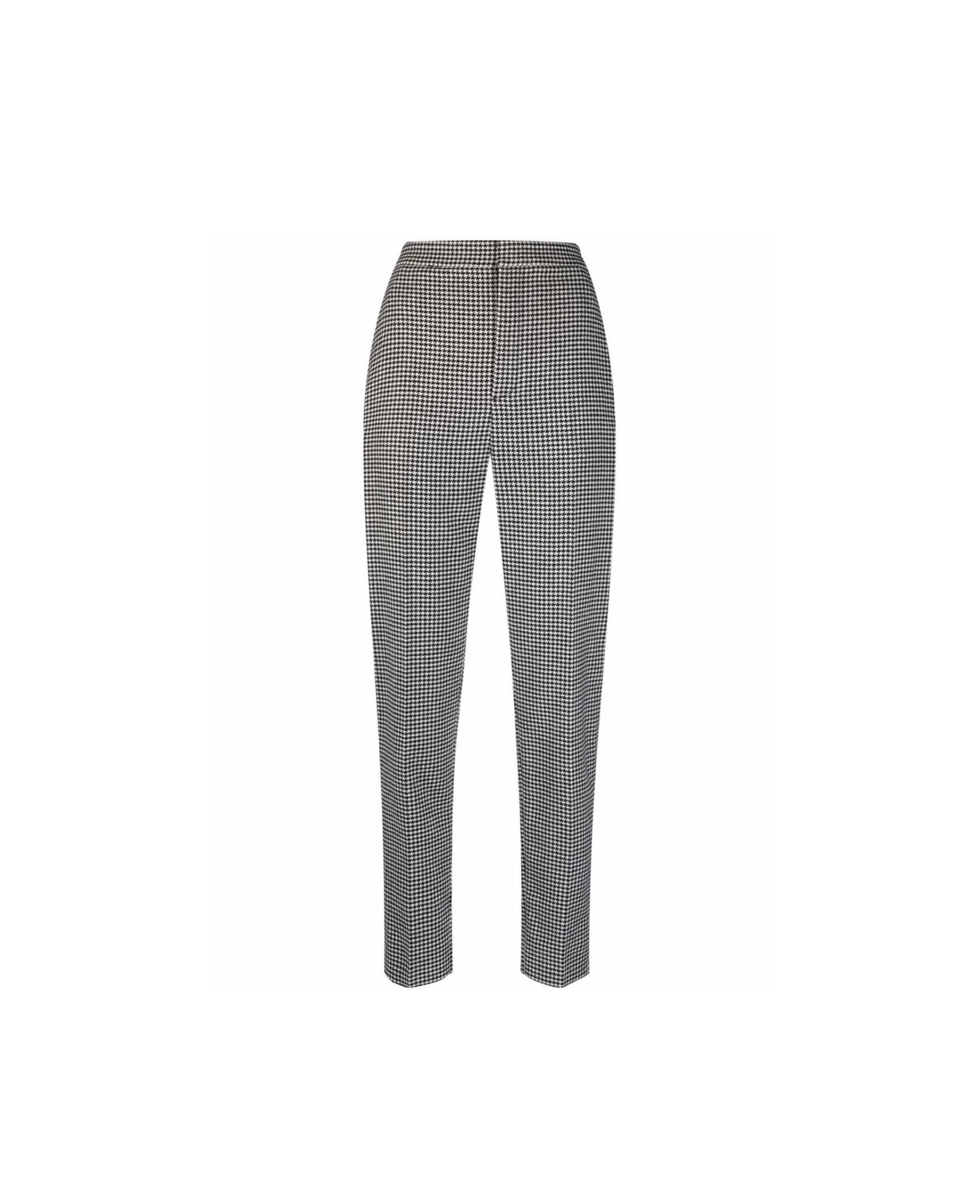 Укороченные брюки точеного силуэта с посадкой на талии и стрелками. Мастера марки, основанной Ивом Сен-Лораном, сшили модель в черно-белую клетку пье-де-пуль из плотной ткани на основе шерсти.