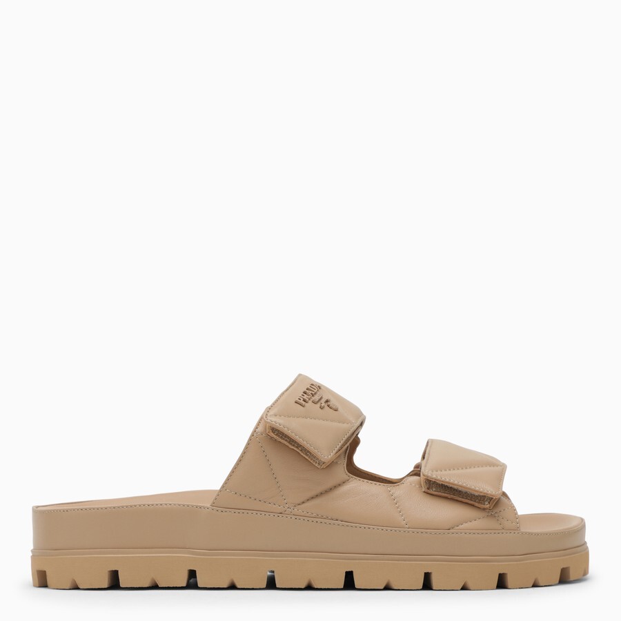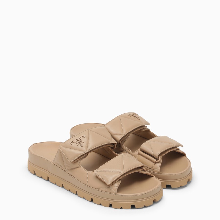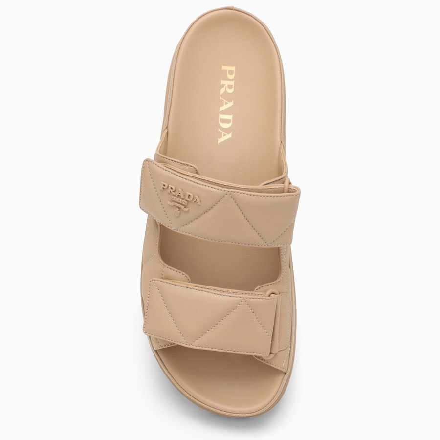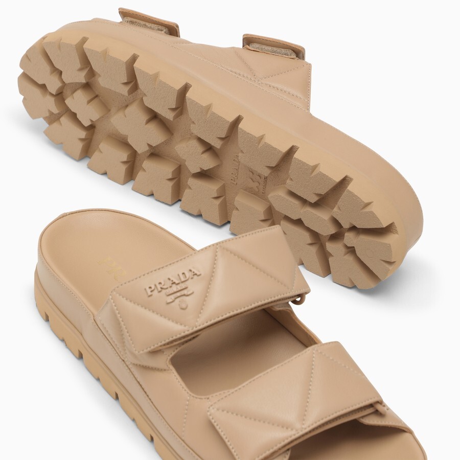 Босоножки из кожи песочного цвета от Prada с металлической надписью в тон спереди, стеганым верхом, двойным ремешком на липучке и резиновой подошвой со ластовицей
