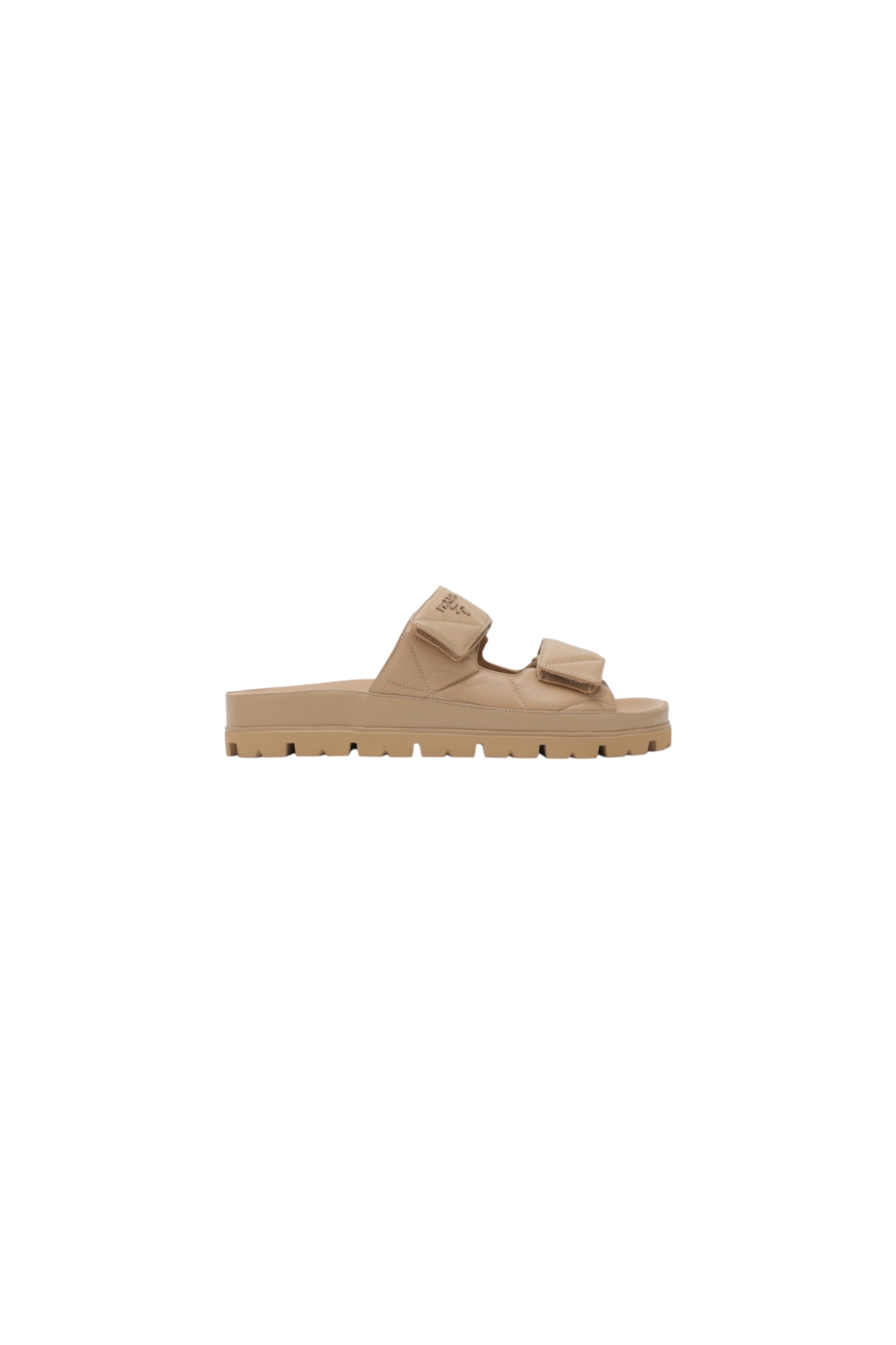 Босоножки из мягкой кожи с металлическим логотипом бренда в тон спереди, стеганым верхом, двойным ремешком на липучке и резиновой подошвой со ластовицей.