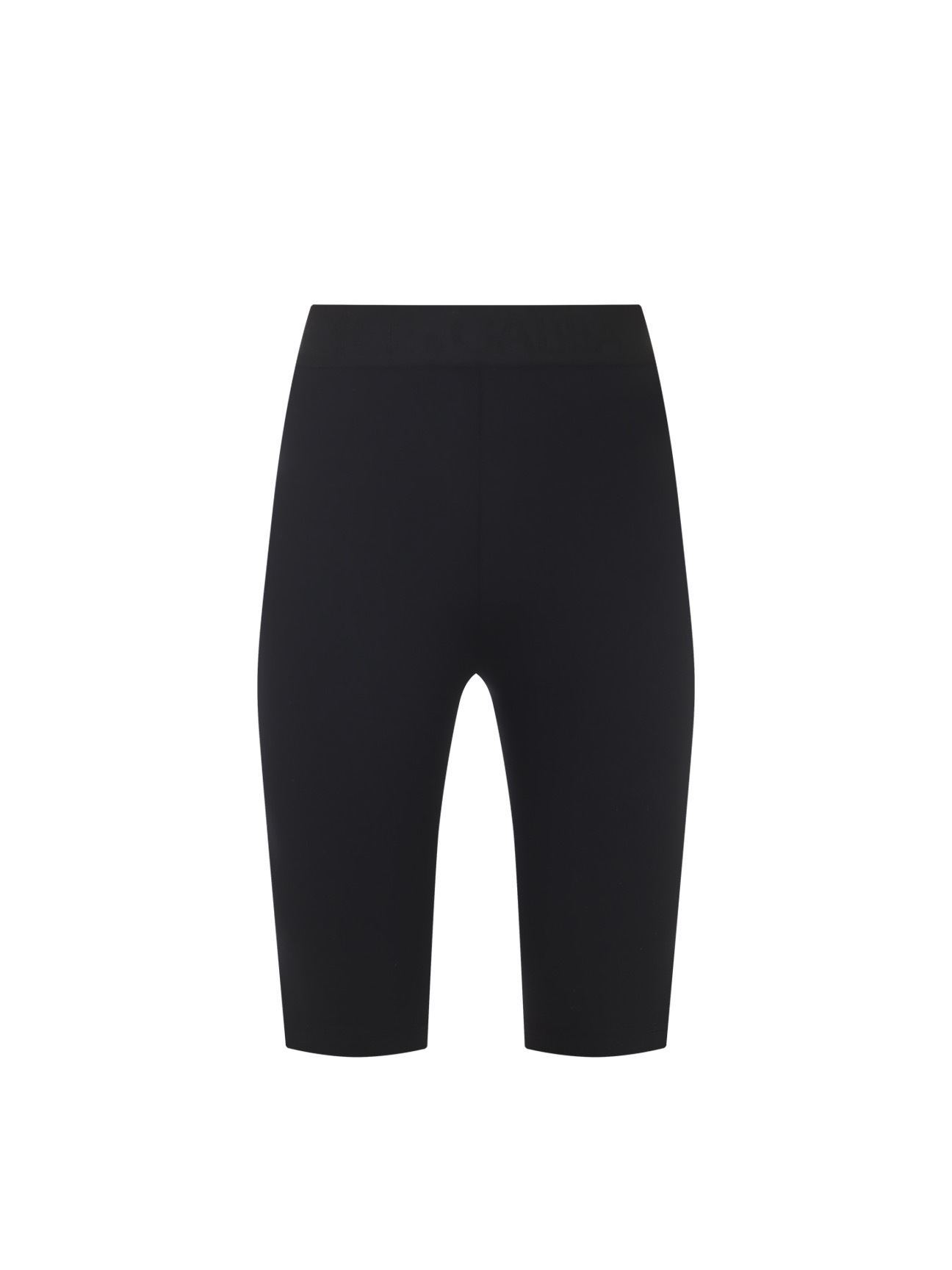 Трикотажные велосипедки купажированного состава облегающего кроя с застежкой на потайную молнию сзади на высокой посадке подчеркнуты поясом с жаккардовым логотипом бренда.