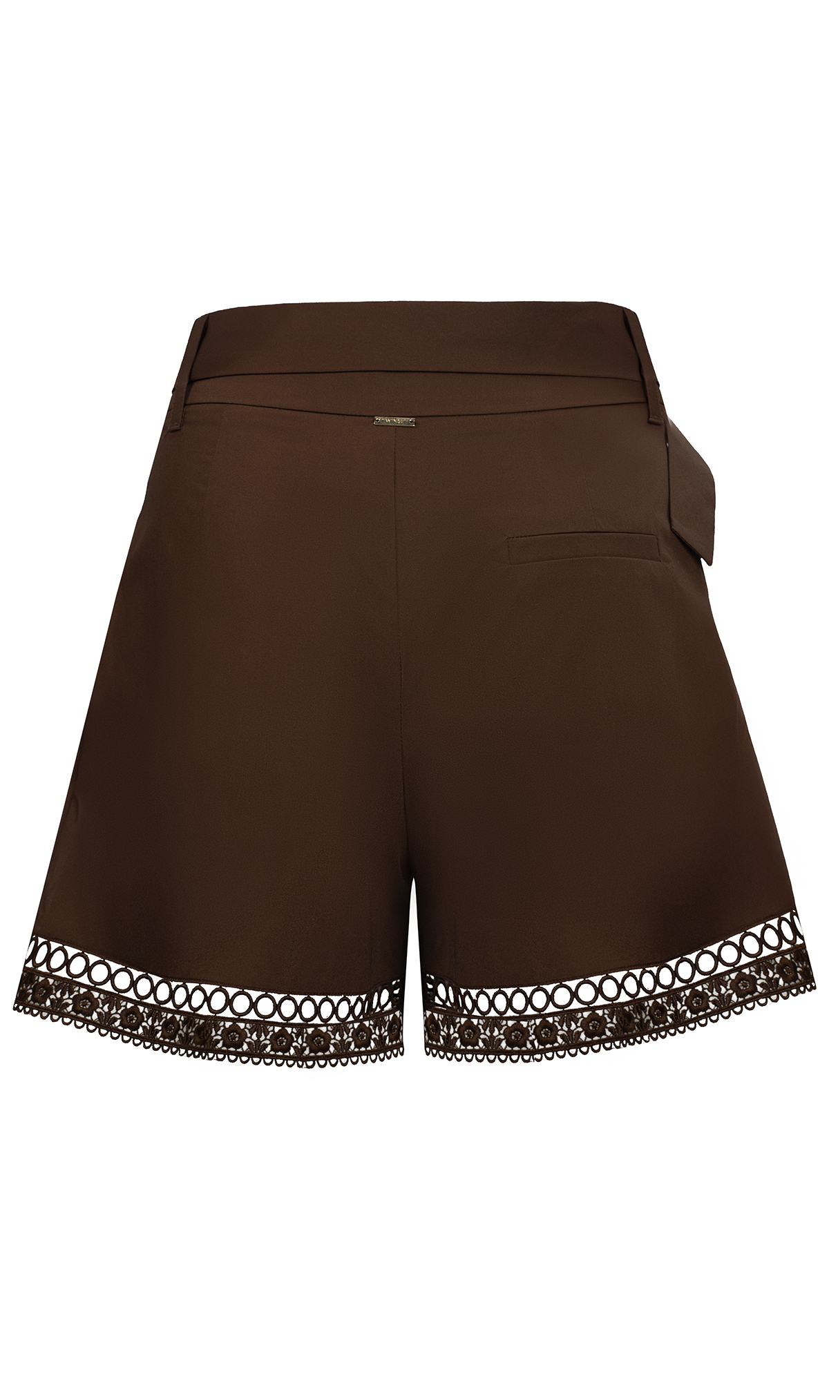 Однотонные шорты слегка расслабленного силуэта дополнены регулируемым поясом на талии в тон и украшена эффектным кружевом.