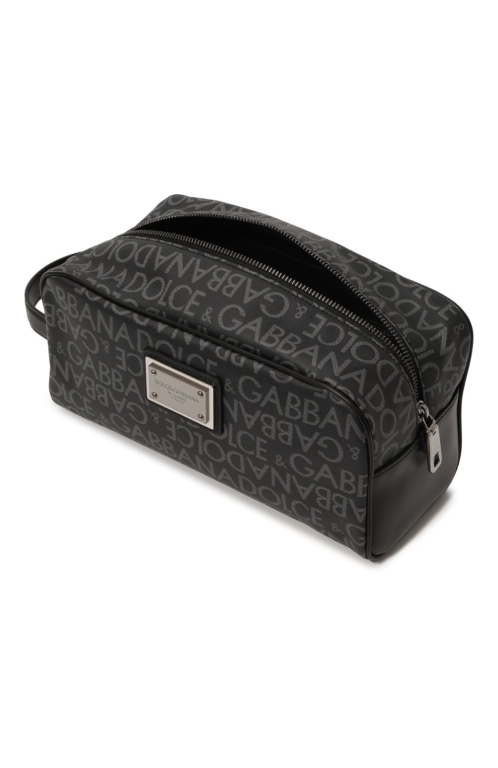 Сумка-несессер с короткой ручкой и отделкой из гладкой украшена фирменной двухслойной пластиной с символикой марки. Аксессуар с одним отделением, застегивающимся молнией, выполнен из непромокаемого матового материала с повторяющимися логотипами бренда.