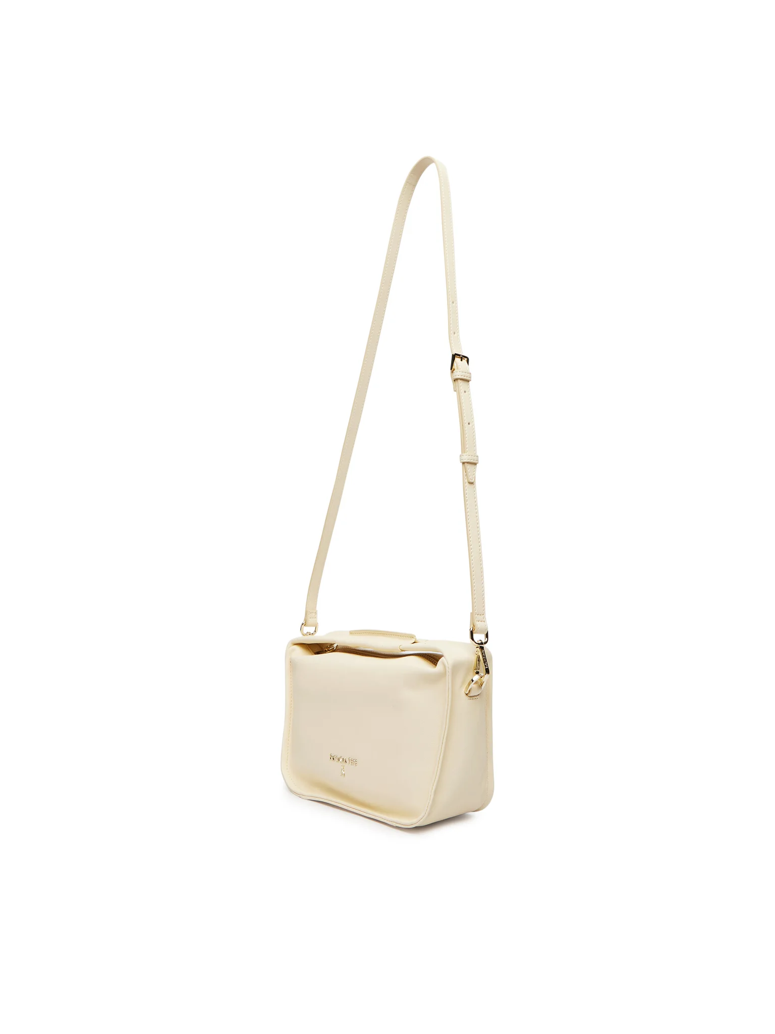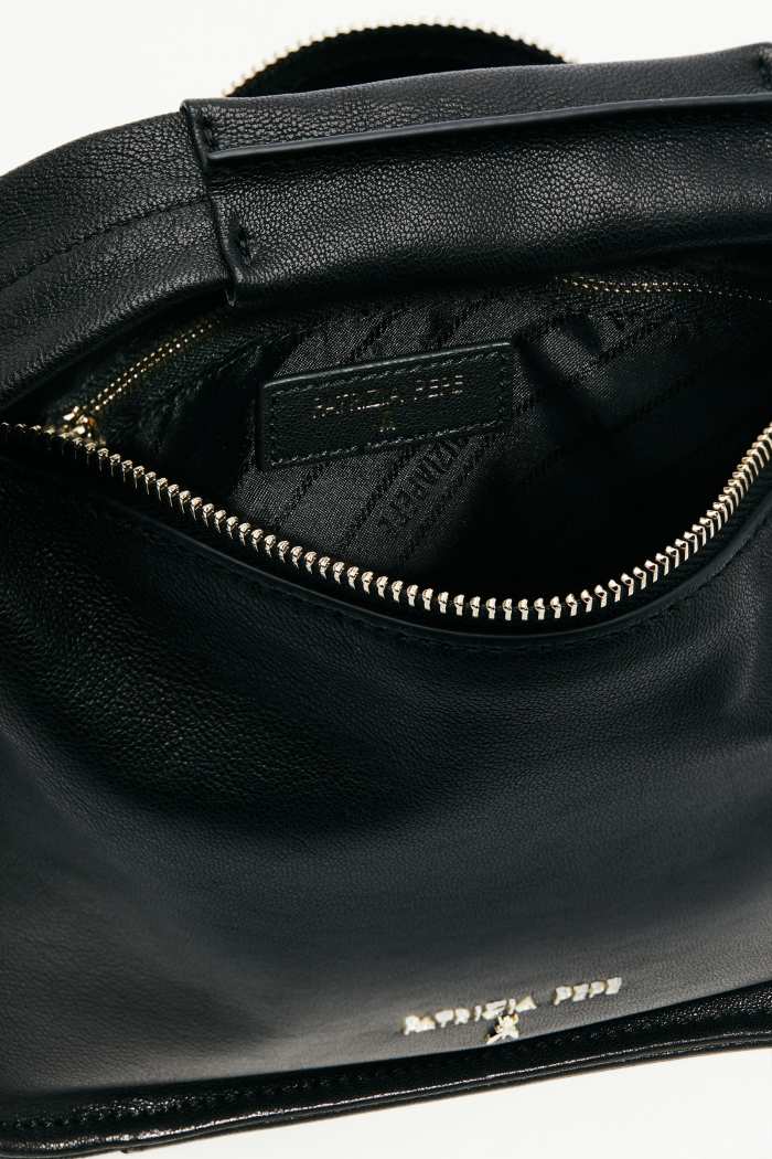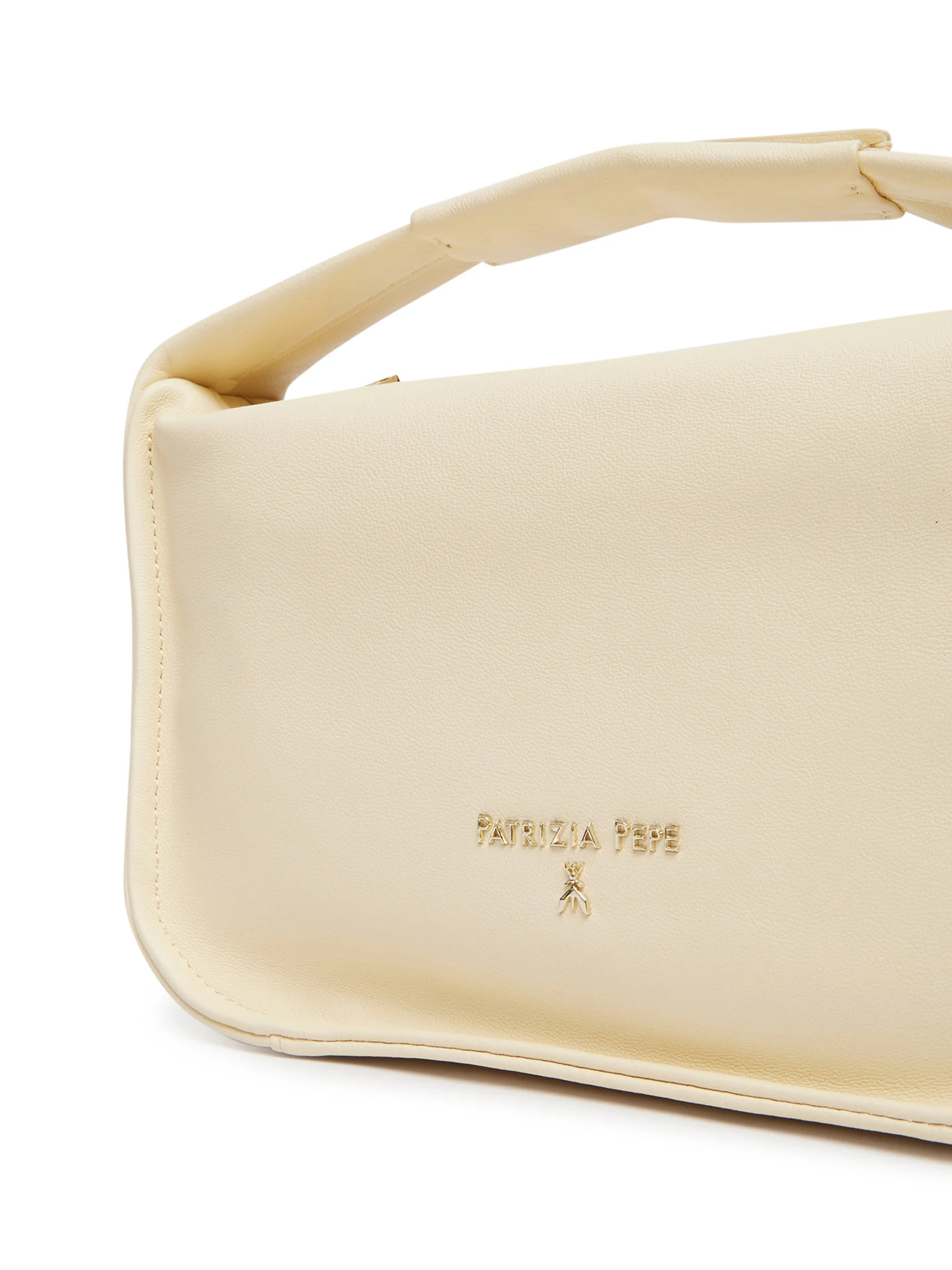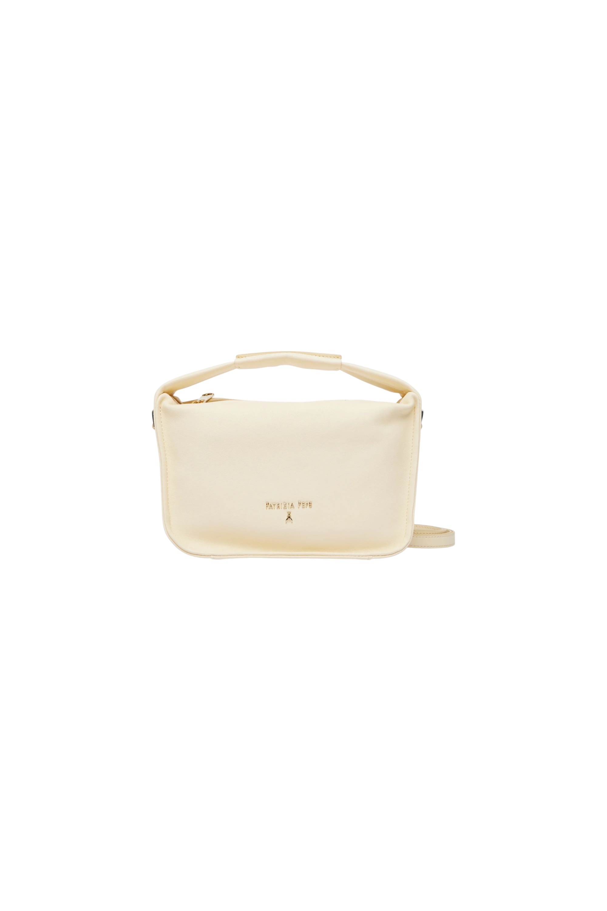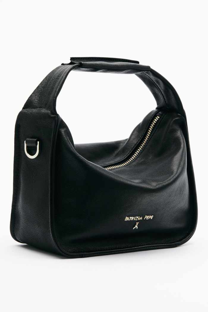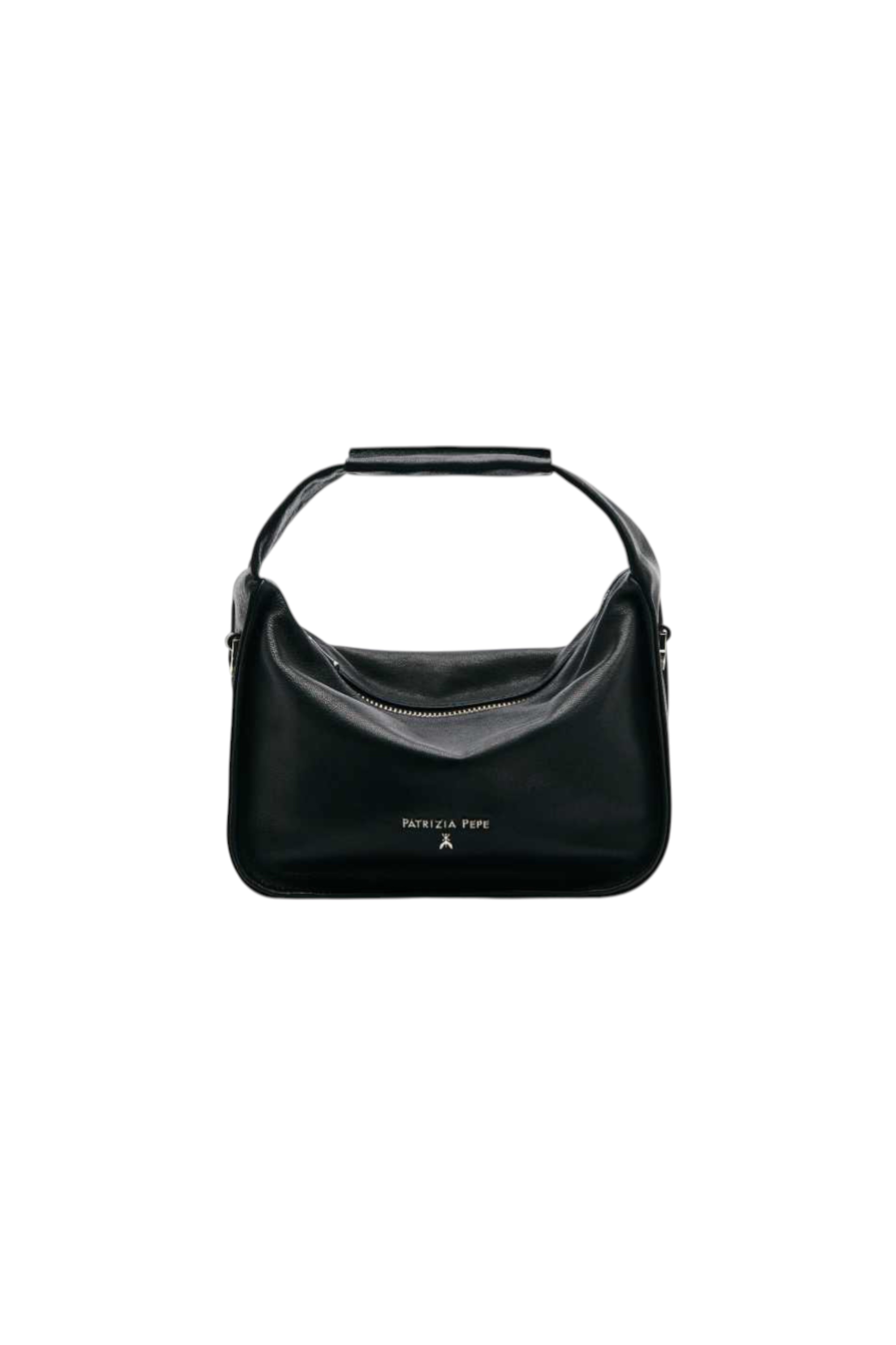 Небольшая сумка с широкой ручкой и застежкой на молнию дополнена съемным регулируемым плечевым ремнем и украшена металлическим логотипом бренда.