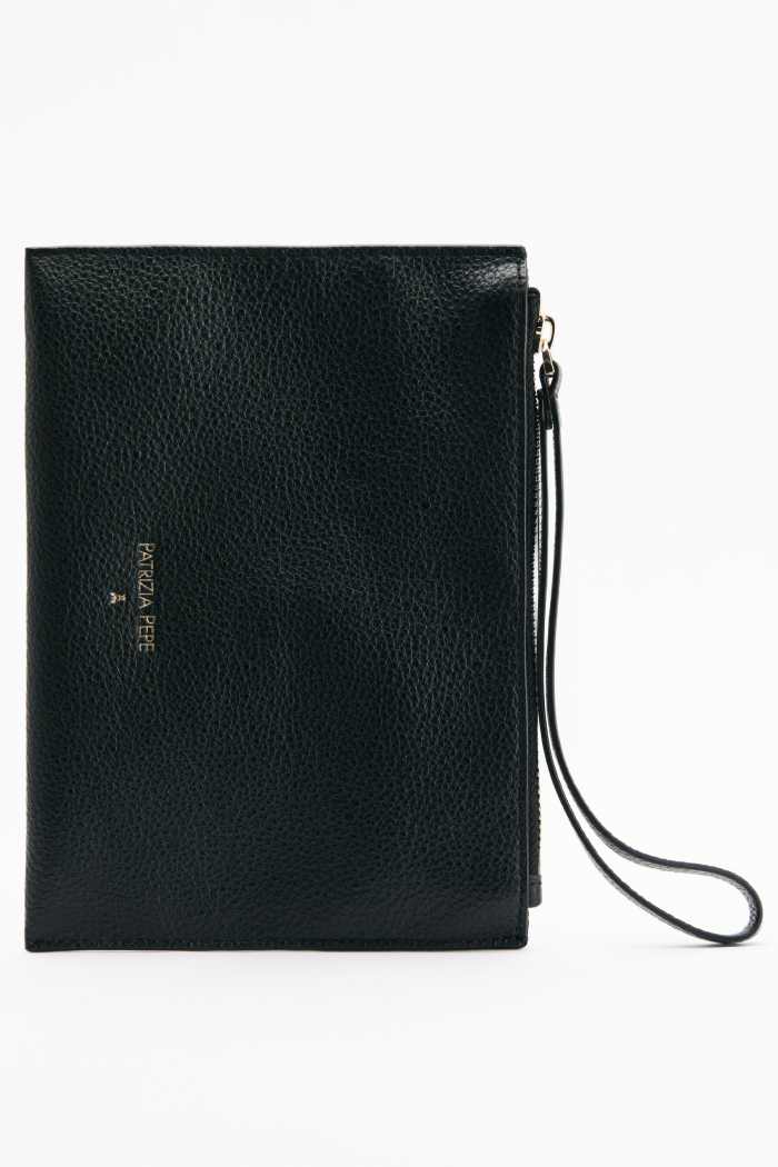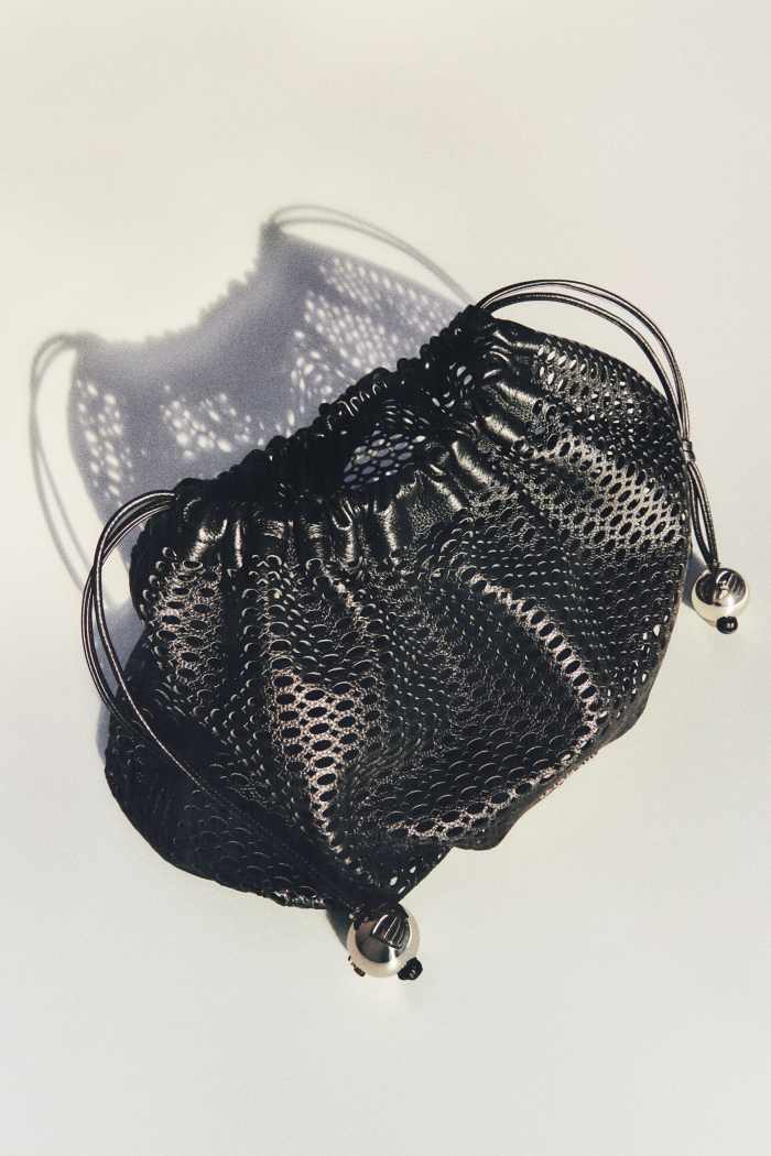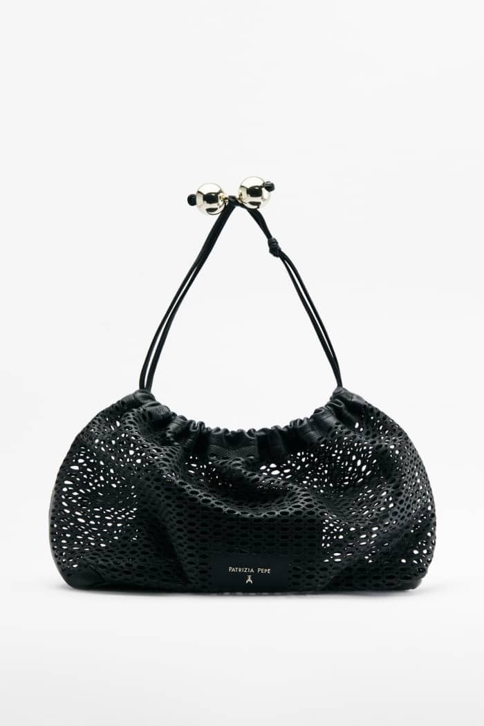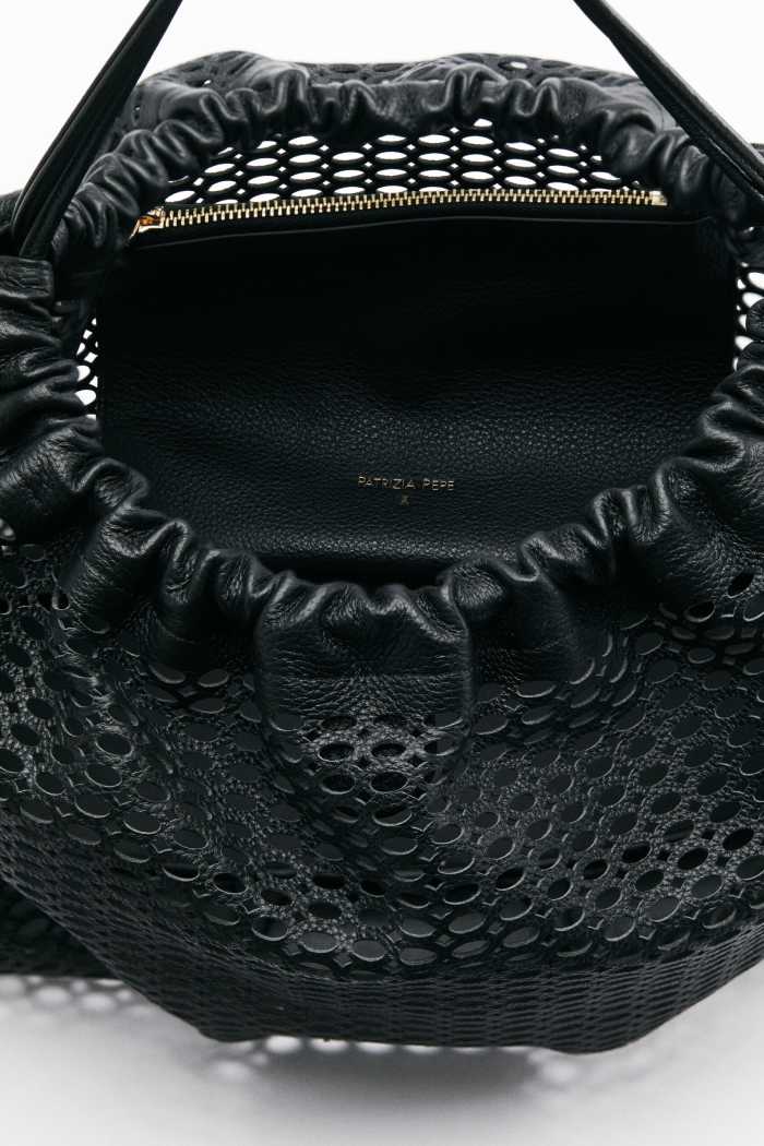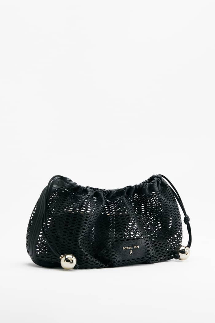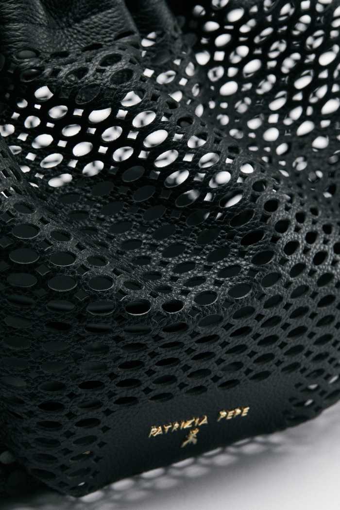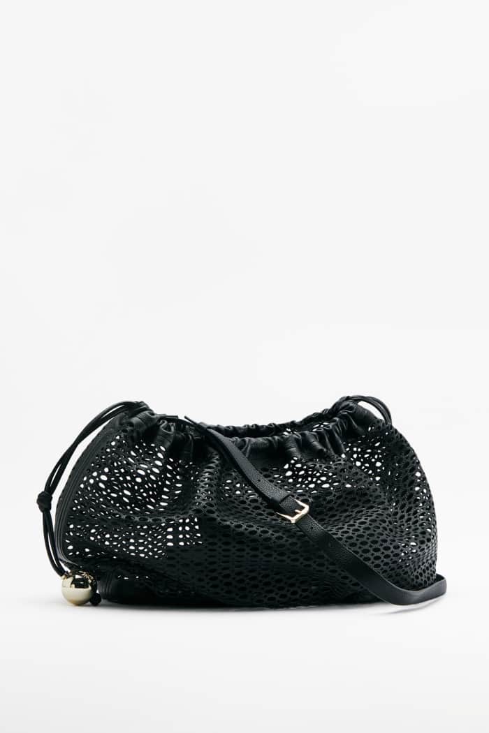 Лаконичная сумка из перфорированной натуральной кожи с регулируемым плечевым ремнем дополнена в комплекте кожаной косметичкой с застежкой на молнию.