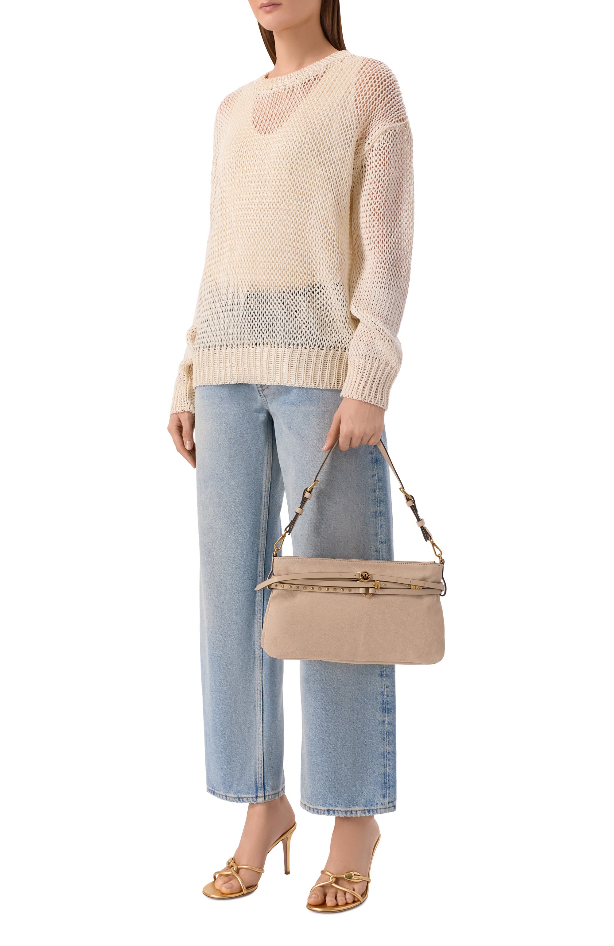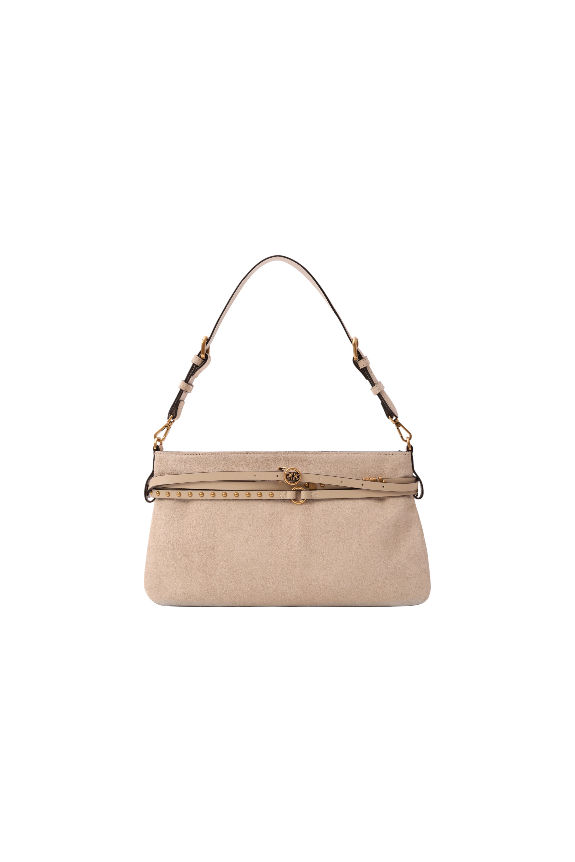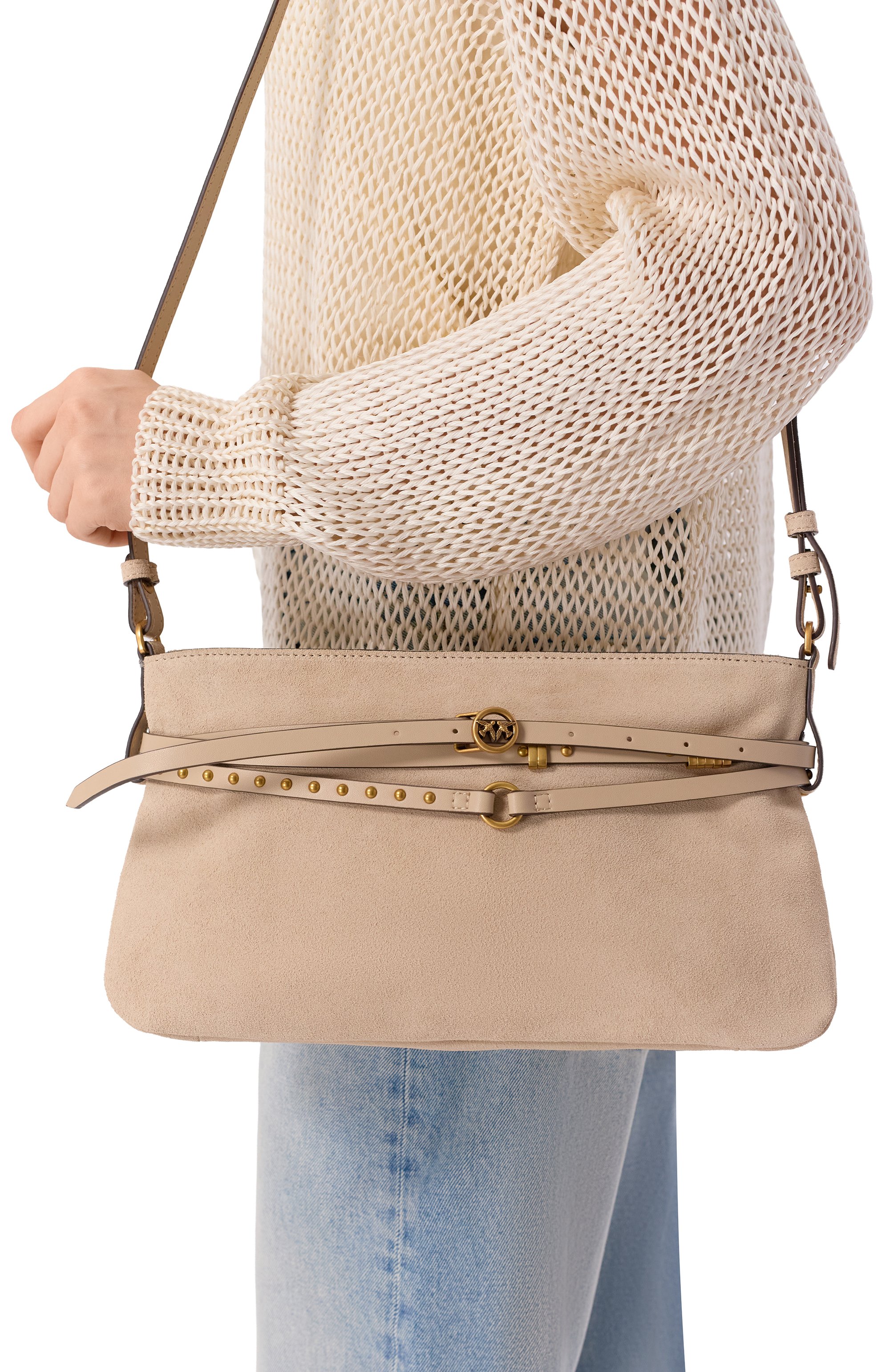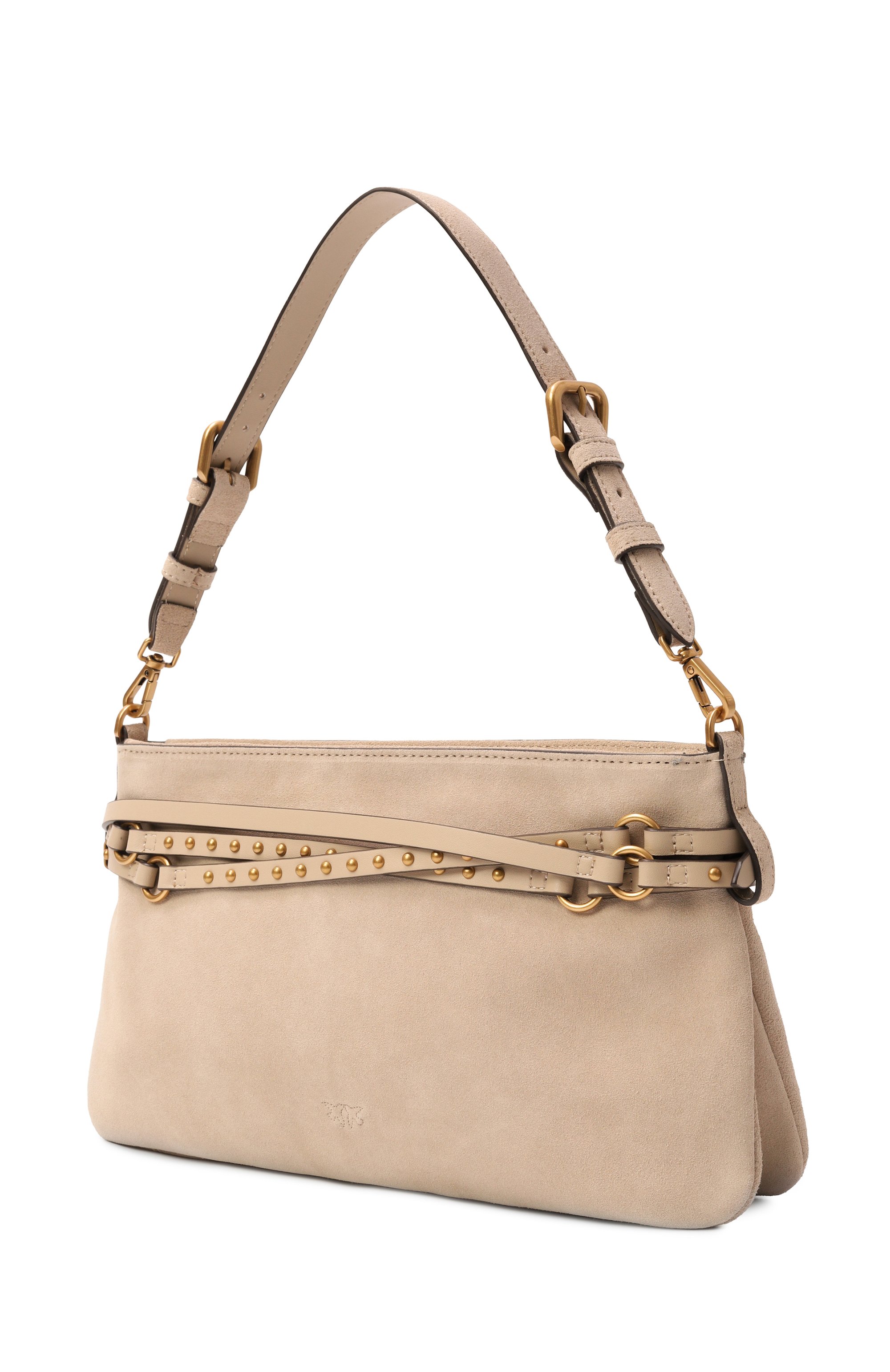Эффектная сумка из бархатистой замши с застежкой на молнию дополнена регулируемым плечевым ремнем и тисненым логотипом бренда.