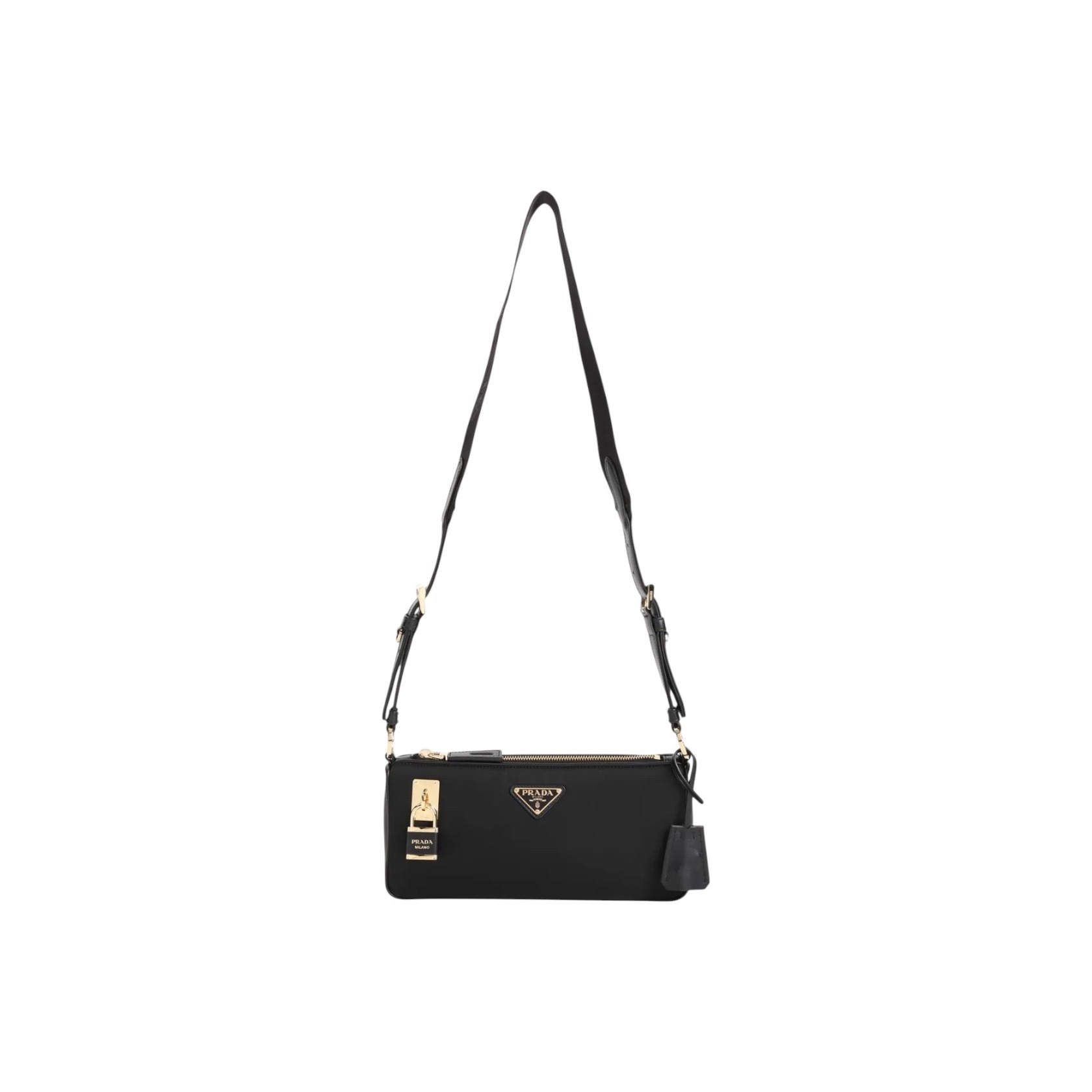 Нейлоновая сумка с регулируемым плечевым ремнем и застежкой на молнию украшена фирменным металлическим патчем с логотипом бренда.
