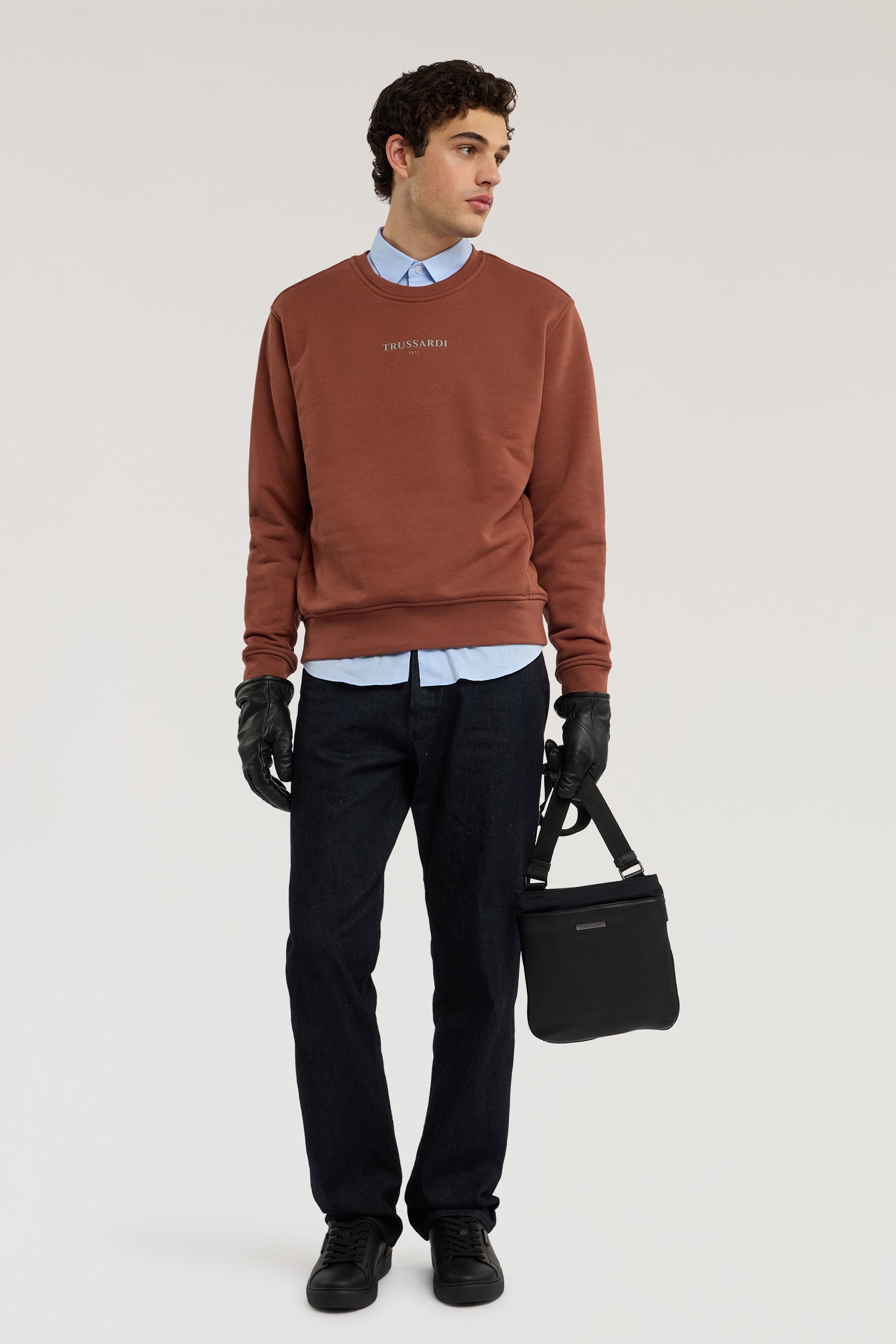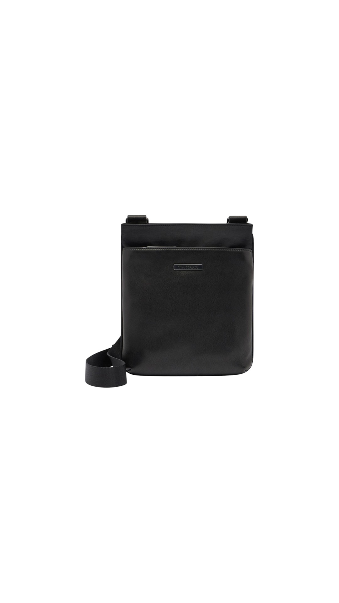 Небольшая сумка с регулируемым плечевым ремнем и застежкой на молнию, украшена металлическим патчем с логотипом бренда на передней панели.