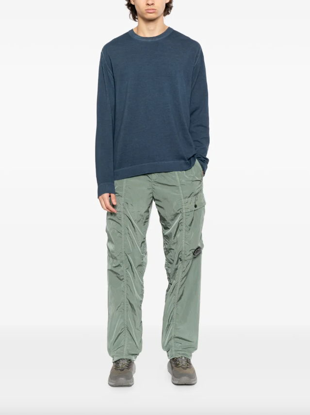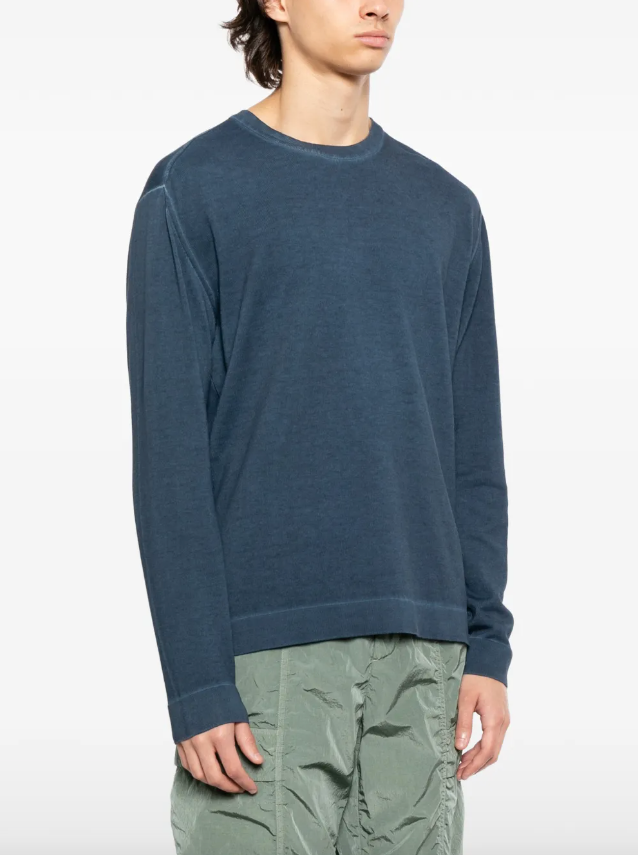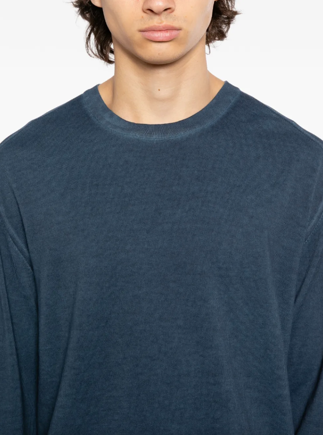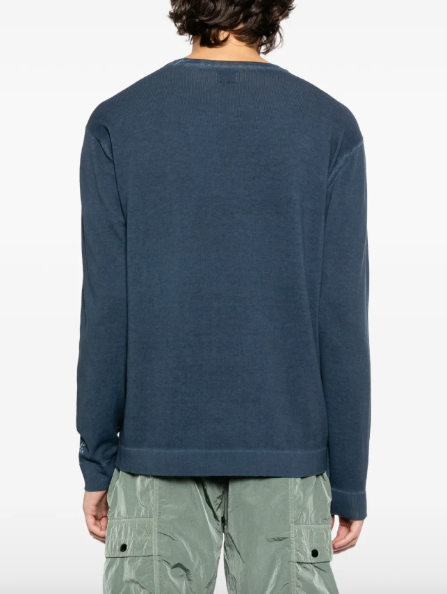 Свитер из хлопка с классическим круглым вырезом и спущенной линией плеч дополнен на рукаве вышитым логотипом бренда.