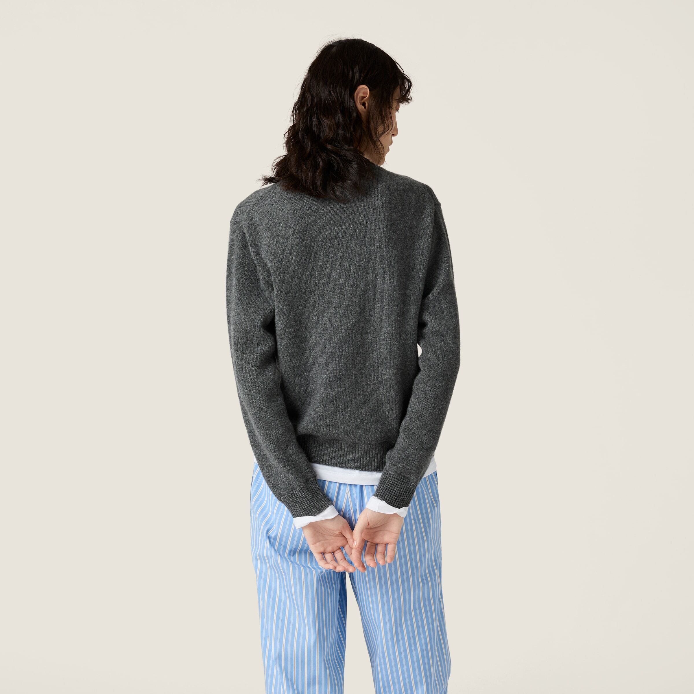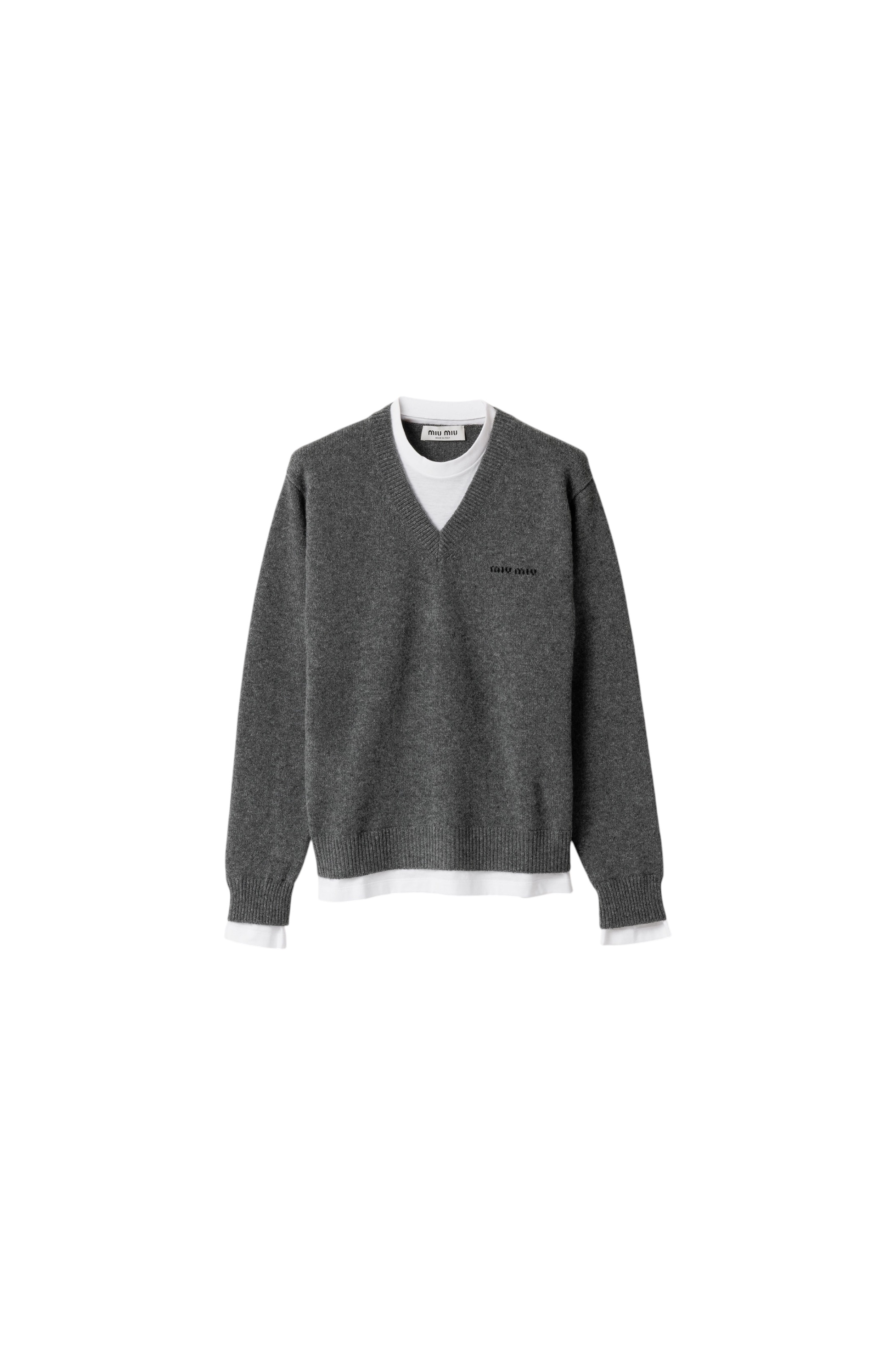 Кашемировый свитер расслабленного силуэта с V-образным вырезом дополнен трикотажными вставками, которые создают эффект многослойности.