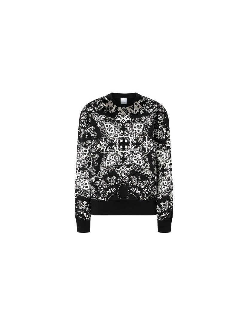 Свитер с круглым вырезом расслабленного силуэта дополнен эластичными манжетами и украшен принтом в виде банданы с эффектом ламинации.