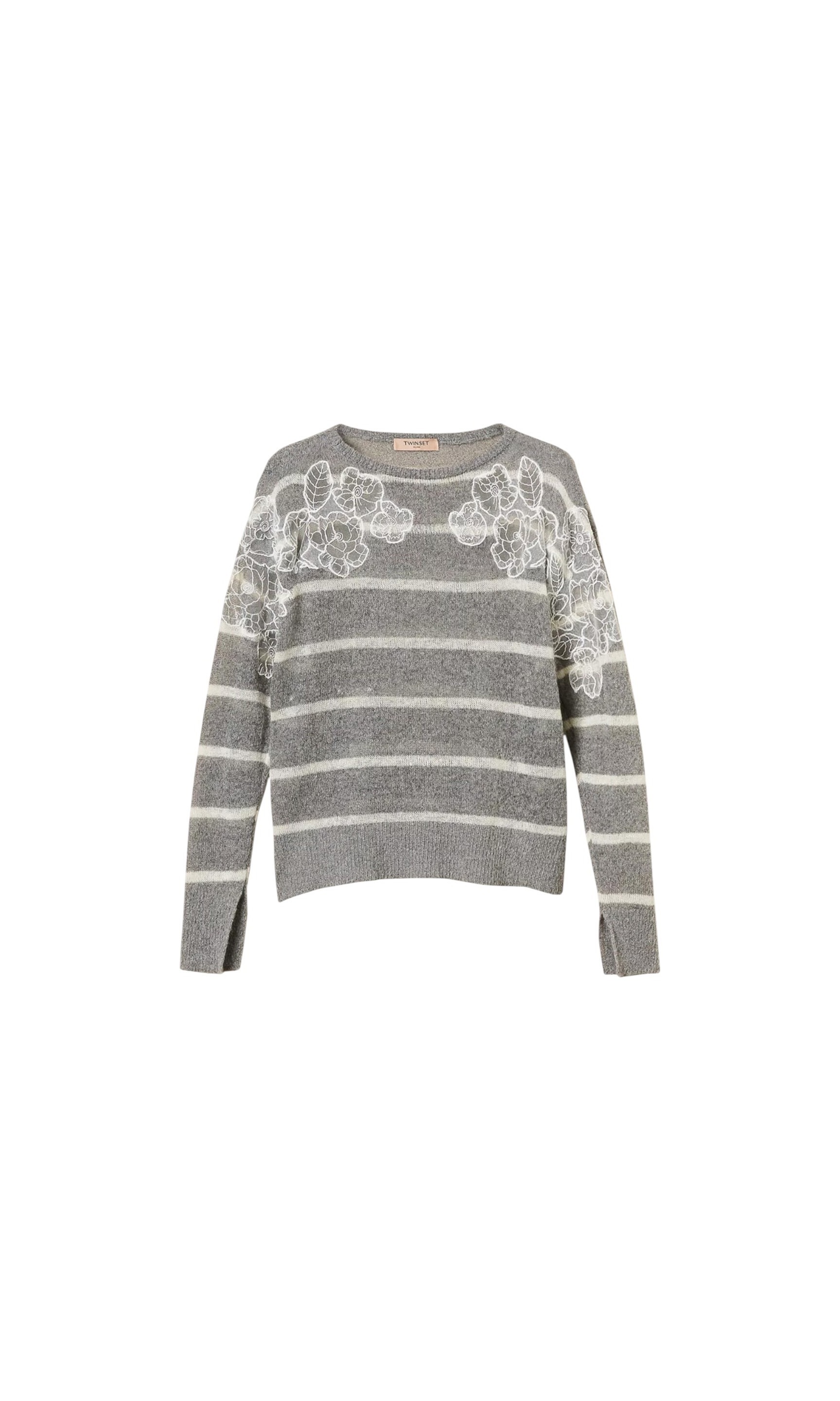 Свитер в полоску свободного силуэта из приятной к телу ткани с добавлением мохера украсили изящным кружевом.