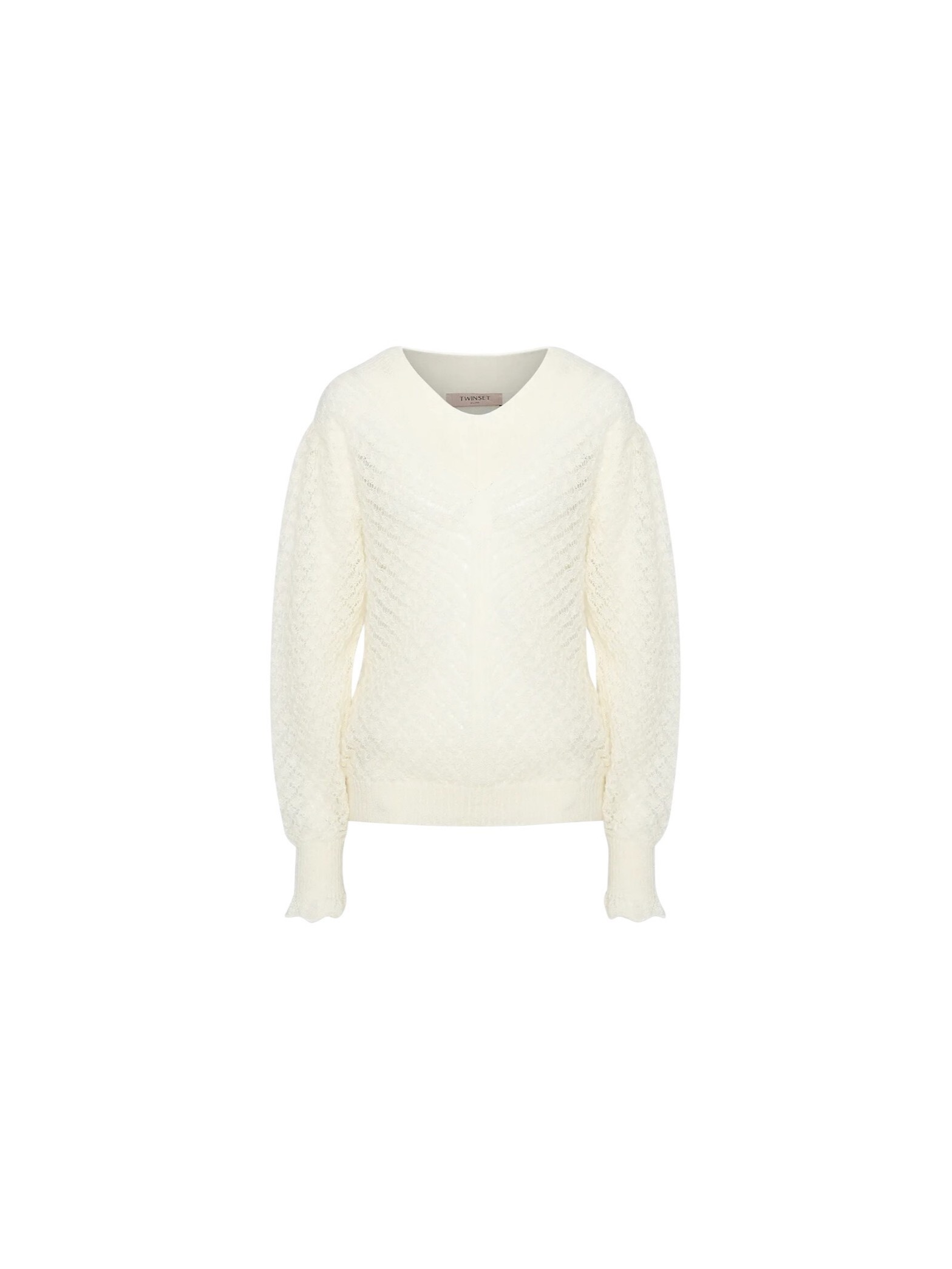Ажурный джемпер свободного силуэта из комбинации мягкого мохера и прочного полиамида со спущенной линией плеч и широкими рукавами-фонариками отделан эластичной вязкой по краям. Изделие дополнили манжетами, которые оформлены фестонами в тон.