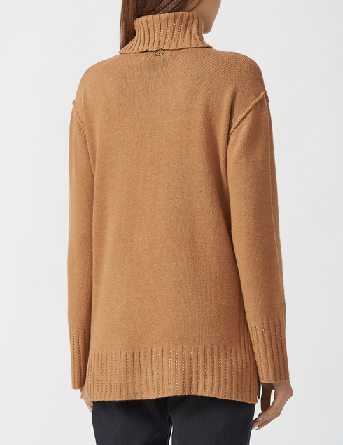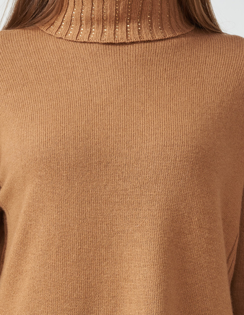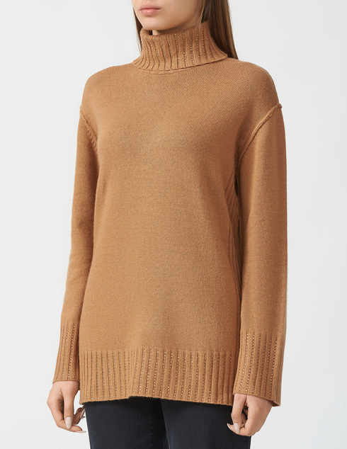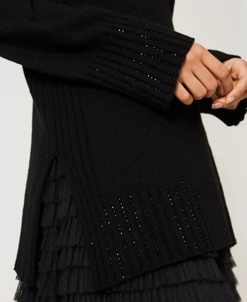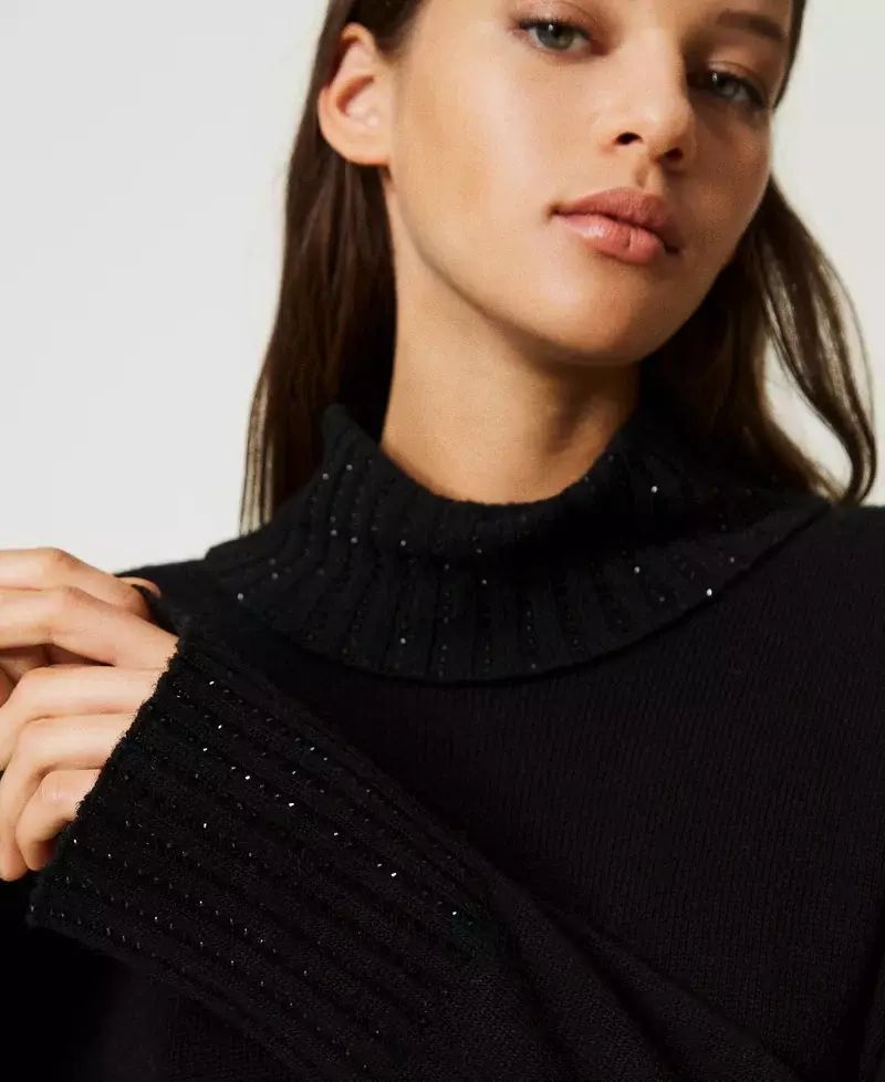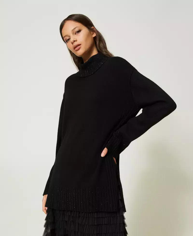 Джемпер макси из смесовой шерсти с ребристой отделкой и аппликациями из стразов, водолазка, свободный крой, приспущенные плечи.