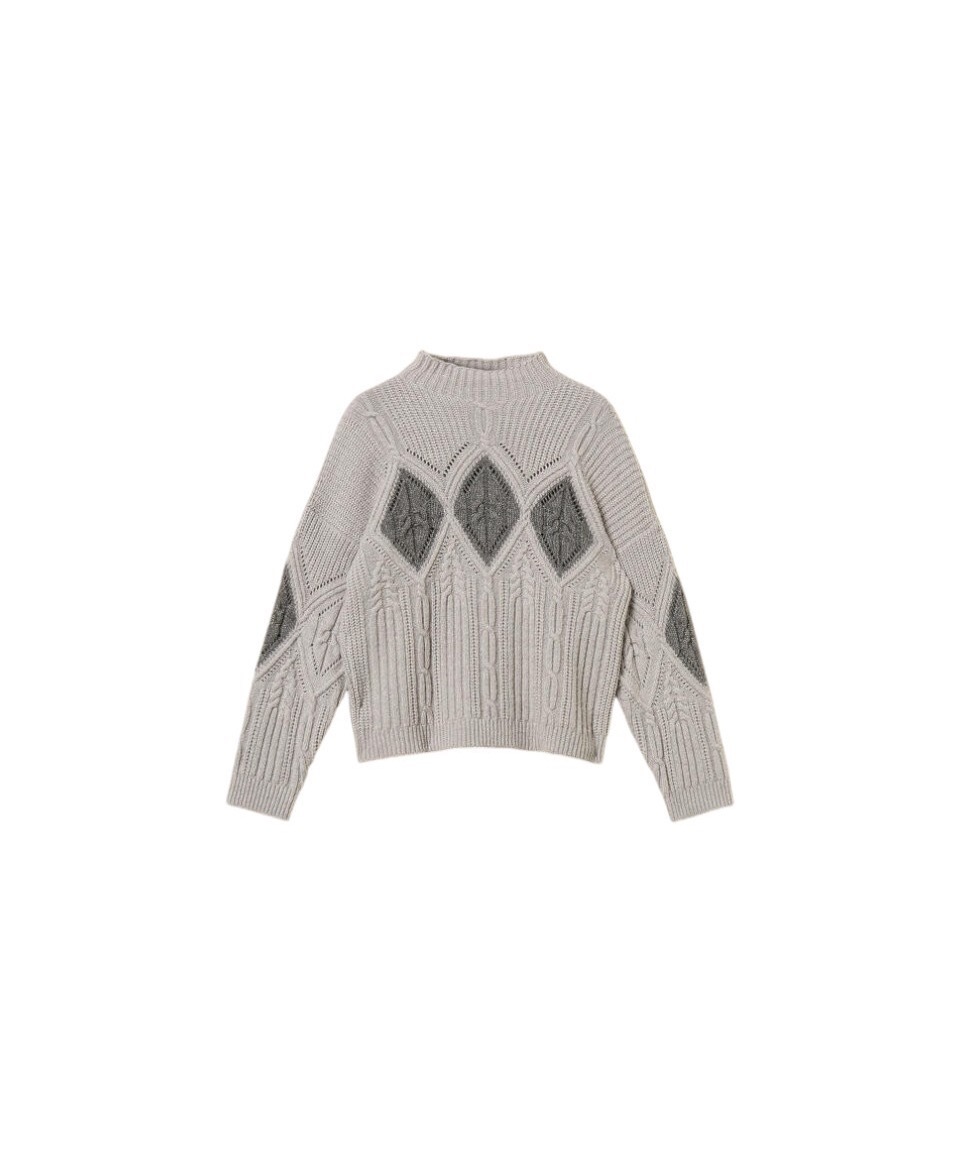Свитер фактурной вязки свободного силуэта с высоким воротником дополнен логотипом бренда на спине. Такое изделие будет прекрасно смотреться как с джинсами, так и с элегантными юбками.
