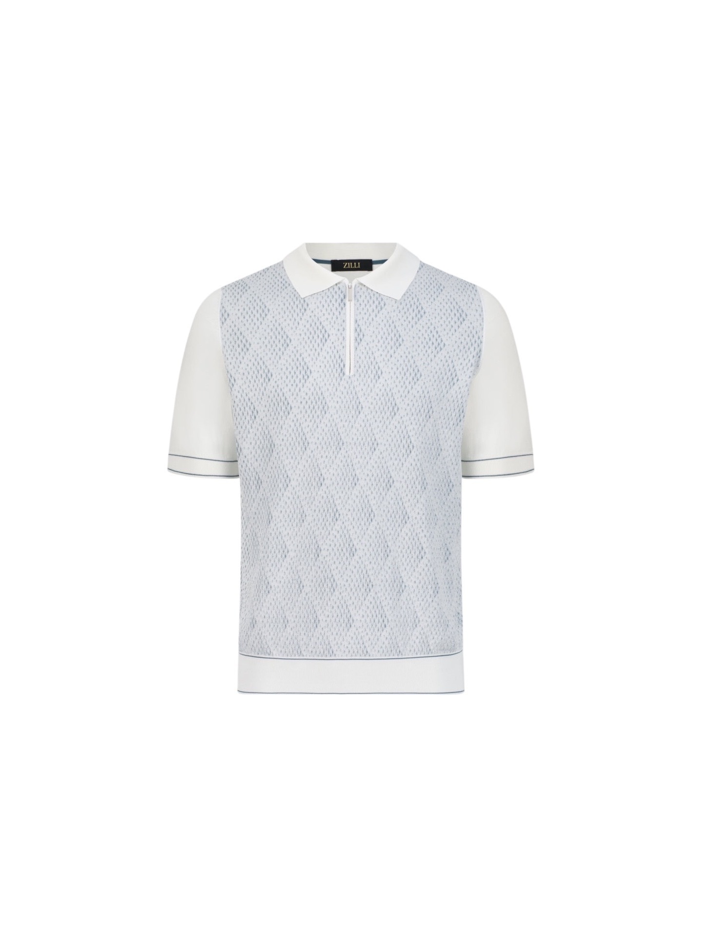 Поло на молнии изготовили из трикотажа на основе шелка и хлопка. Спереди вывязали геометрический орнамент, а манжеты и пояс выполнили в мелкий рубчик.