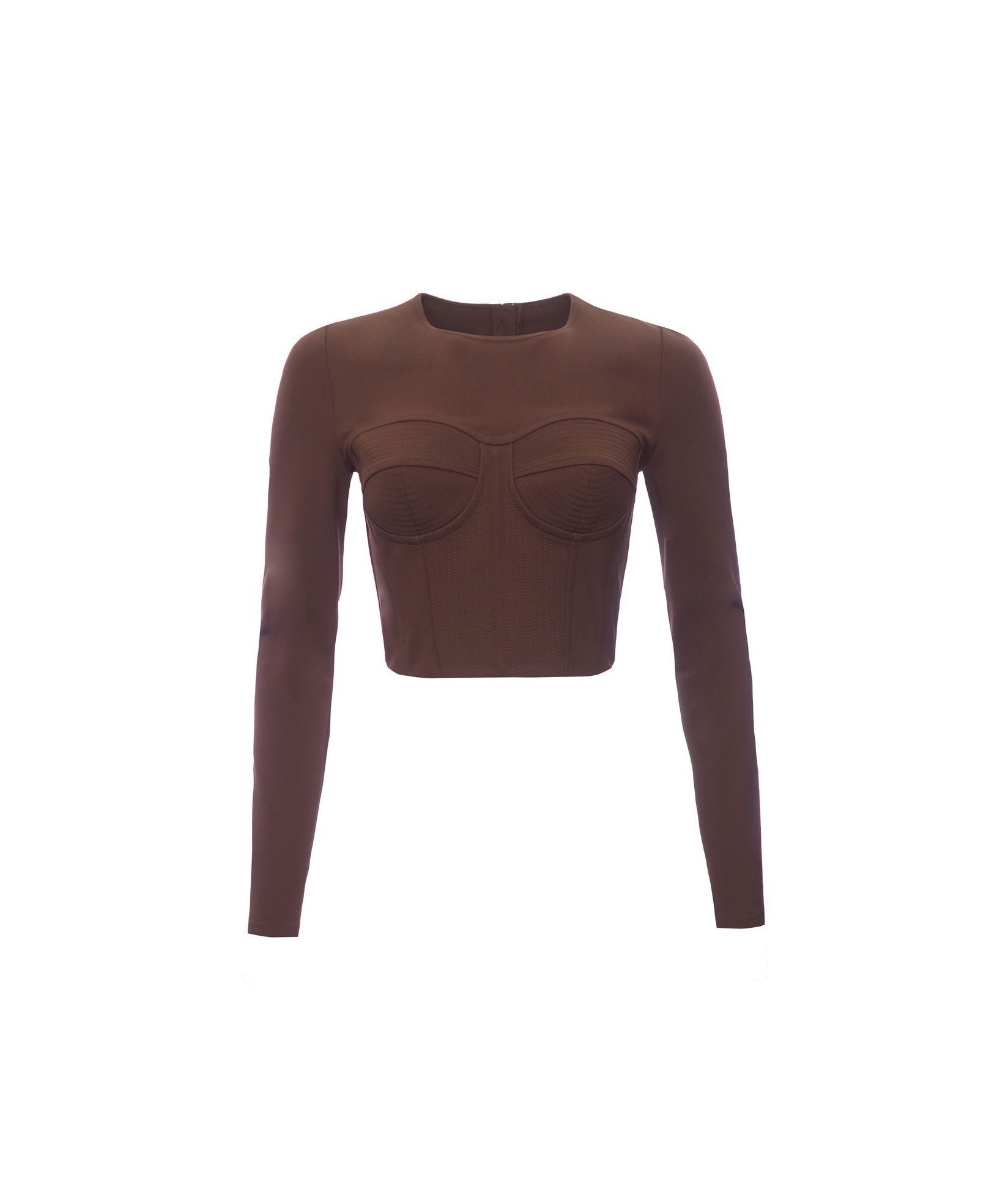 Топ приталенного силуэта из эластичного трикотажа с круглым вырезом, потайной молнией и застежкой на крючок сзади.