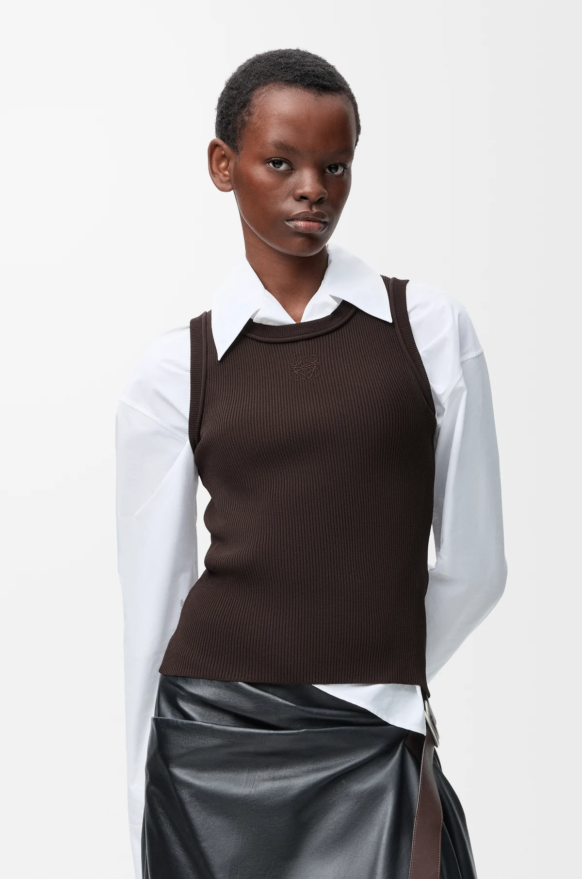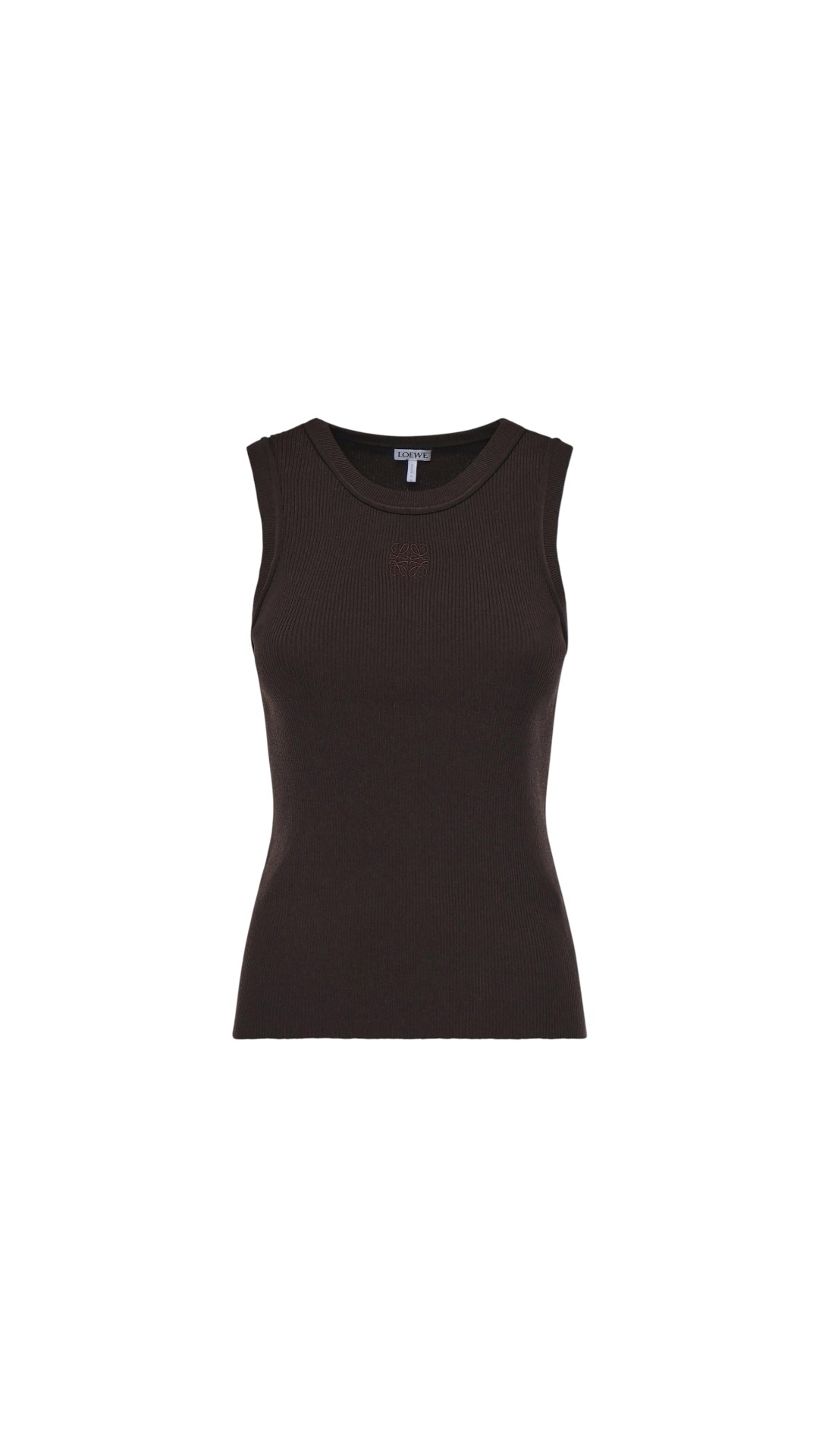 Топ в рубчик приталенного силуэта с круглым вырезом дополнен спереди логотипом бренда в тон.