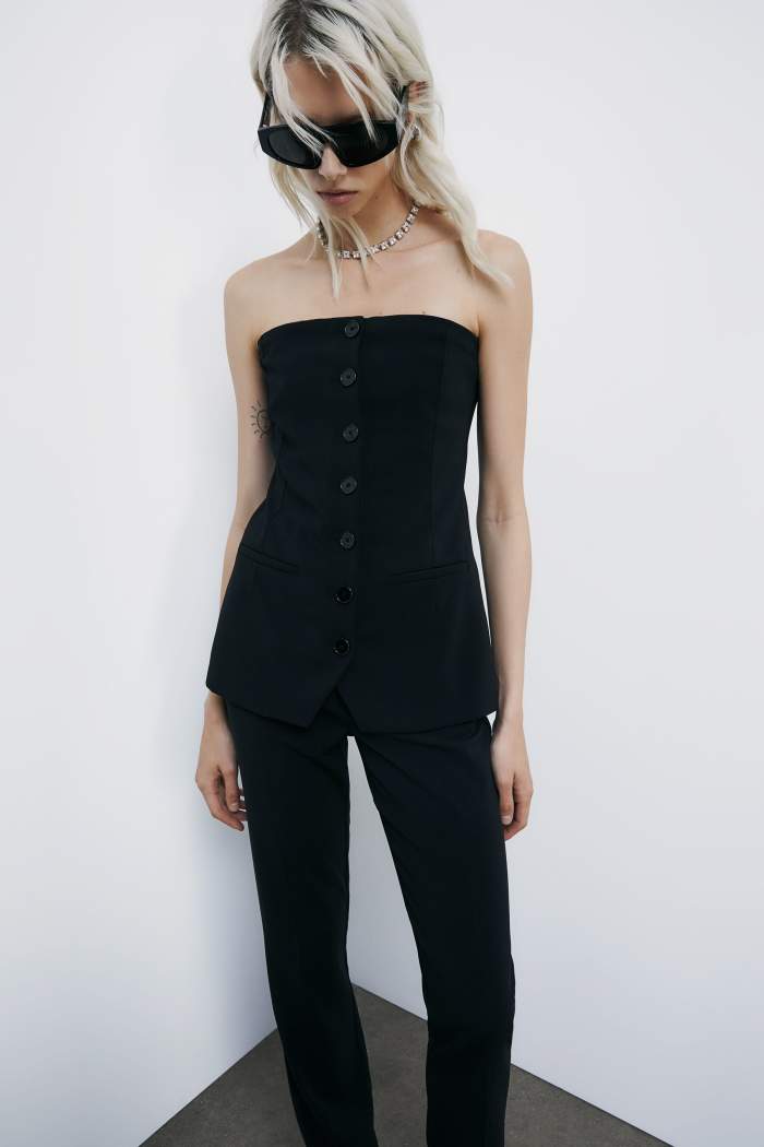 Эффектный топ-бюстье прилегающего силуэта дополнили декоративными прорезными карманами и фирменной металлической эмблемой бренда сзади.