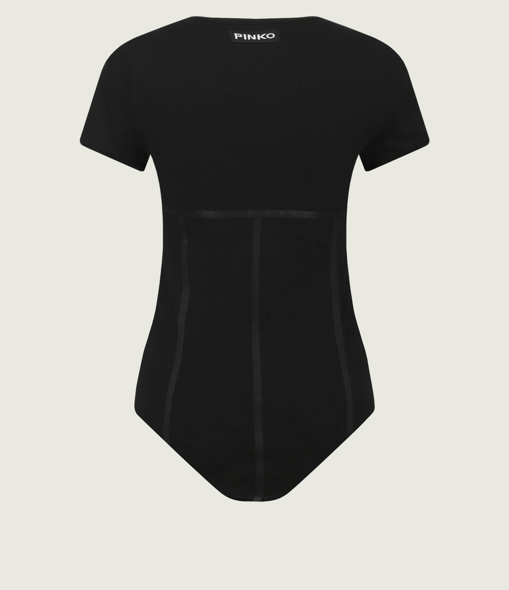 Эффектное боди прилегающего силуэта с круглым вырезом и короткими рукавами дополнено сзади фирменным патчем с логотипом бренда.