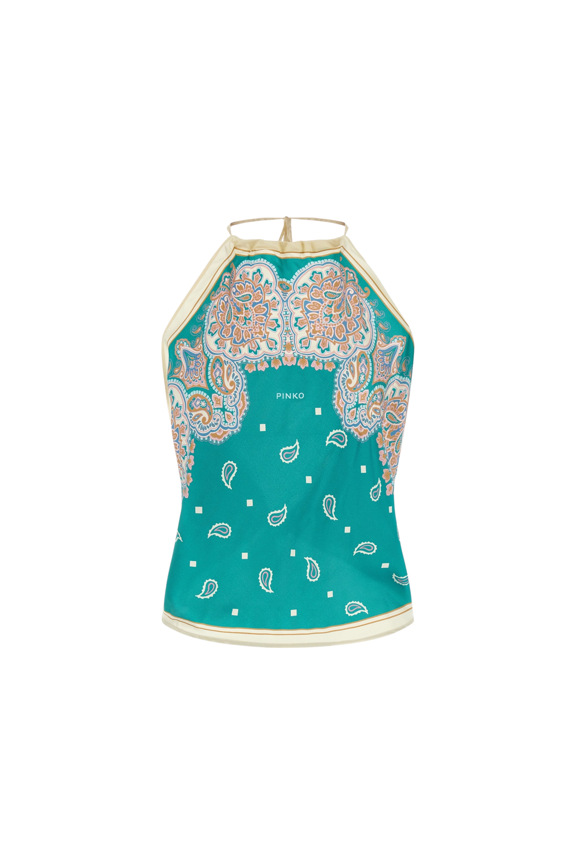 Укороченный топ приталенного силуэта с открытой спиной, эффектными завязками на шее и спине спереди дополнен фирменным логотипом бренда.