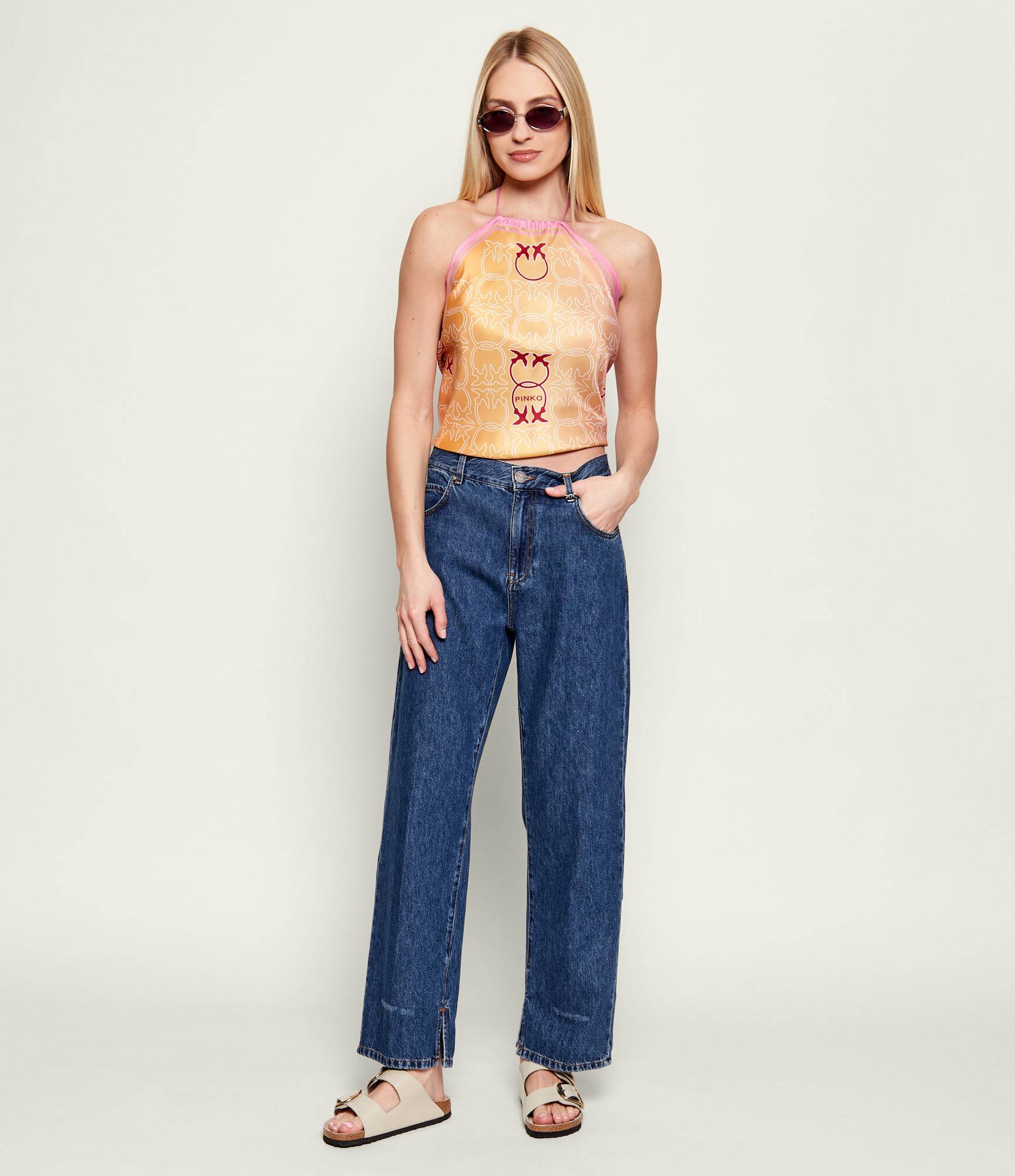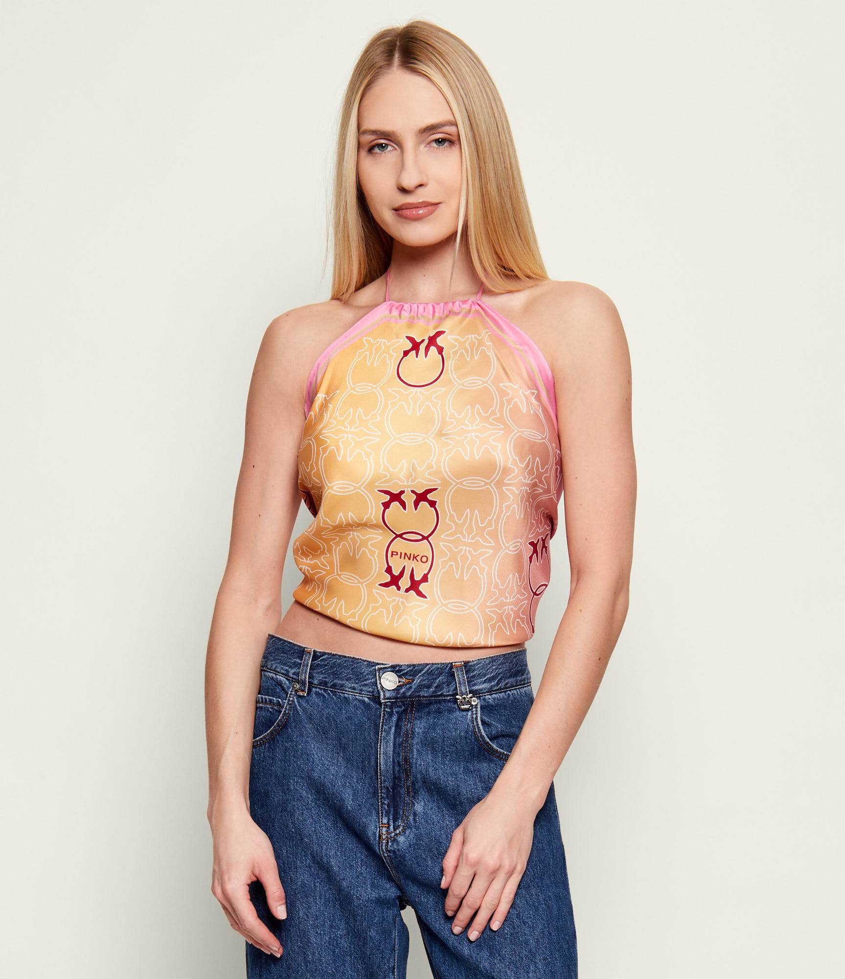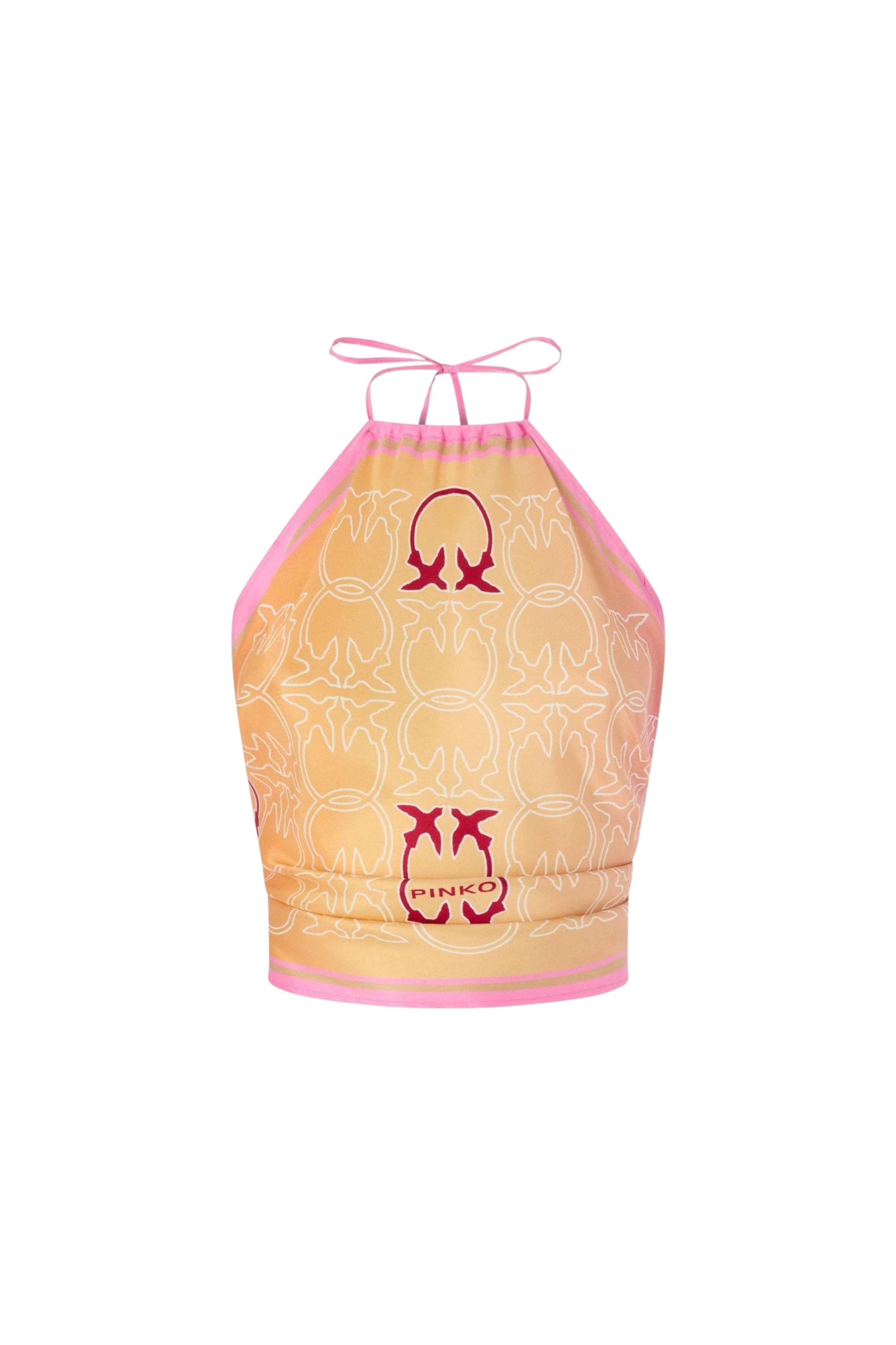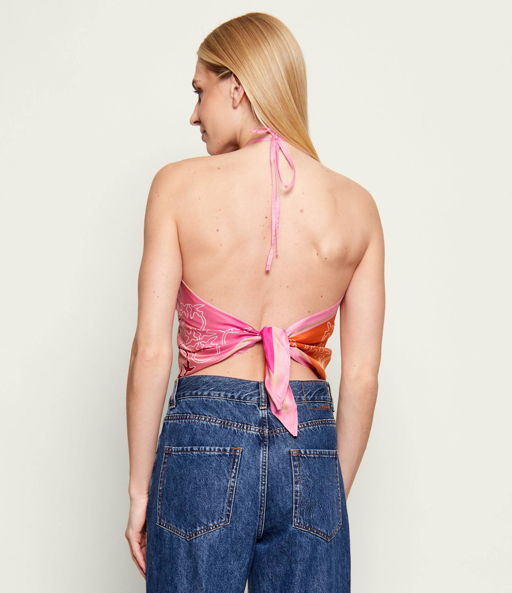 Укороченный топ приталенного силуэта с эффектными завязками на шее и спине спереди дополнен фирменным логотипом бренда.