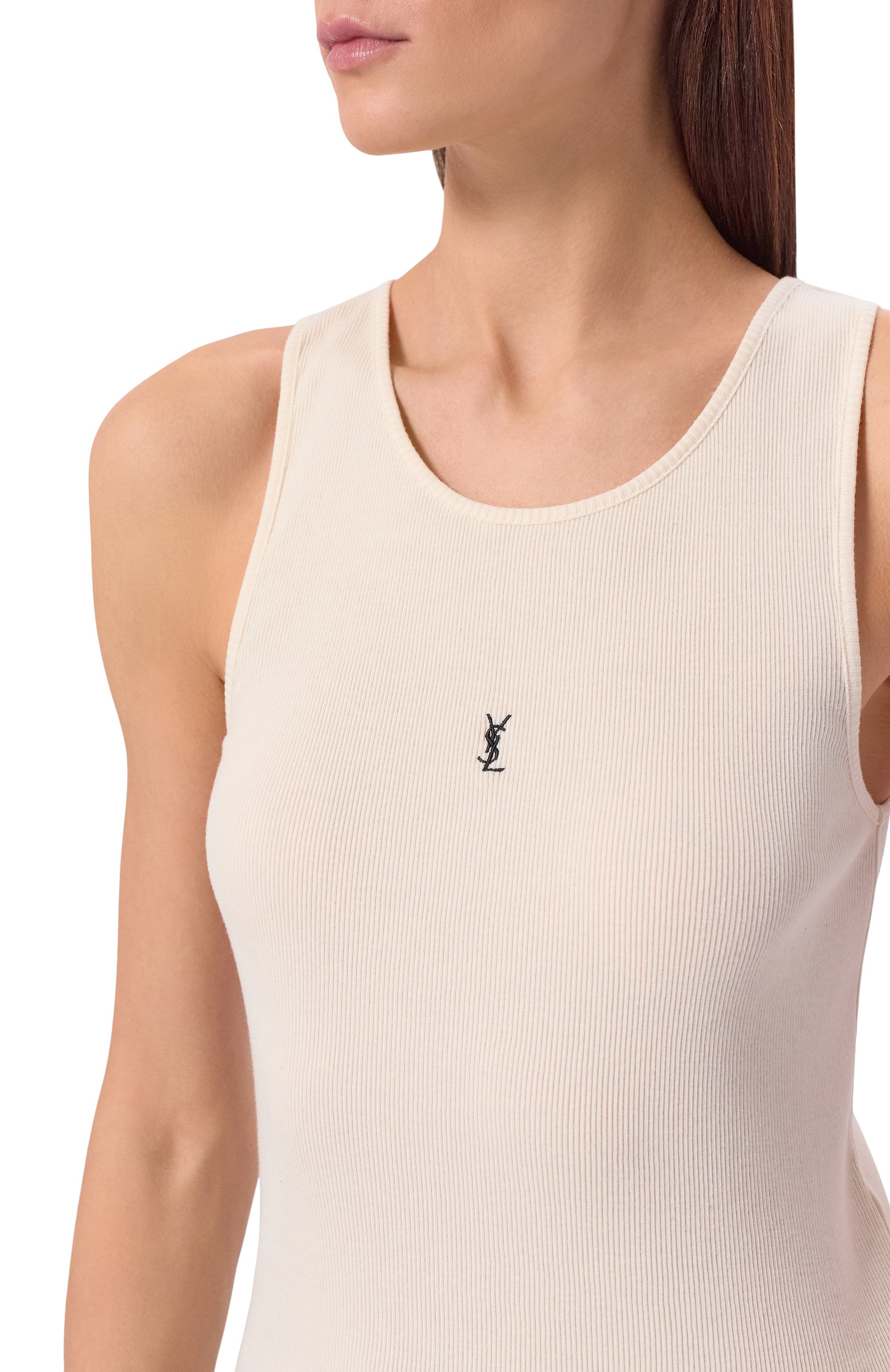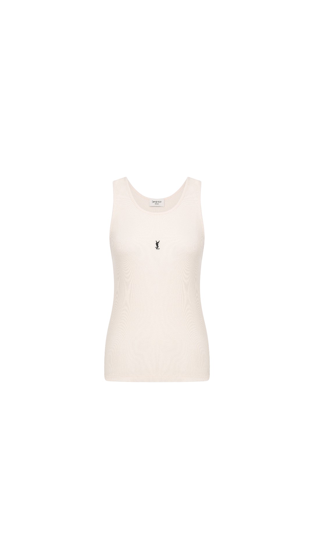 Майка с глубокими проймами из хлопкового трикотажа в рубчик облегающего кроя декорирована контрастной вышитой монограммой Кассандра.