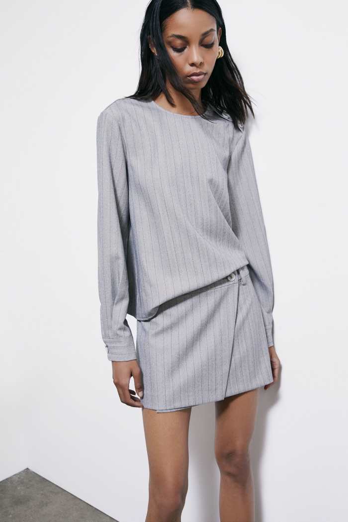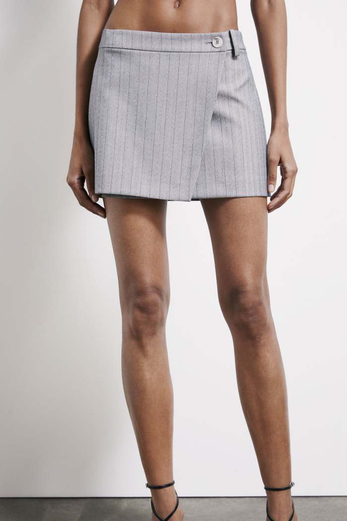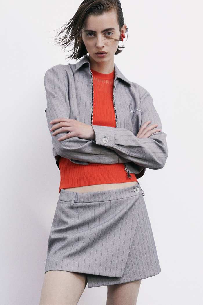 Эффектная юбка длины мини в полоску дополнена шлевками для ремня и украшена сзади фирменным металлическим логотипом бренда.