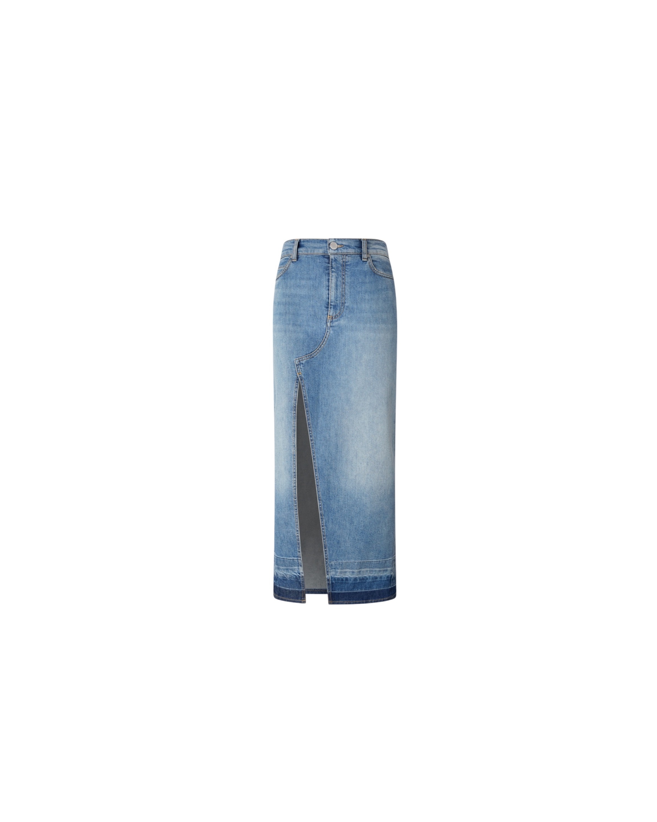 Юбка из хлопкового денима прямого кроя со стандартной посадкой, застежкой на молнию и пуговицу дополнена прорезными и накладными карманами, высоким передним разрезом и украшена фирменной нашивкой с логотипом бренда и темным нижним краем, окрашенным в технике Tie&Dye для создания эффекта деграде.