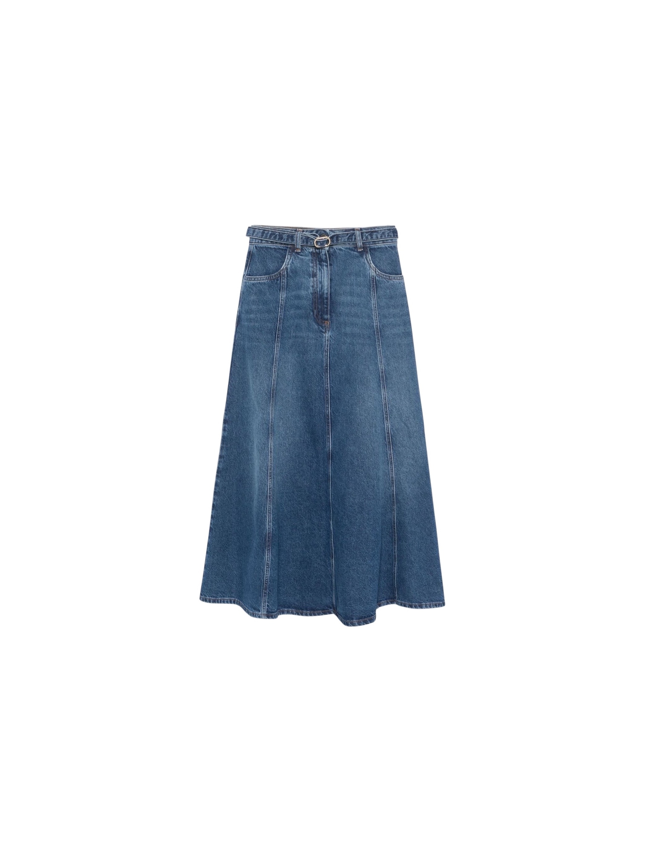 Элегантная юбка расклешенного кроя из натурального хлопка дополнена поясом в тон с пряжкой в форме логотипа бренда, карманами и потайной молнией.