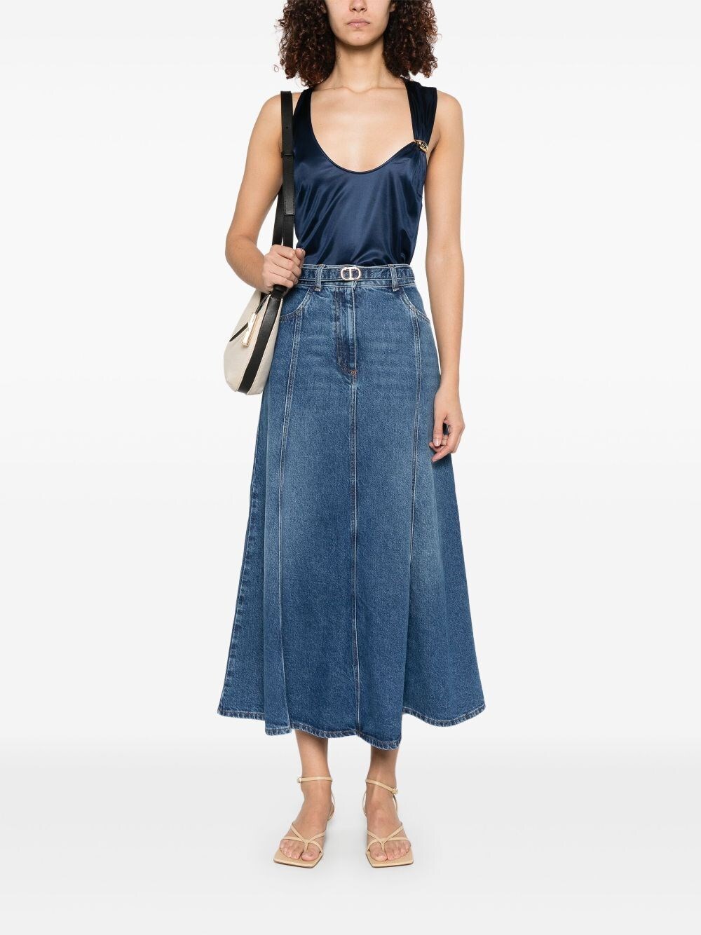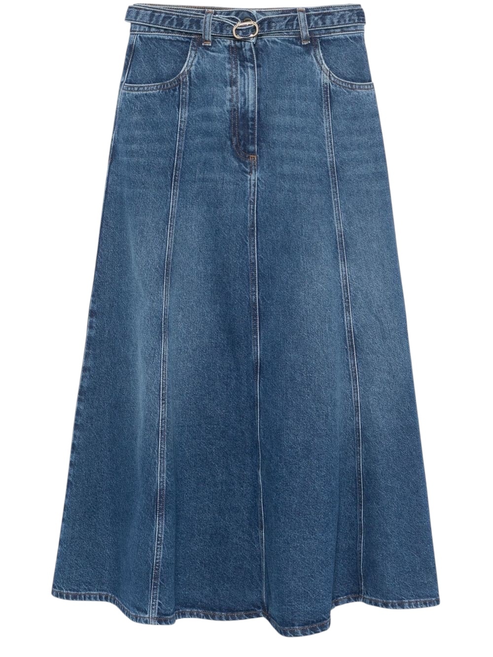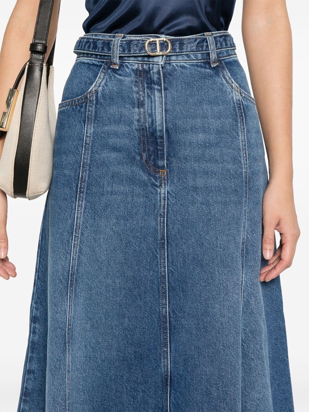 Джинсовая юбка миди из хлопковой джинсовой ткани.Модель украшена поясом с металлической пряжкой с логотипом Oval T. Изделие сочетается практически со всеми предметами гардероба.