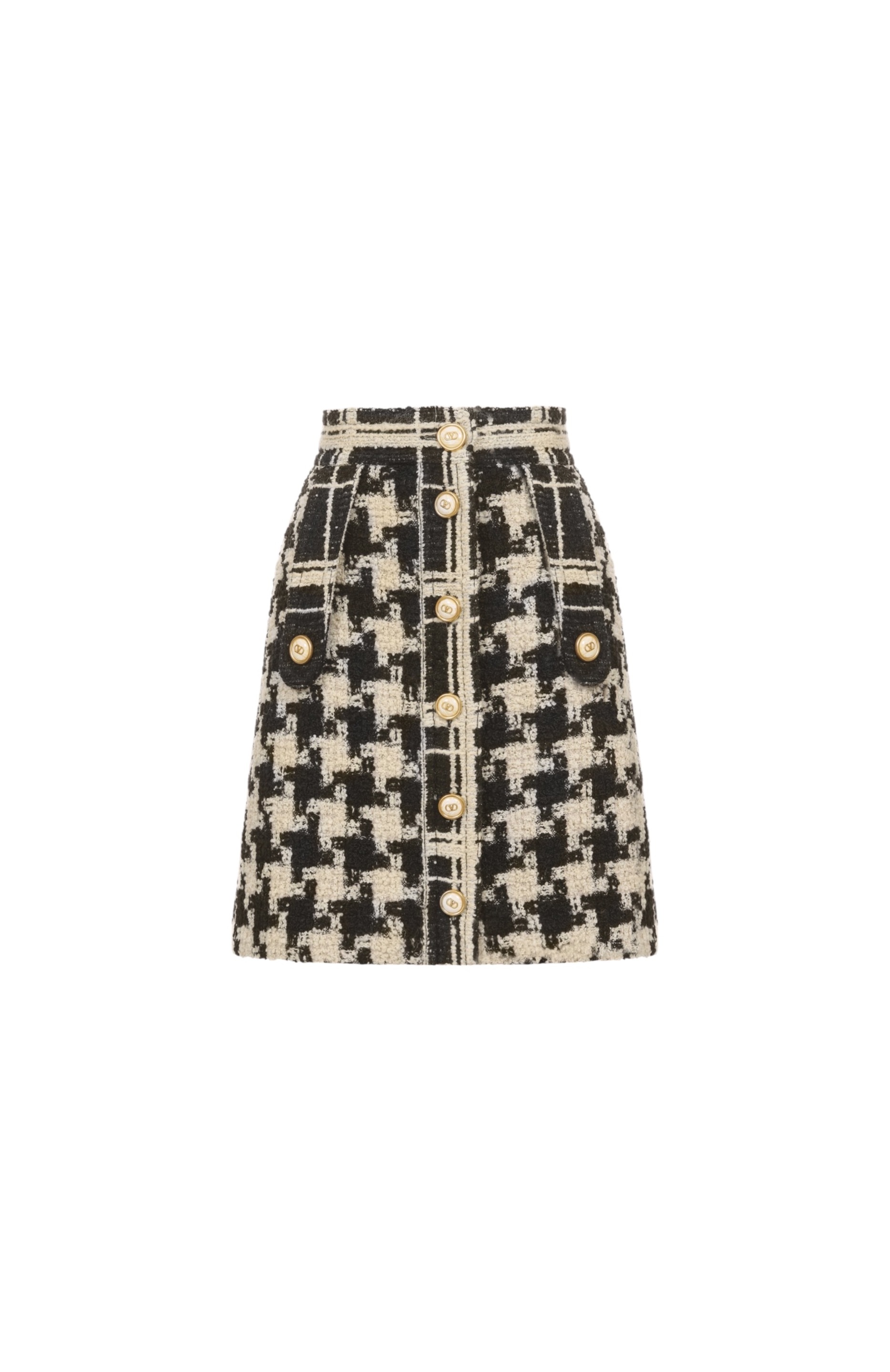 Мини-юбку с удлиненными декоративными патами спереди сшили из шерстяного твида в клетку «пье-де-пуль». Модель застегивается объемными пуговицами с рельефной эмблемой VLogo Signature спереди.
