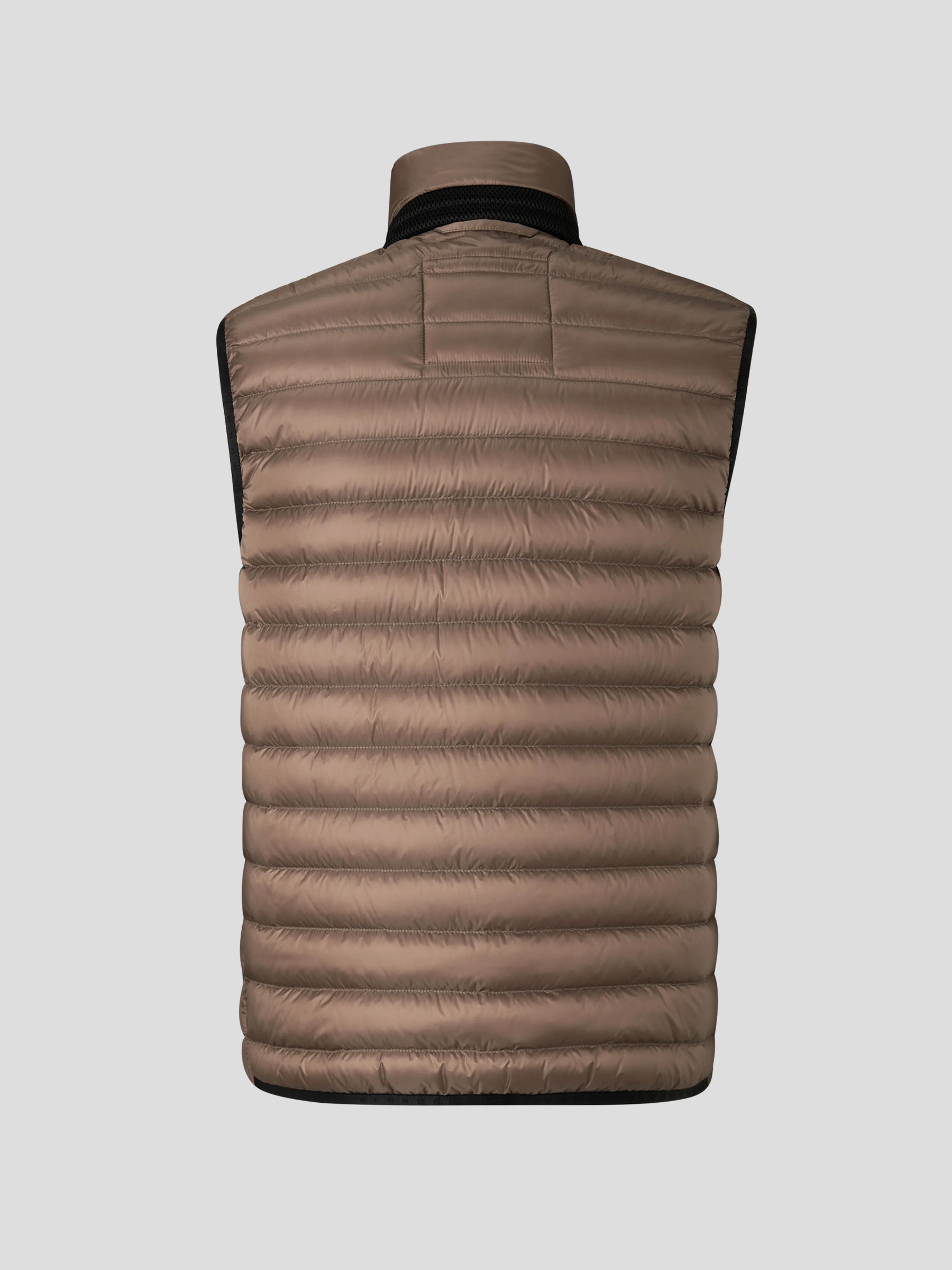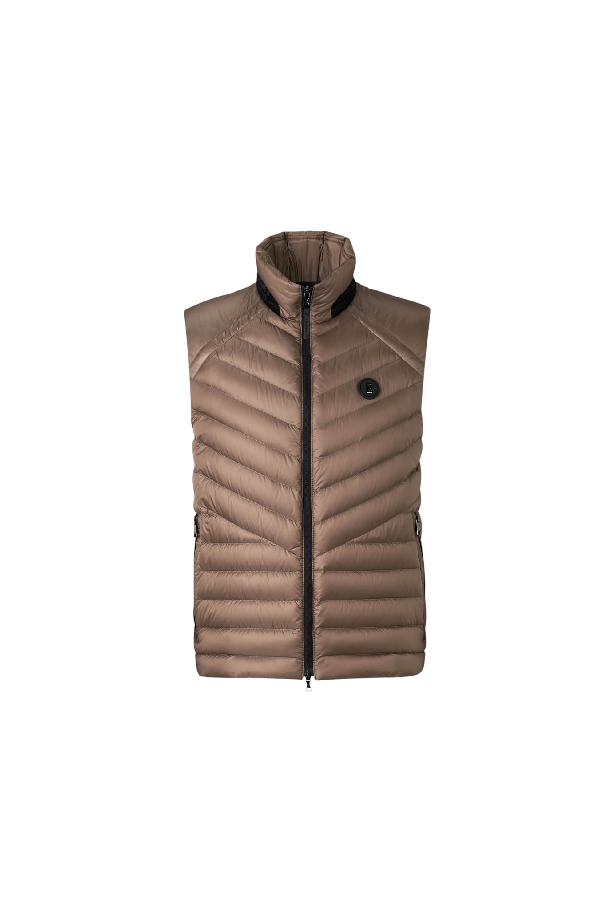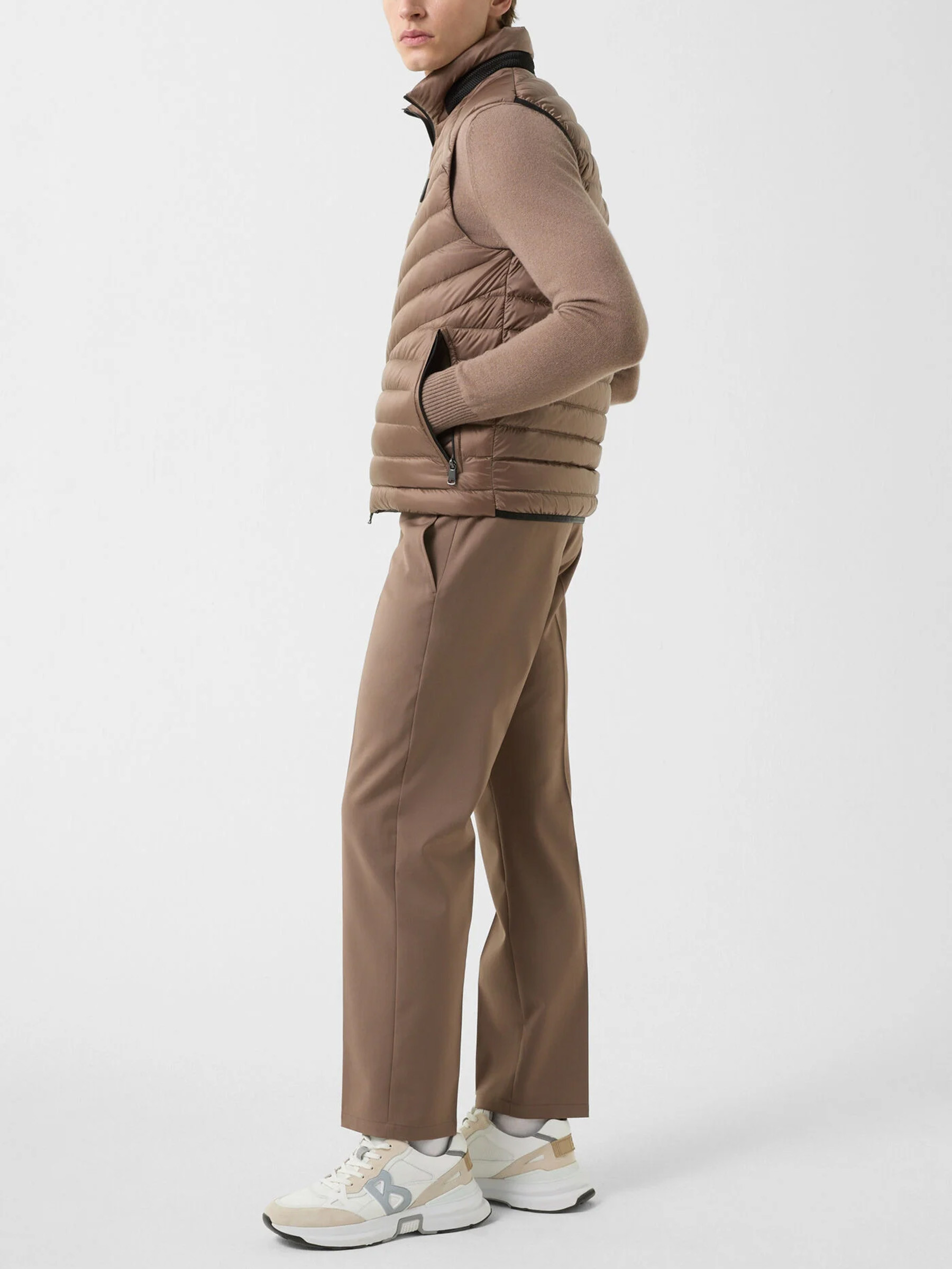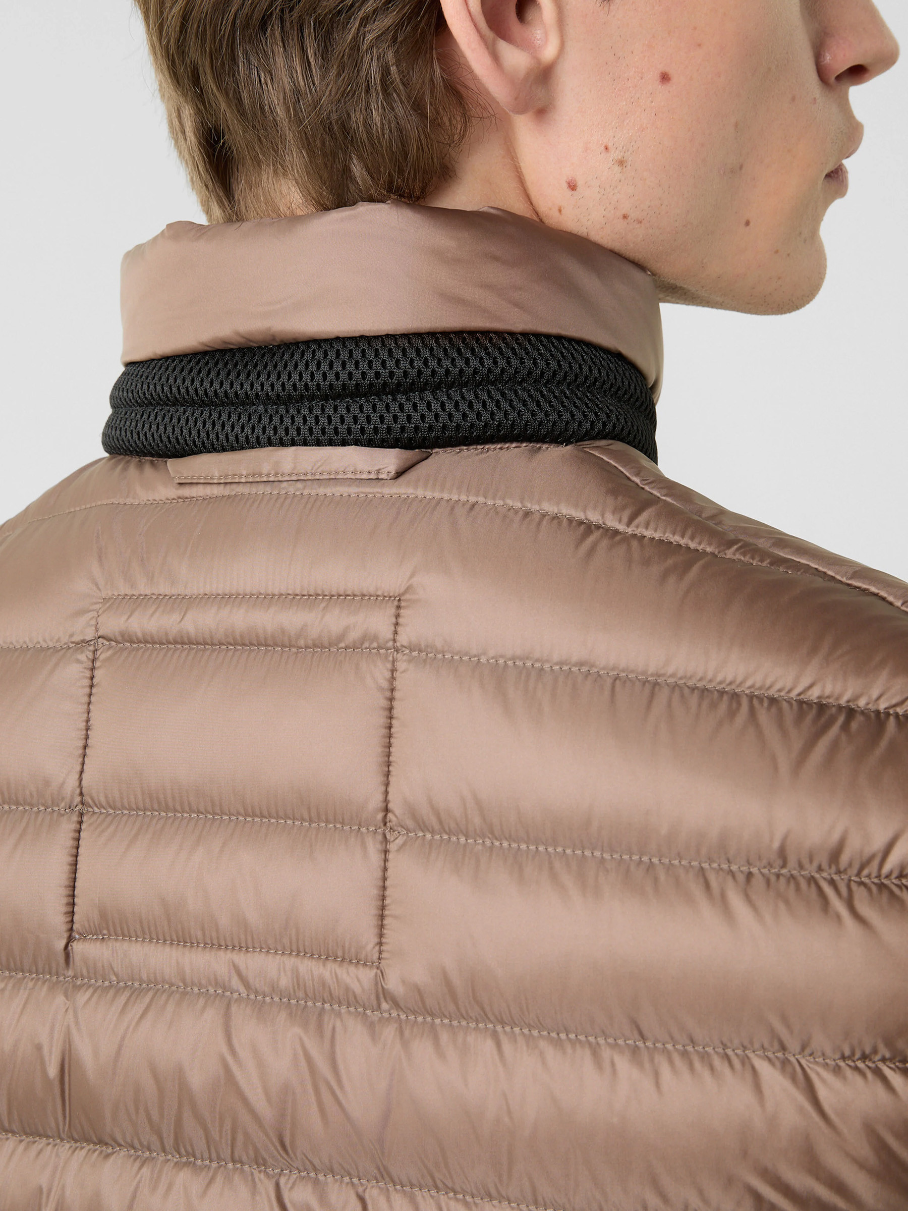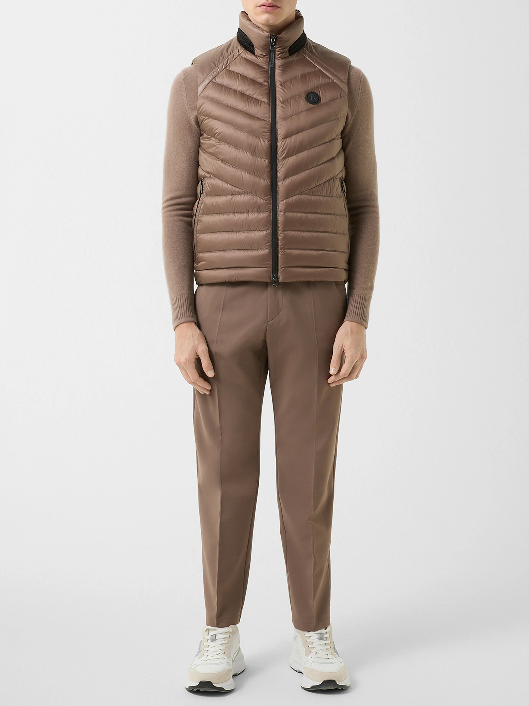 Стеганый жилет с натуральным пуховым наполнителем полуприлегающего силуэта с прорезными карманами на молниях, воротником-стойкой и застежкой на молнию дополнили нашивкой с логотипом бренда на груди. Благодаря стежке наполнитель равномерно распределен внутри изделия и лучше сохраняет тепло.