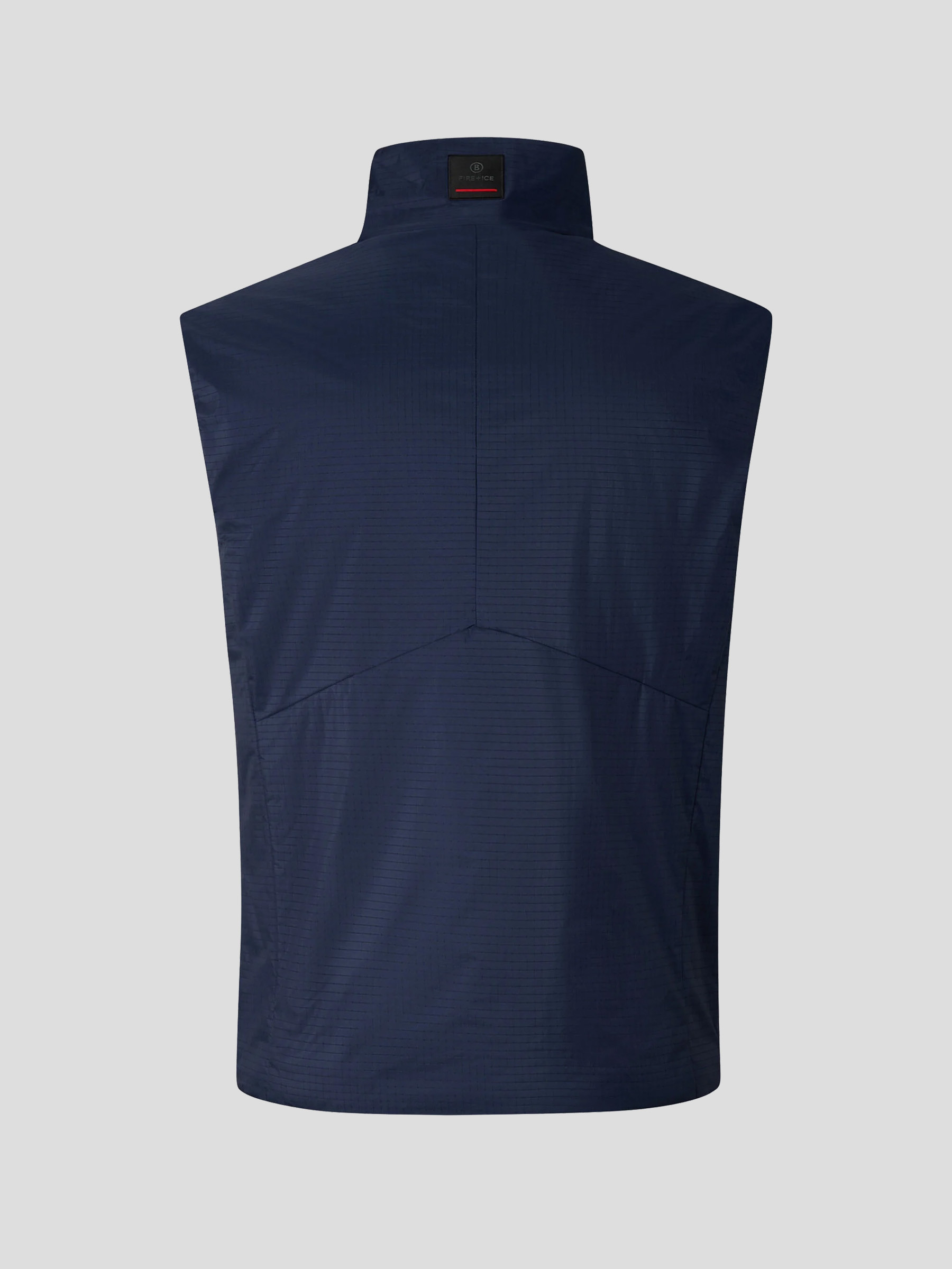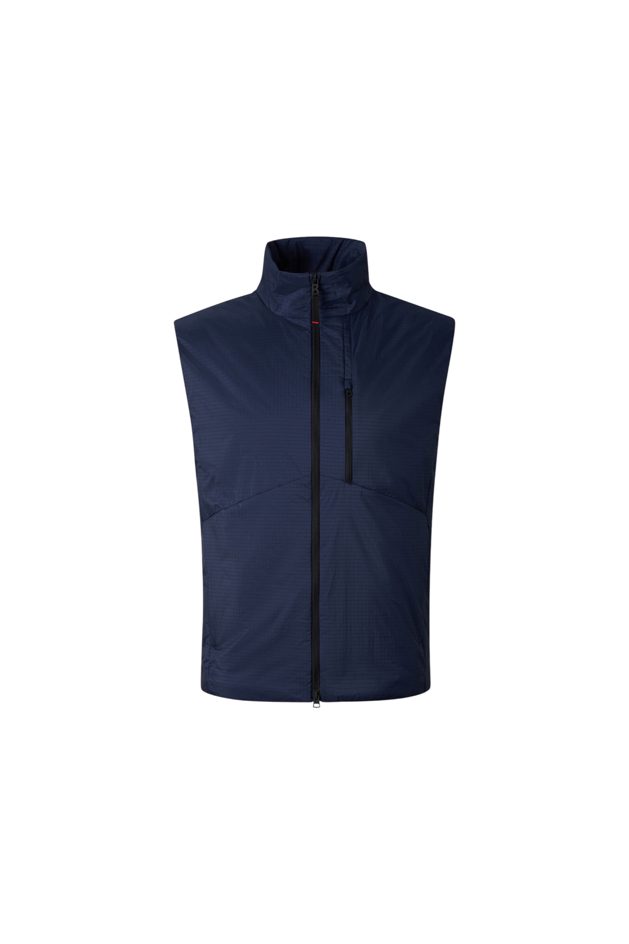 Жилет с застежкой на молнию дополнен воротником-стойкой и одним нагрудным карманом.